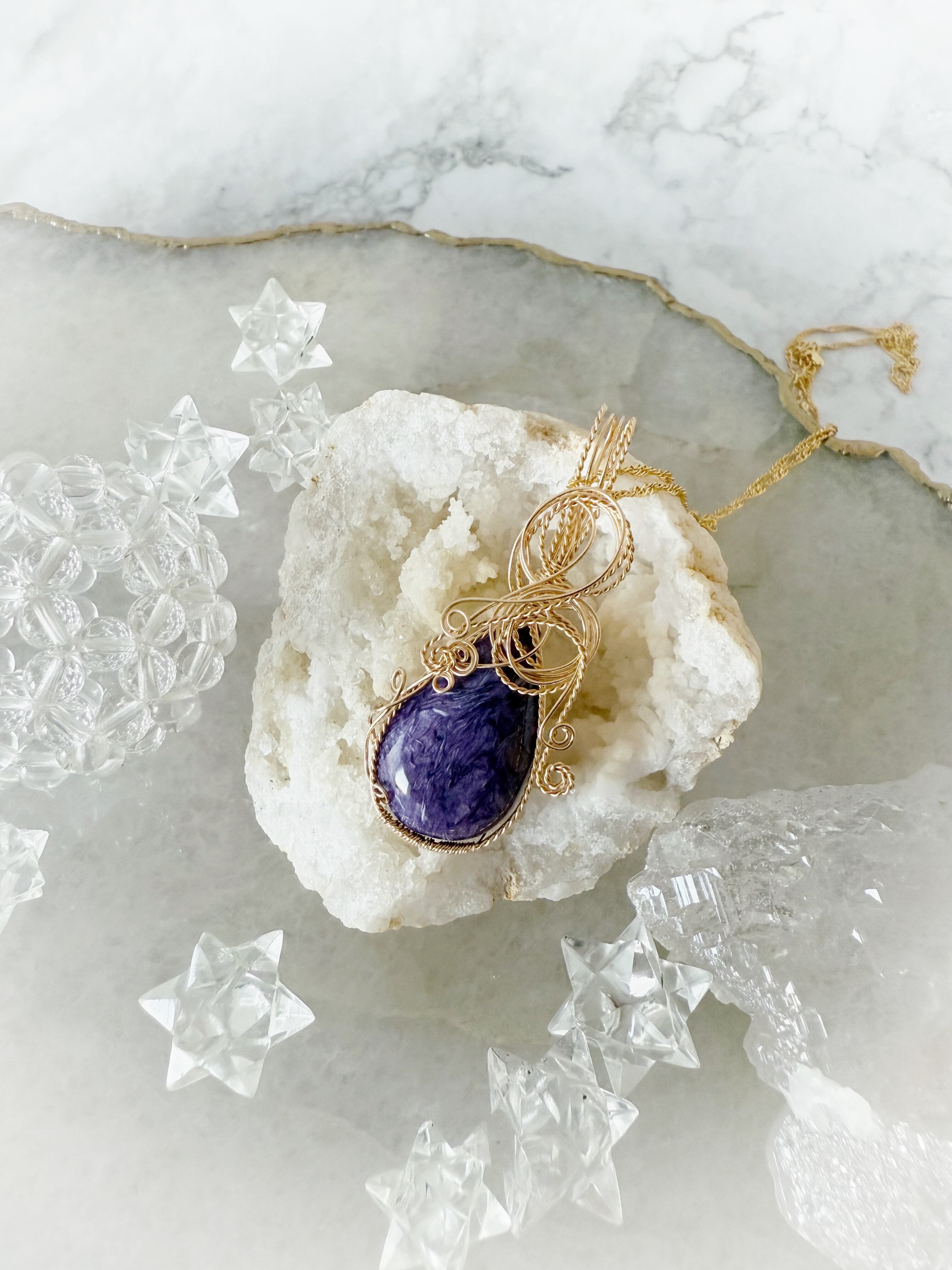 菫色の絵の具を重ねて夜を描いたような美しいチャロアイトのペンダントです。