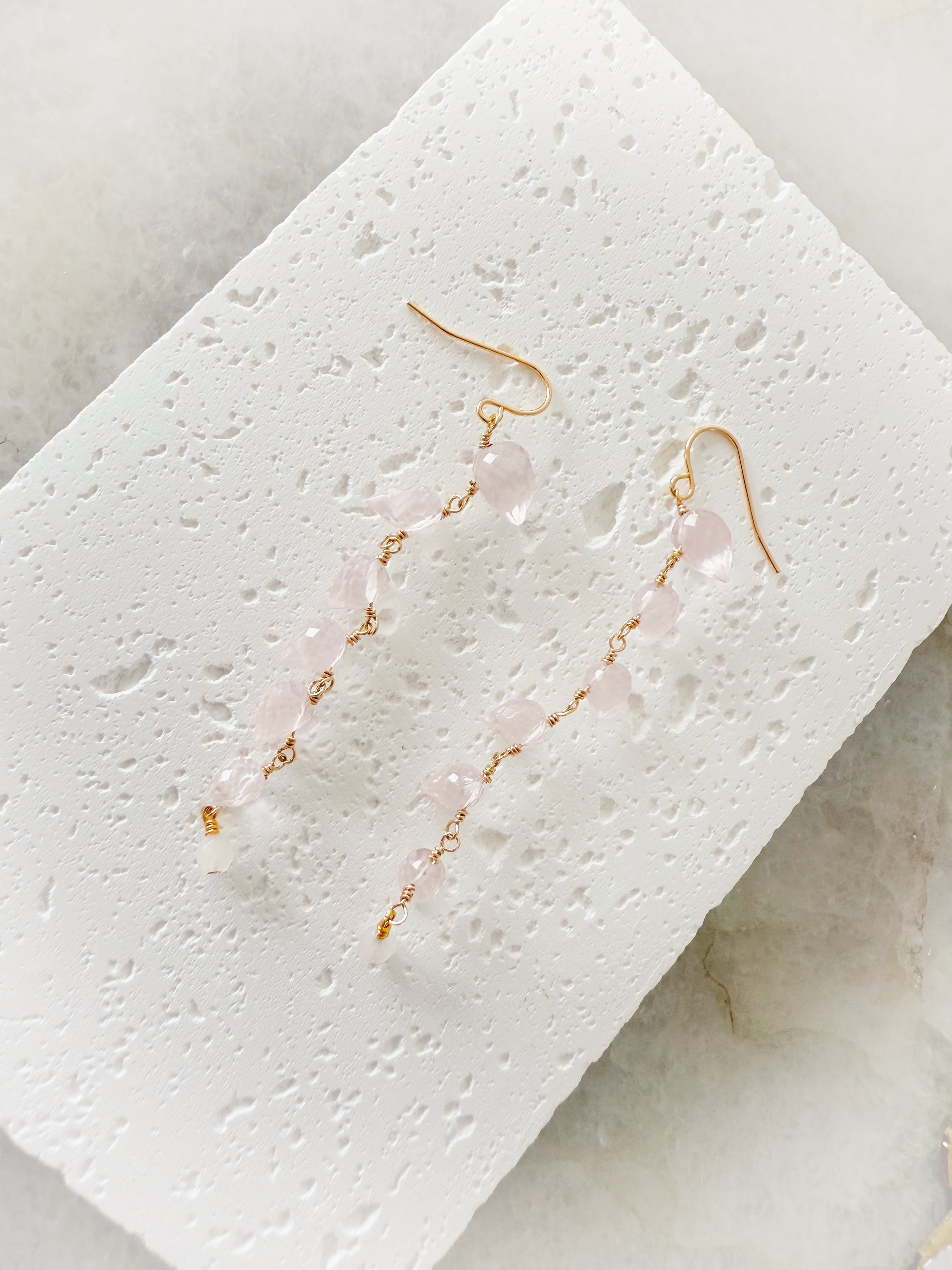 ハートを開く愛の石、バラの蕾が枝垂れるようなローズクォーツのロングピアス単品です。