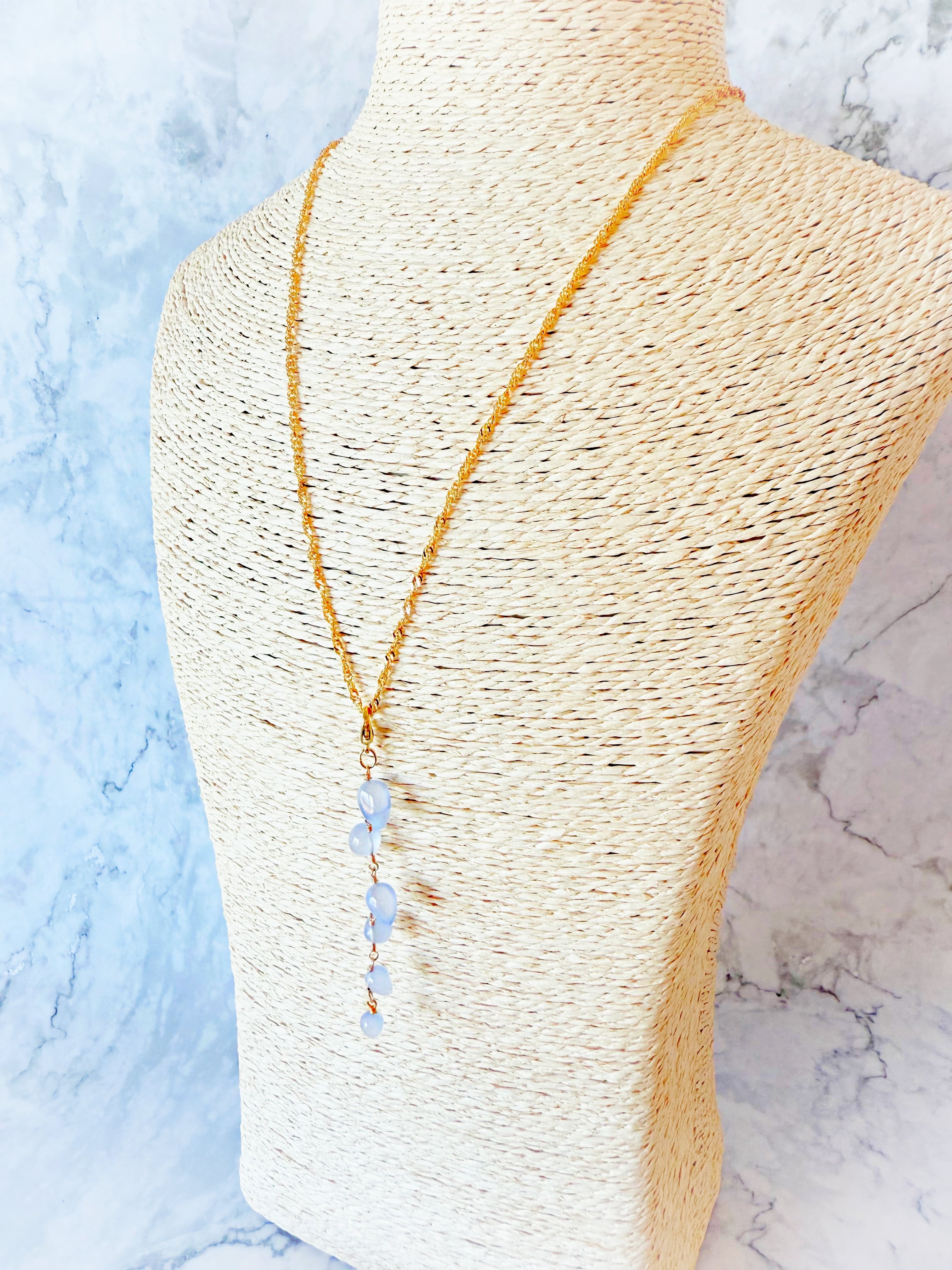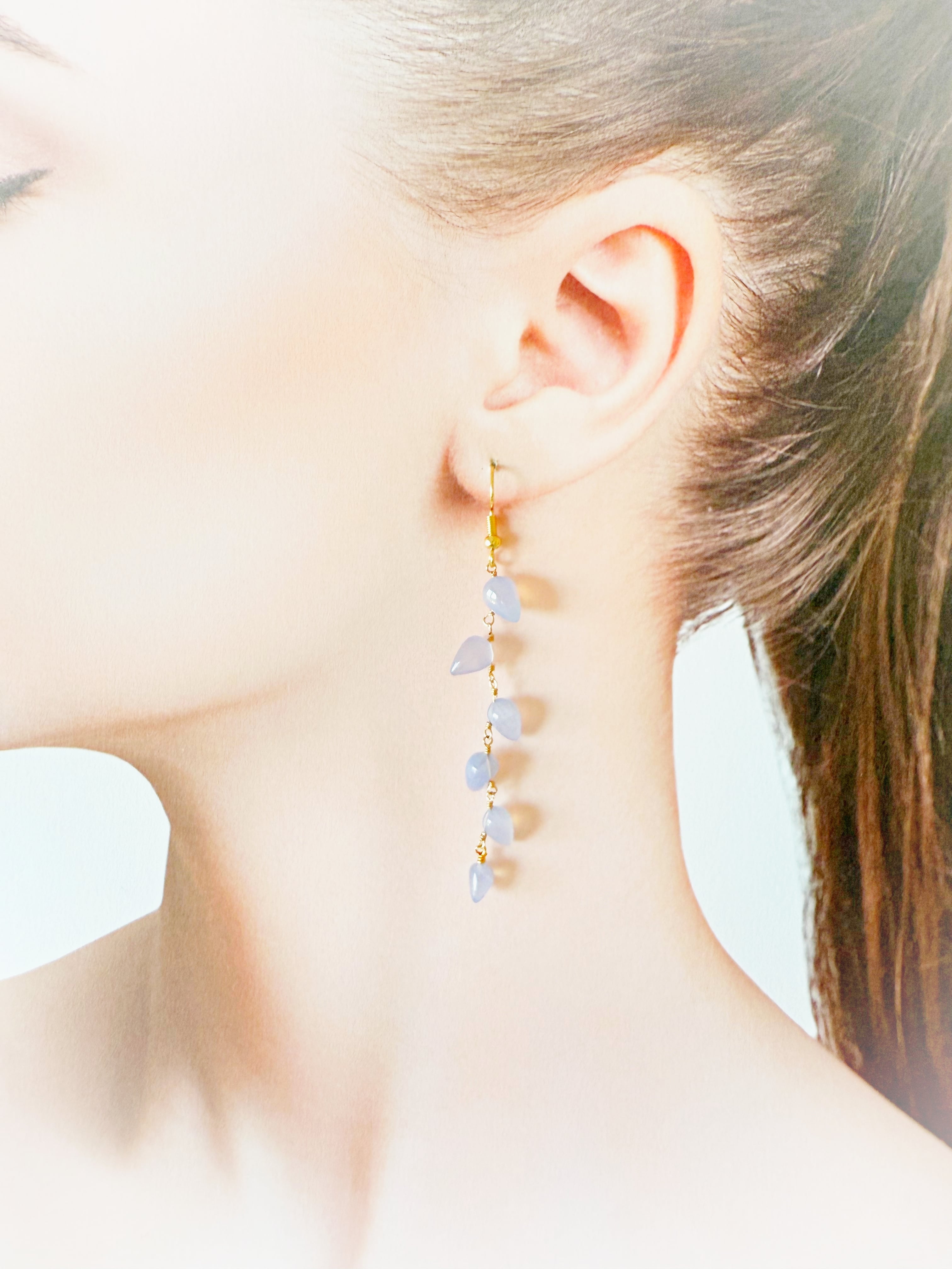 光の当たり方で乳白色にも見え、雫のようで美しいブルーカルセドニーを使用しています。