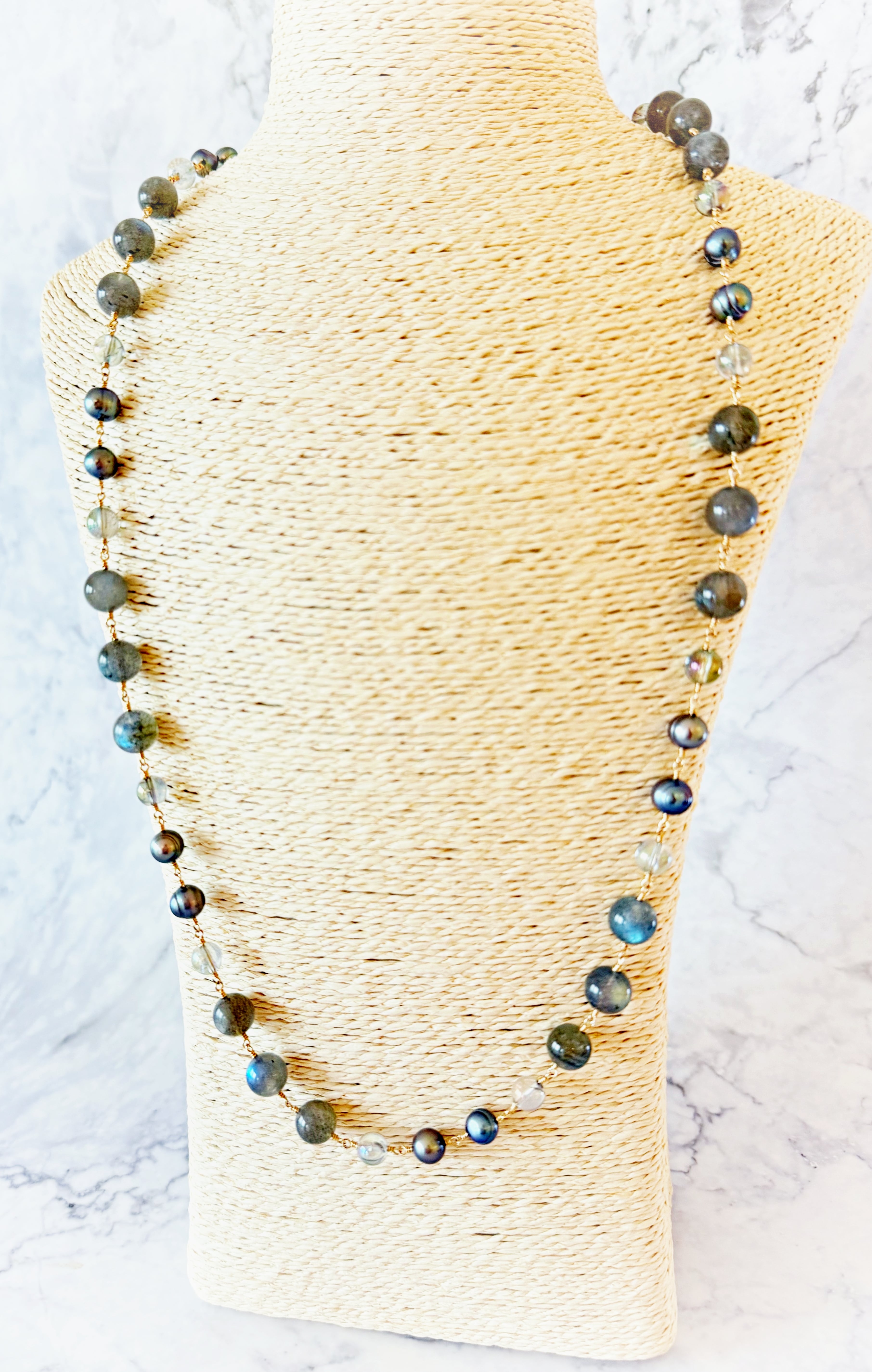 * ネックレス&ピアス:ラブラドライト、クラックオーラクォーツ、天然パール