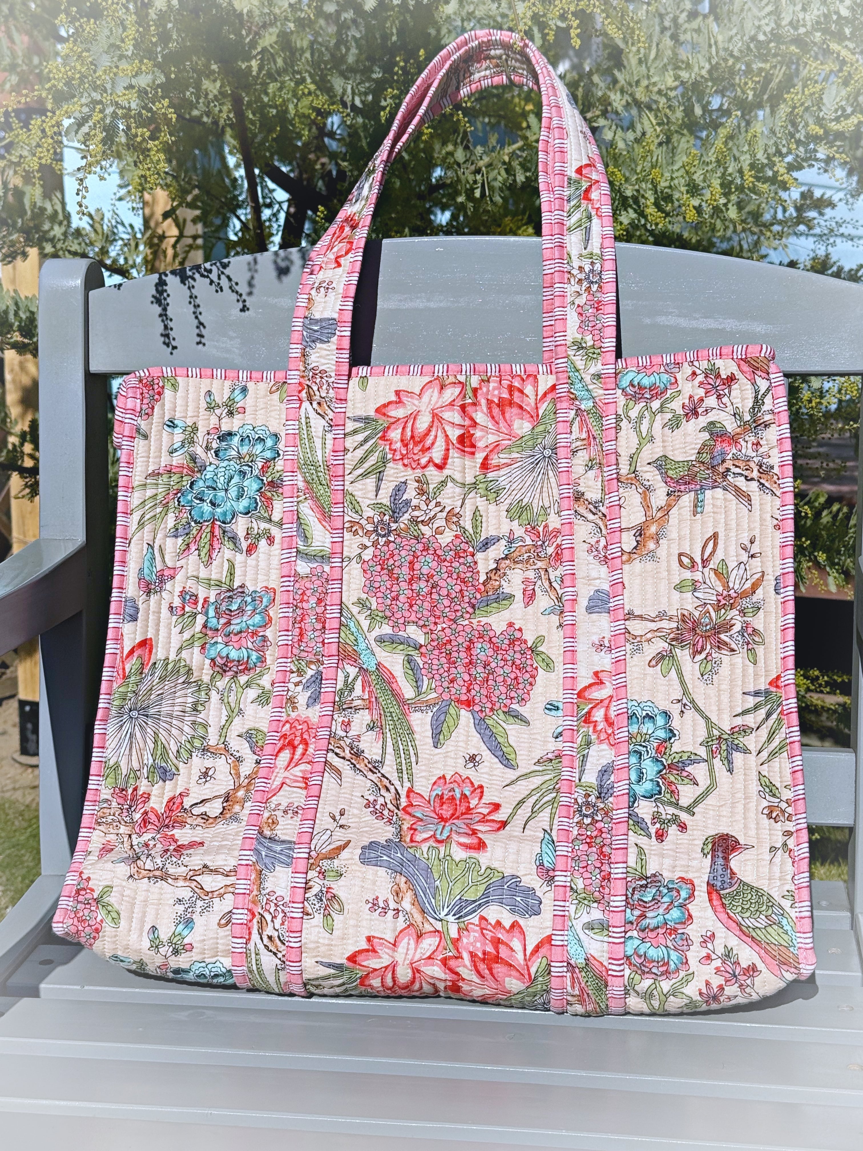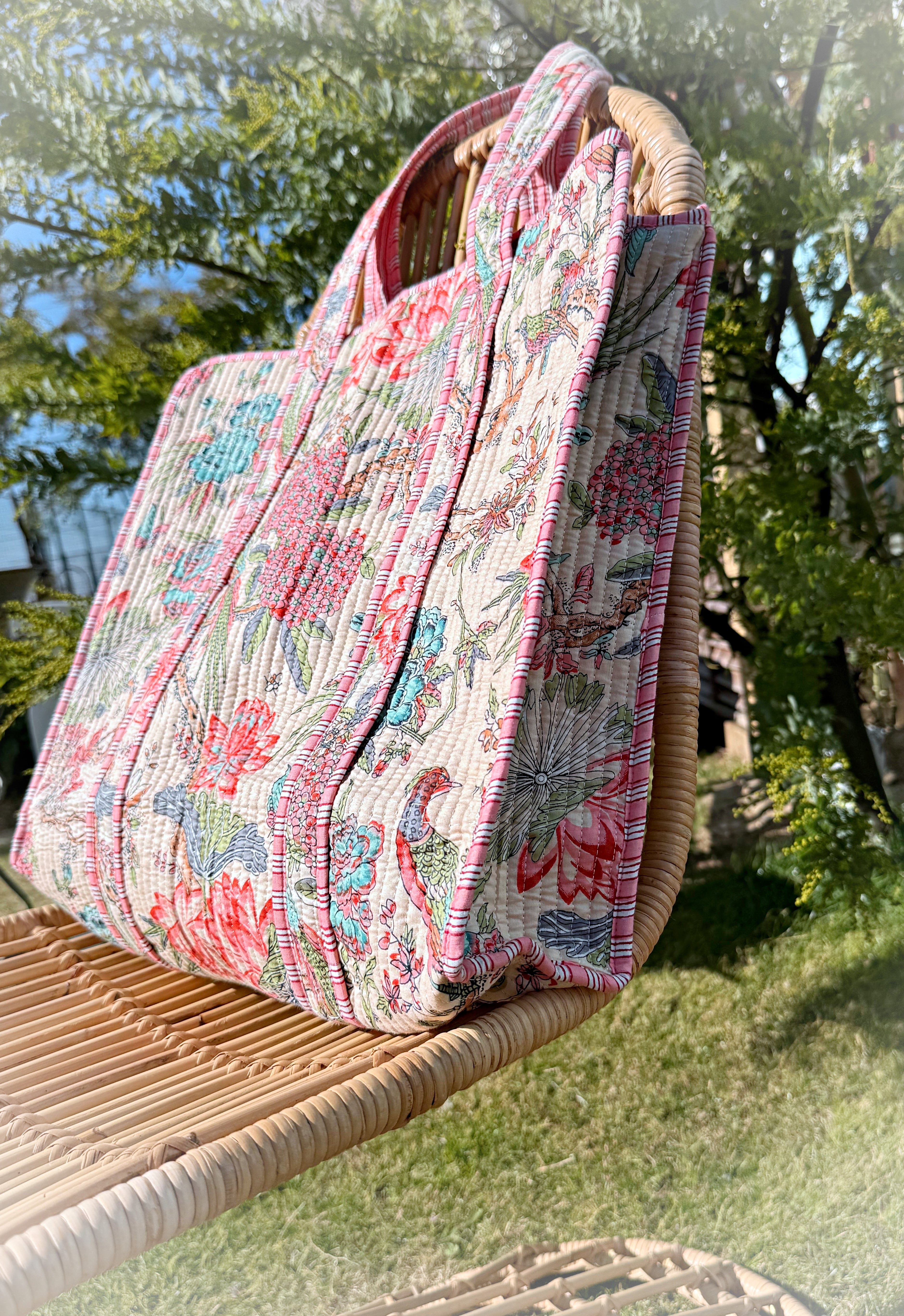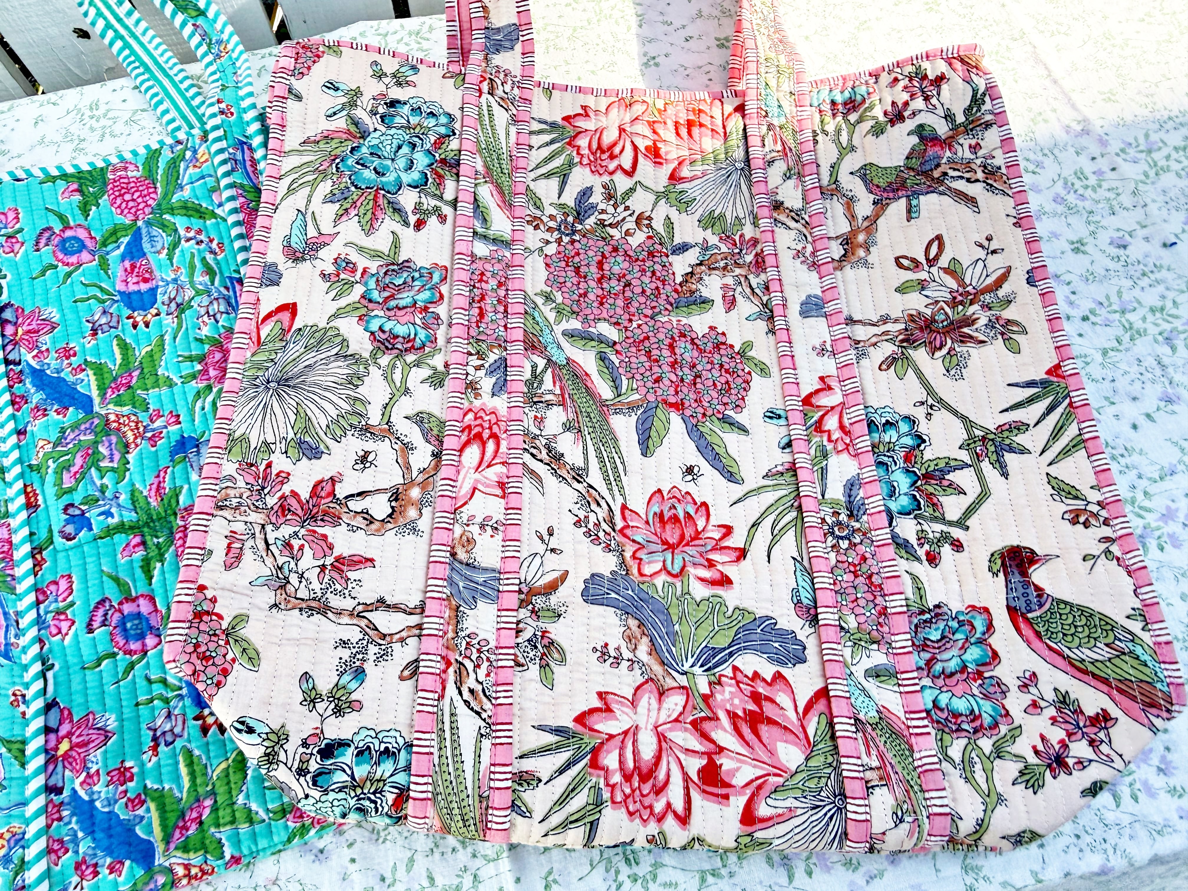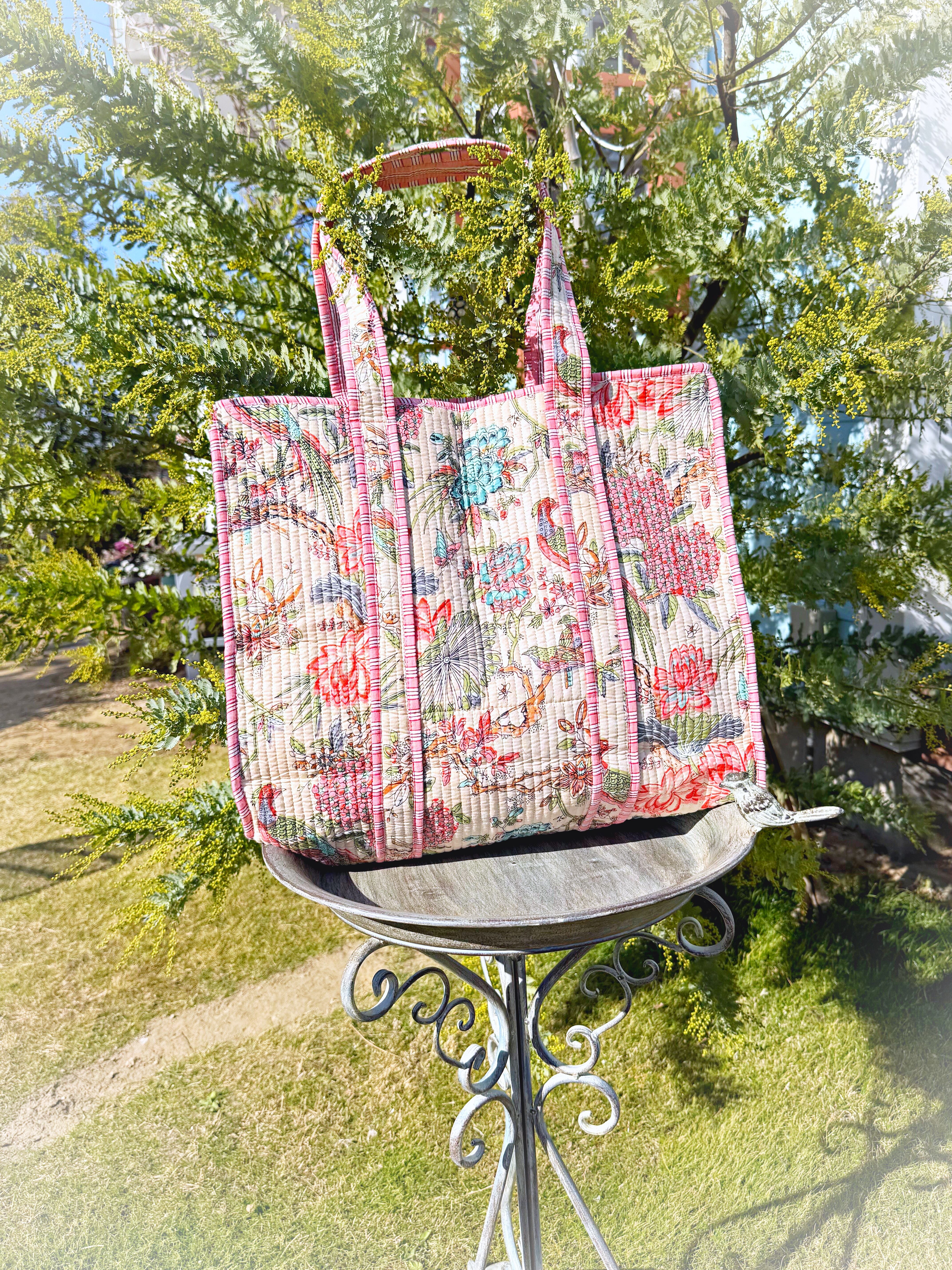 キルティング生地のハンドメイドの質感が温かく、ボタニカル柄が華やかな気分にさせてくれる使い勝手の良い綿布のトートバッグです。
