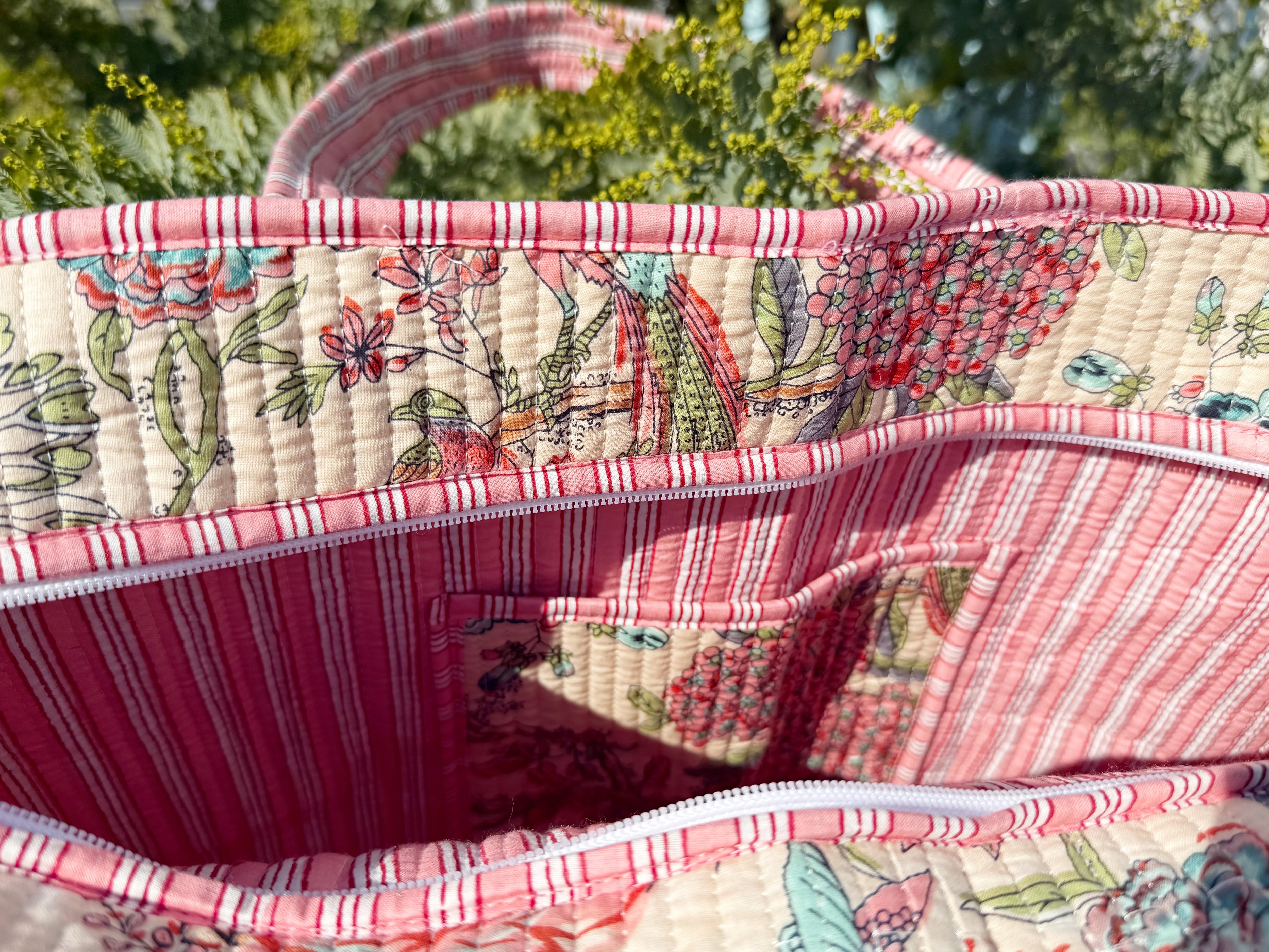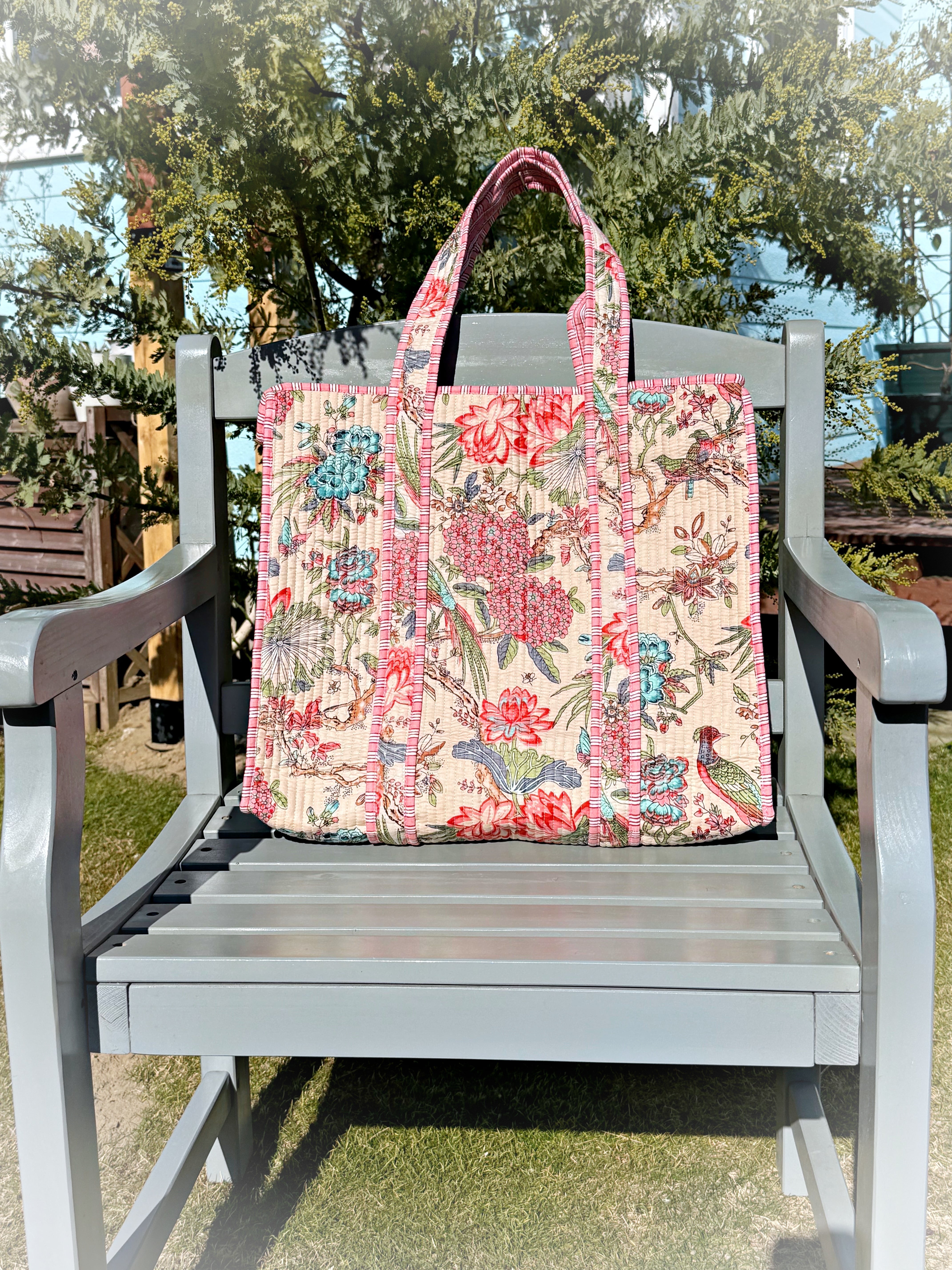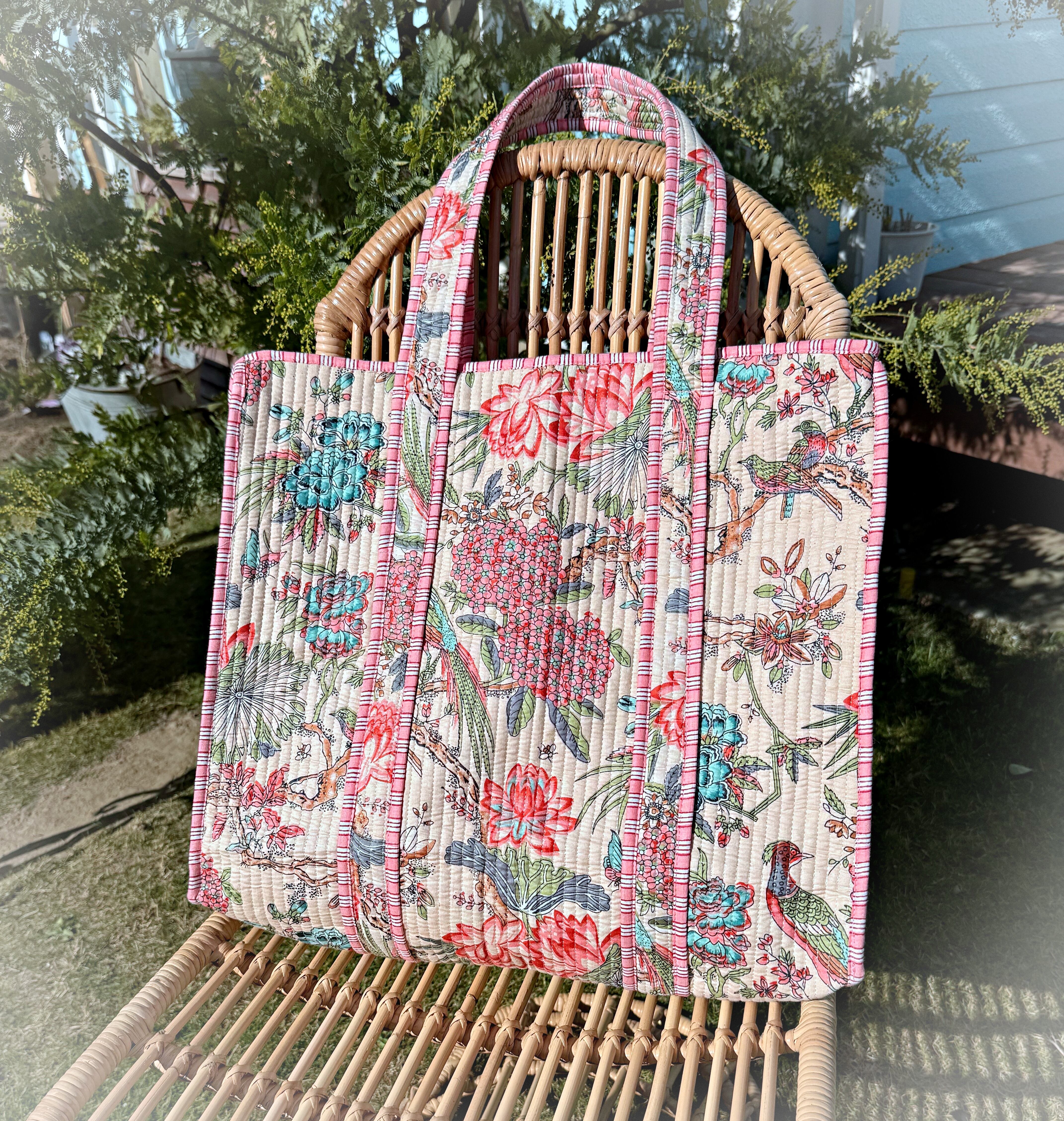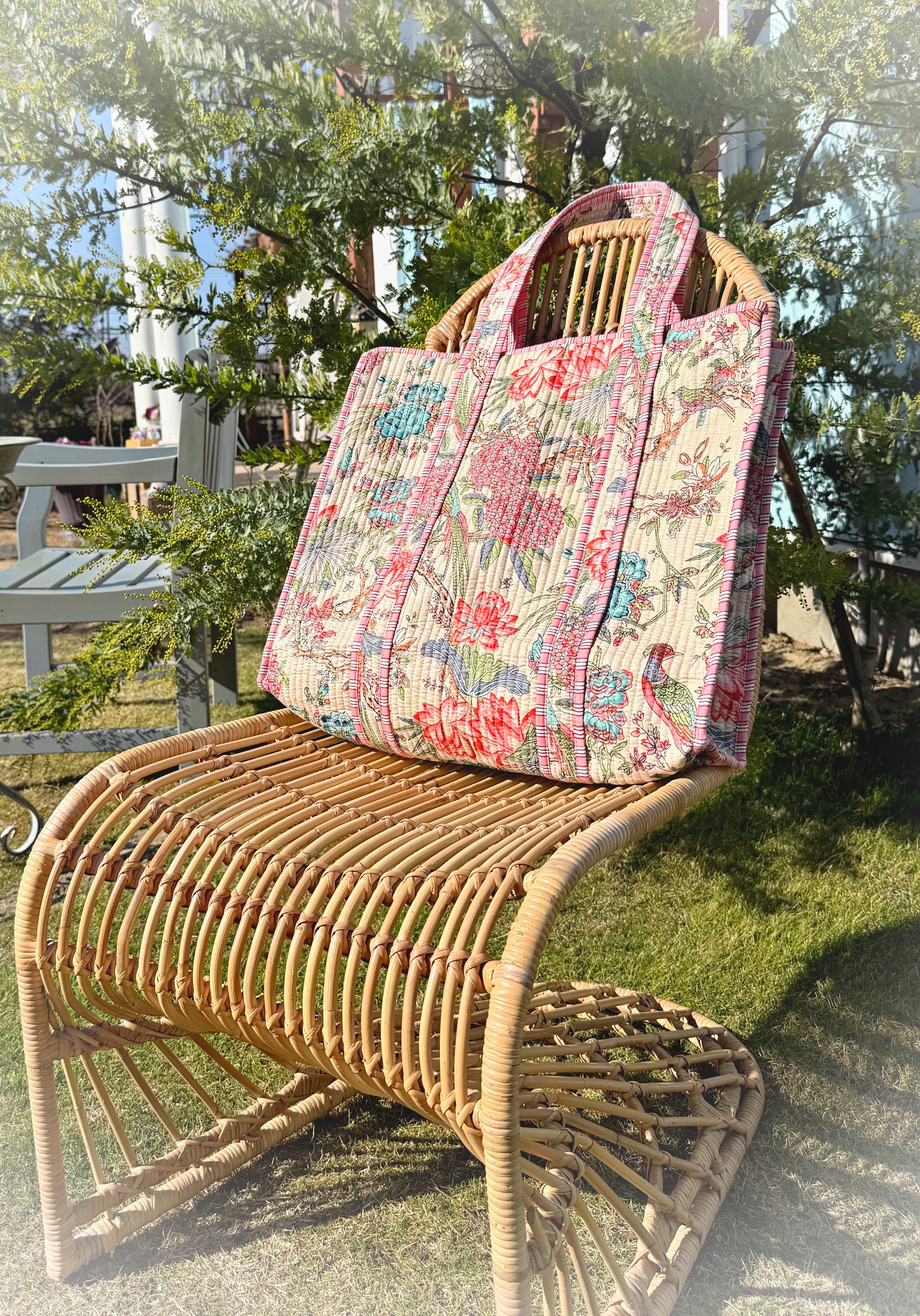 キルティング生地のハンドメイドの質感が温かく、ボタニカル柄が華やかな気分にさせてくれる使い勝手の良い綿布のトートバッグです。