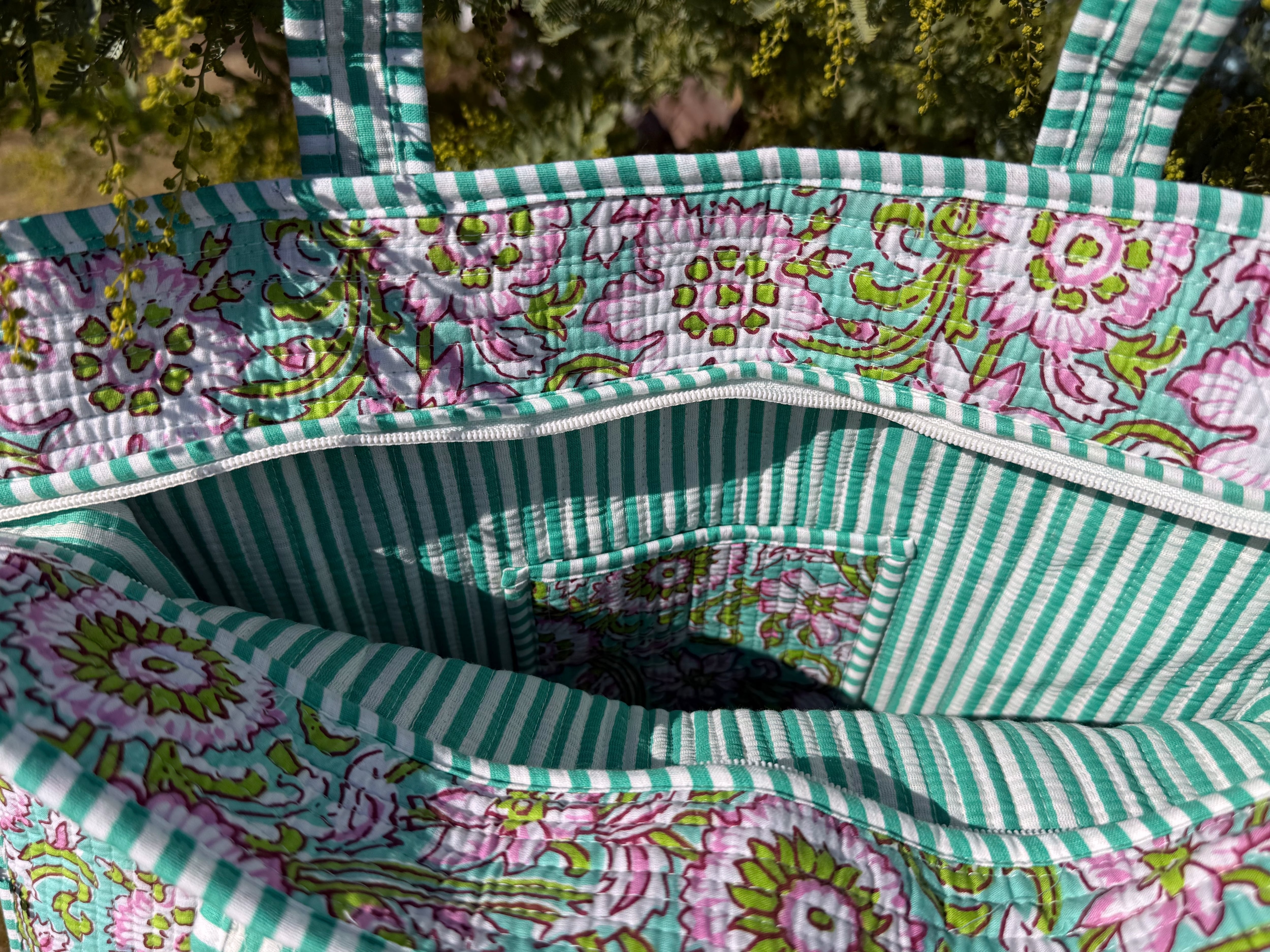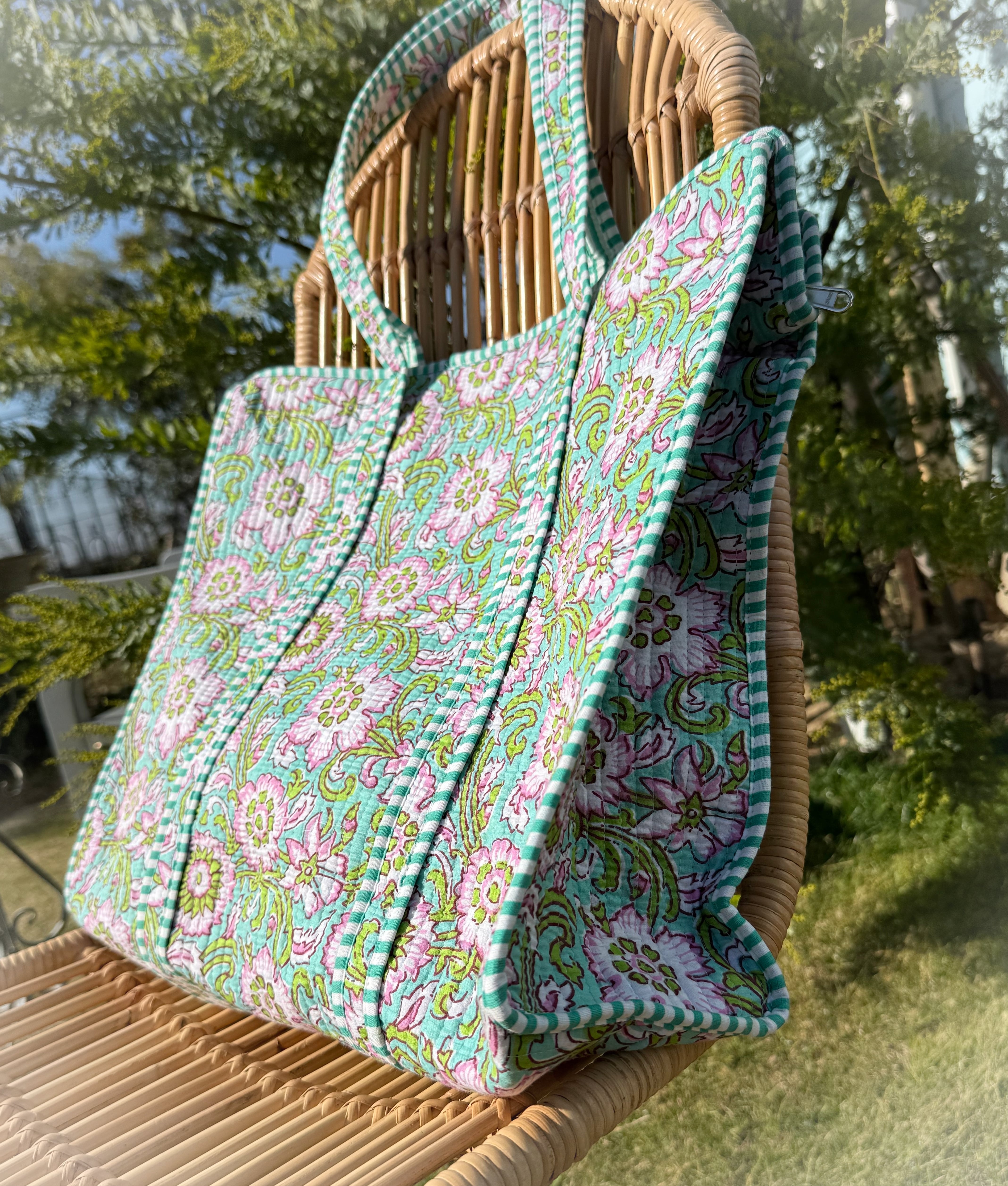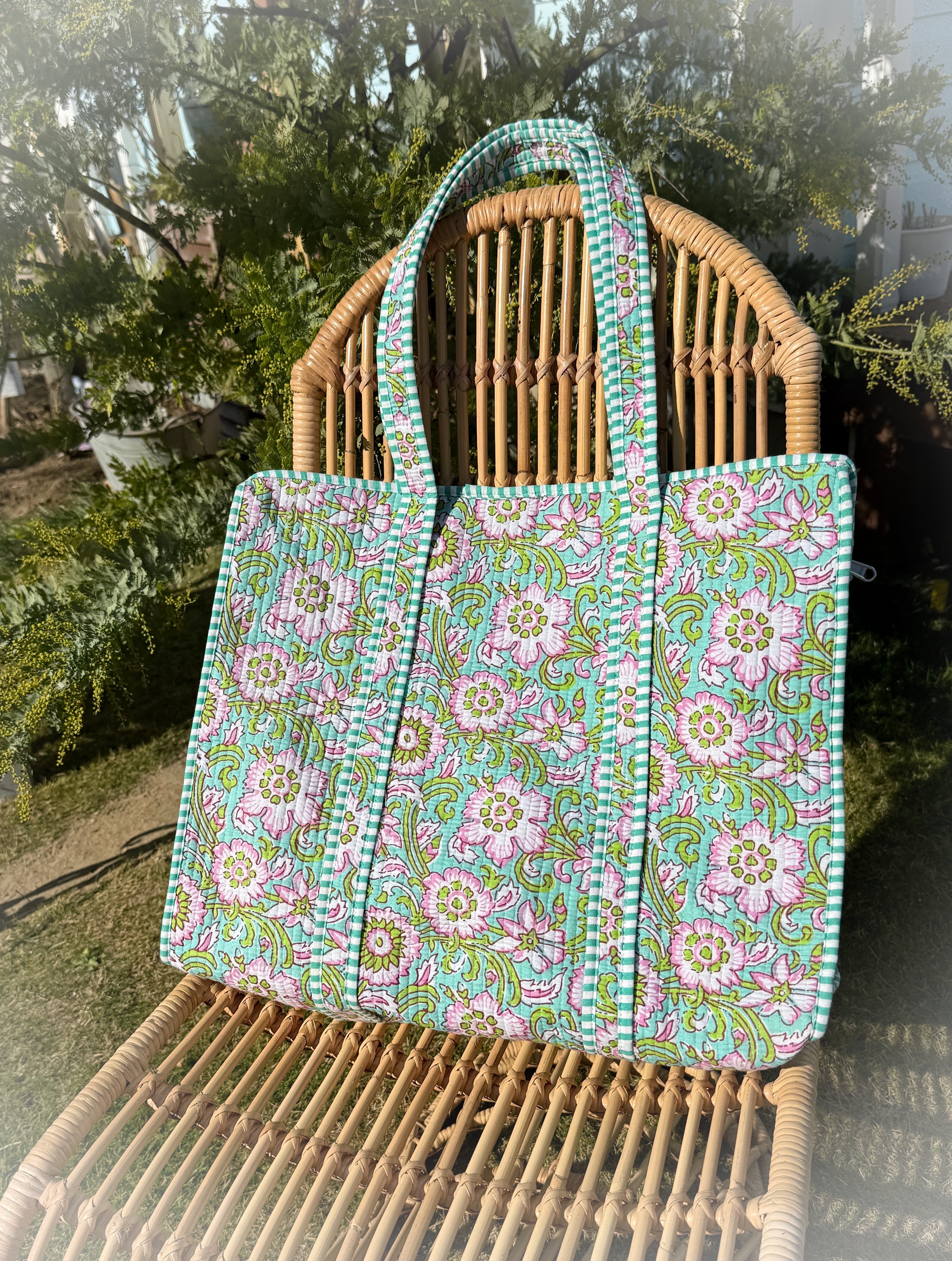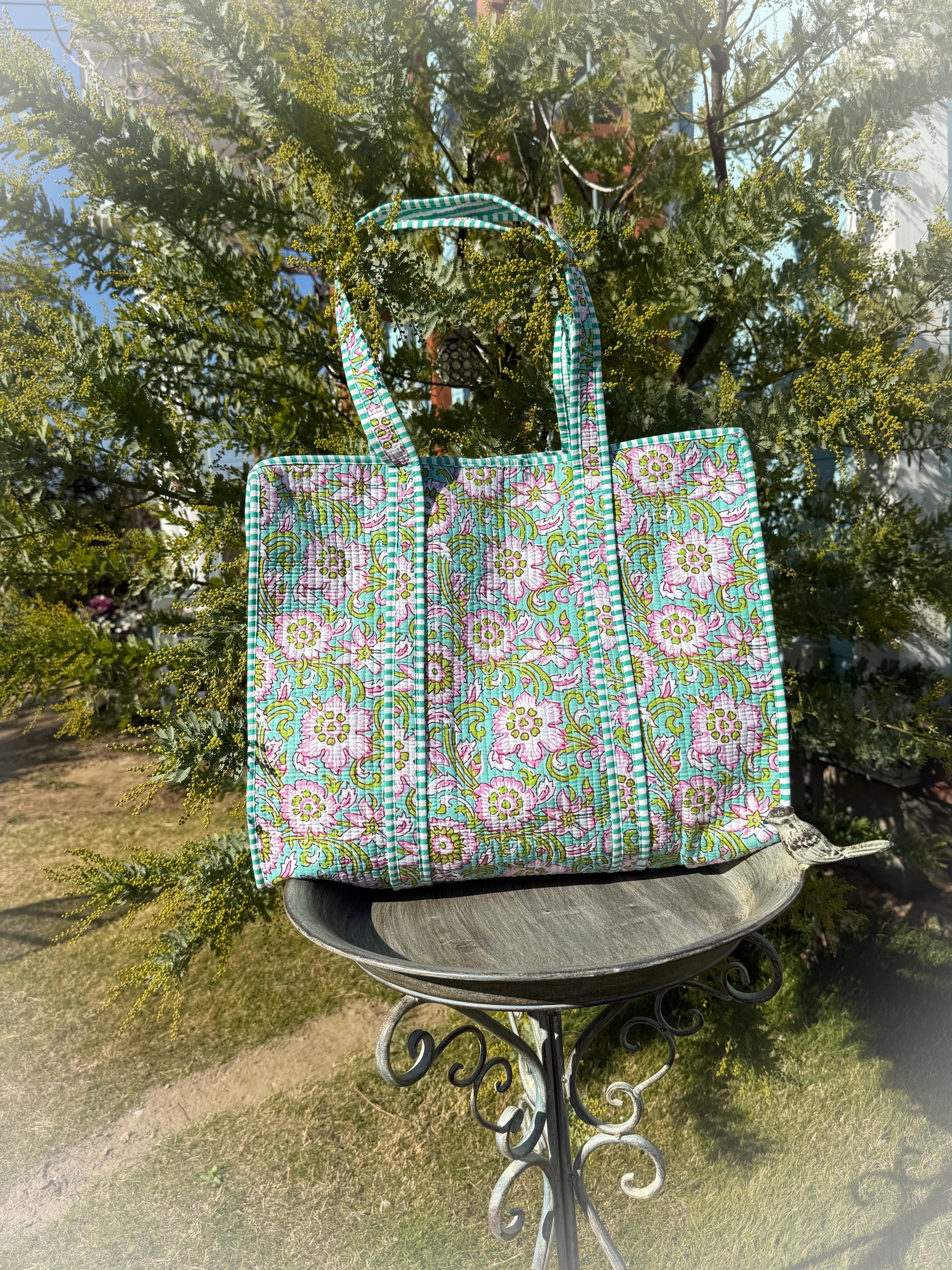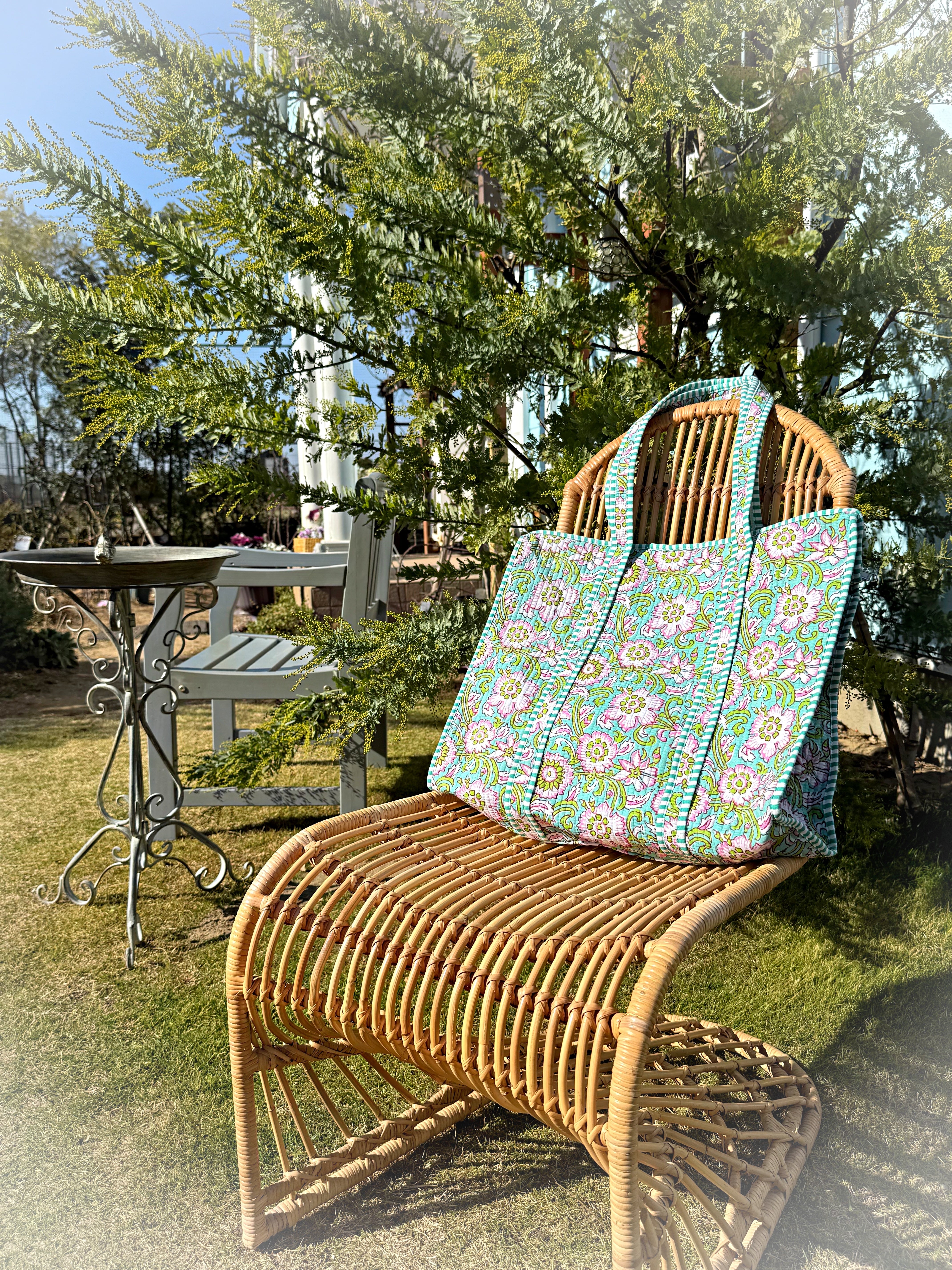 キルティング生地のハンドメイドの質感が温かく、ボタニカル柄が華やかな気分にさせてくれる使い勝手の良い綿布のトートバッグです。
