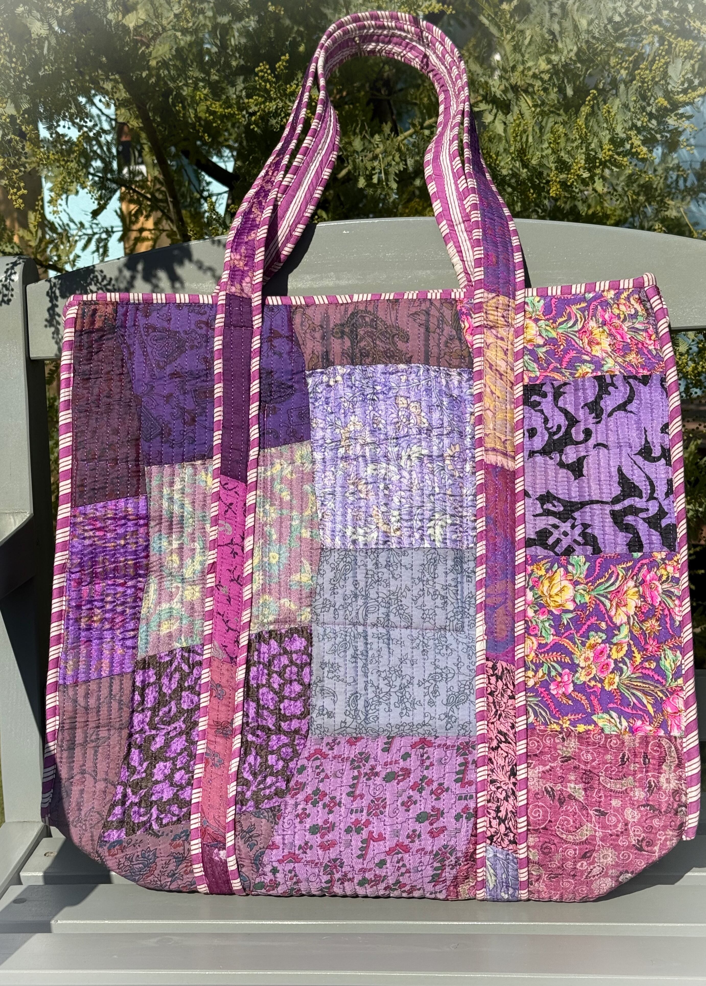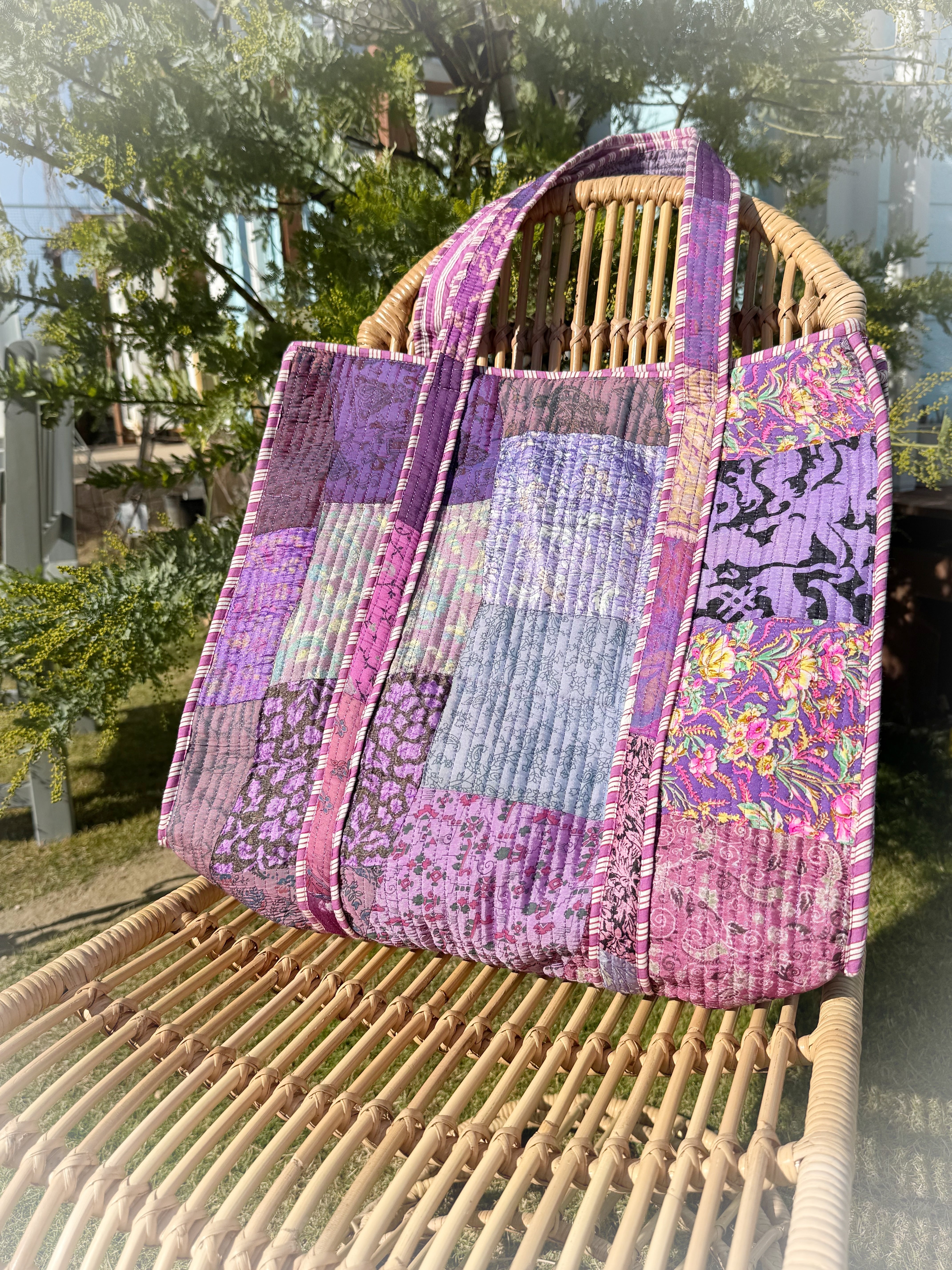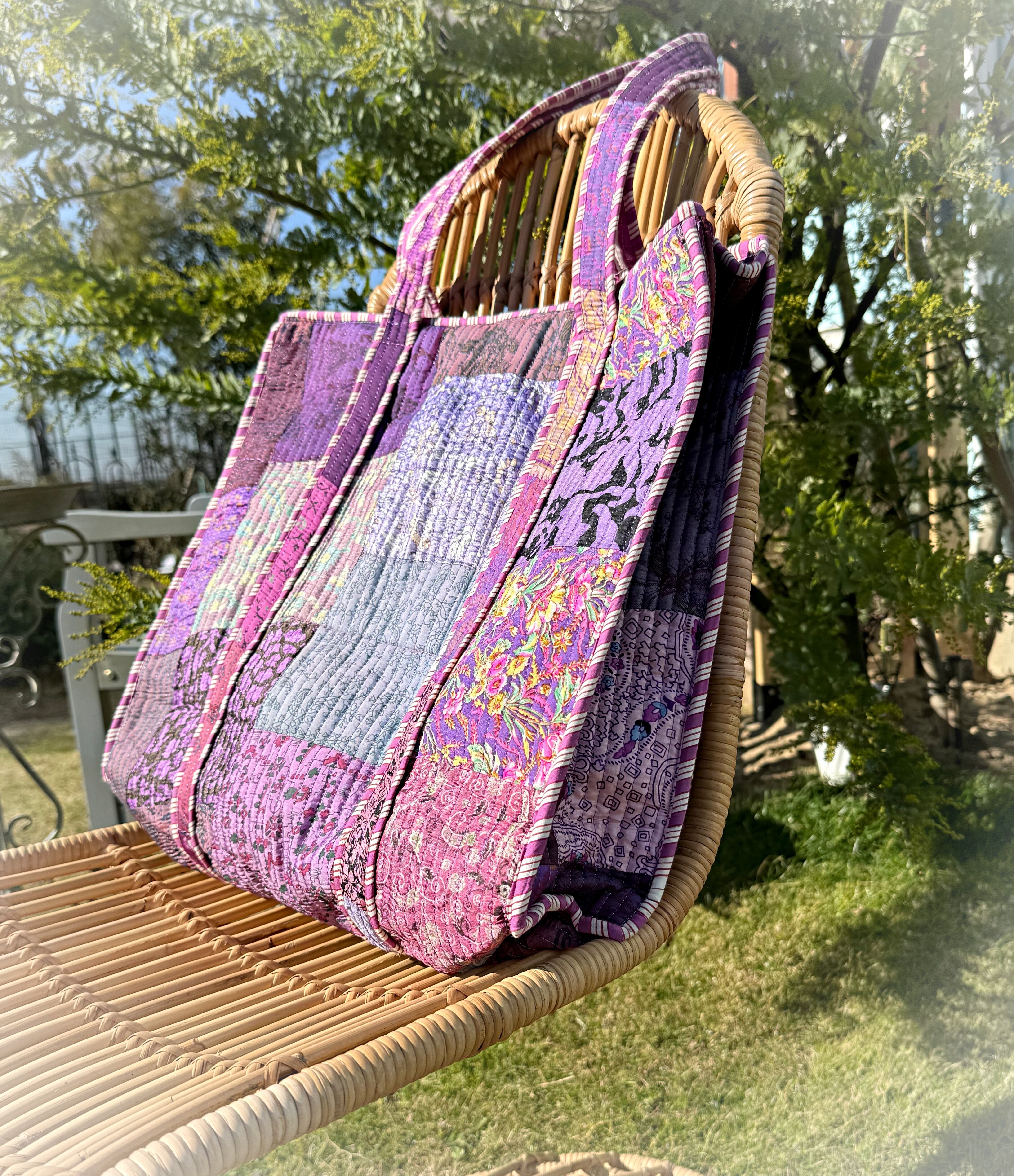 キルティング生地のハンドメイドの質感が温かく、ボタニカル柄が華やかな気分にさせてくれる使い勝手の良い綿布のトートバッグです。