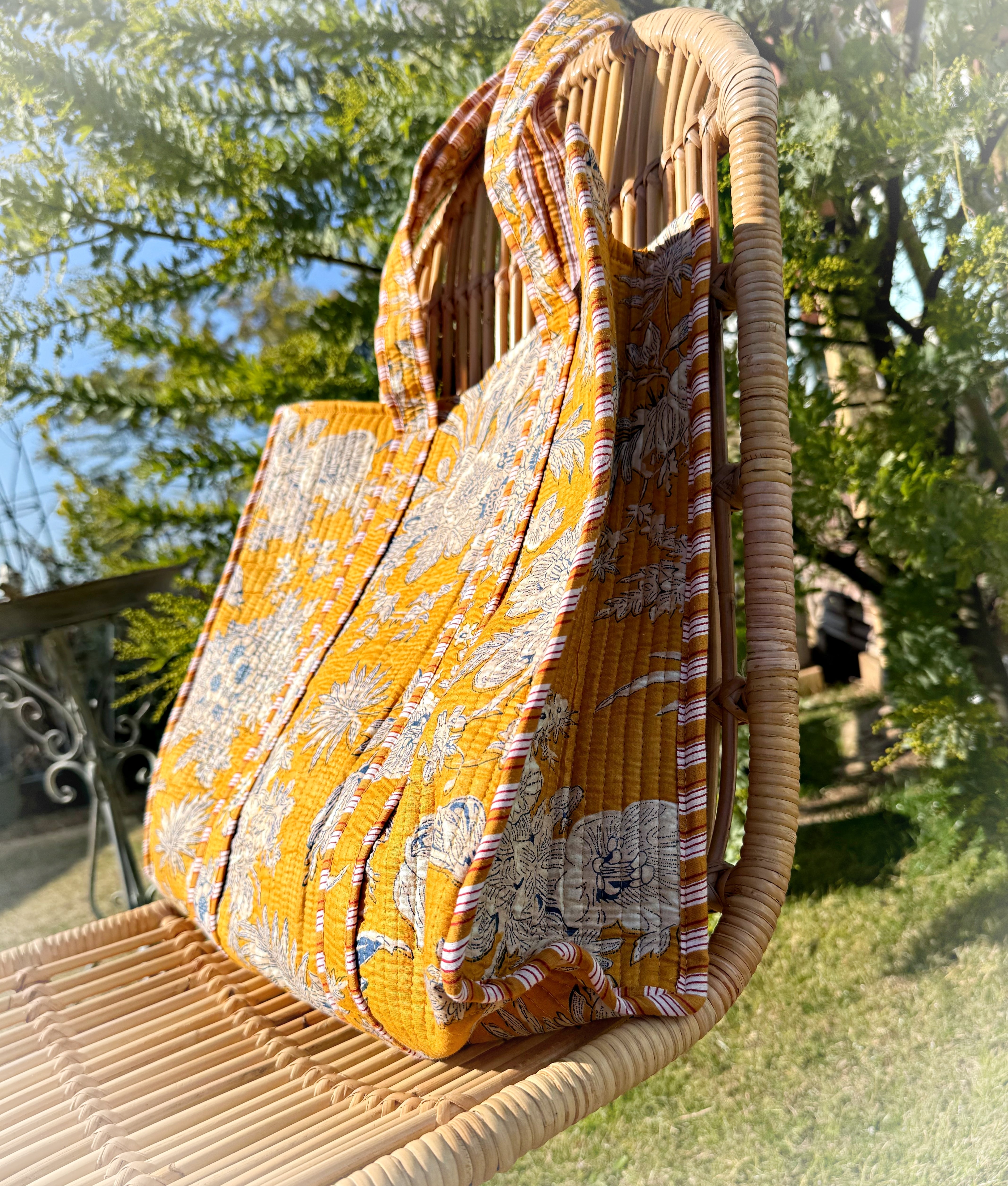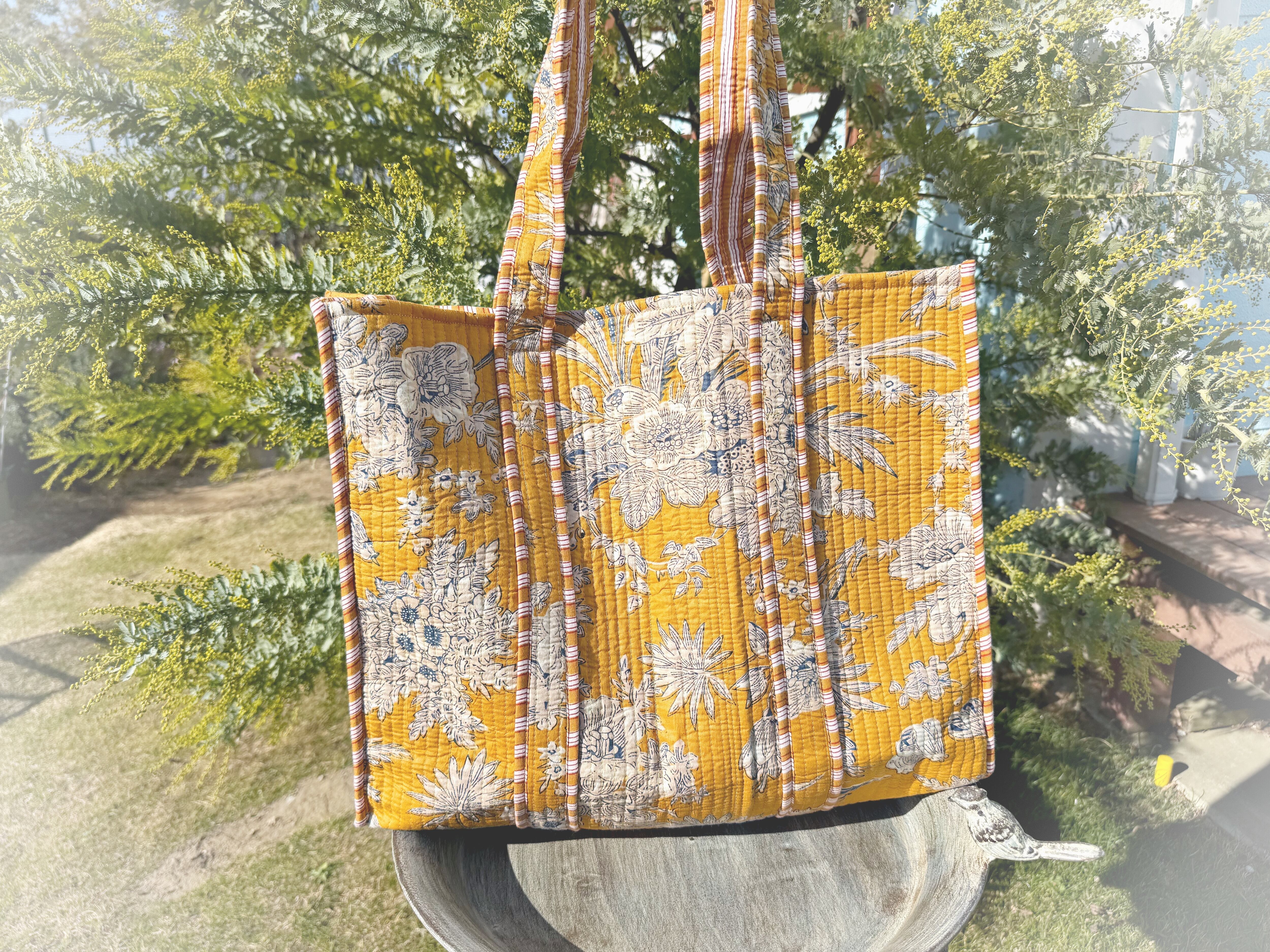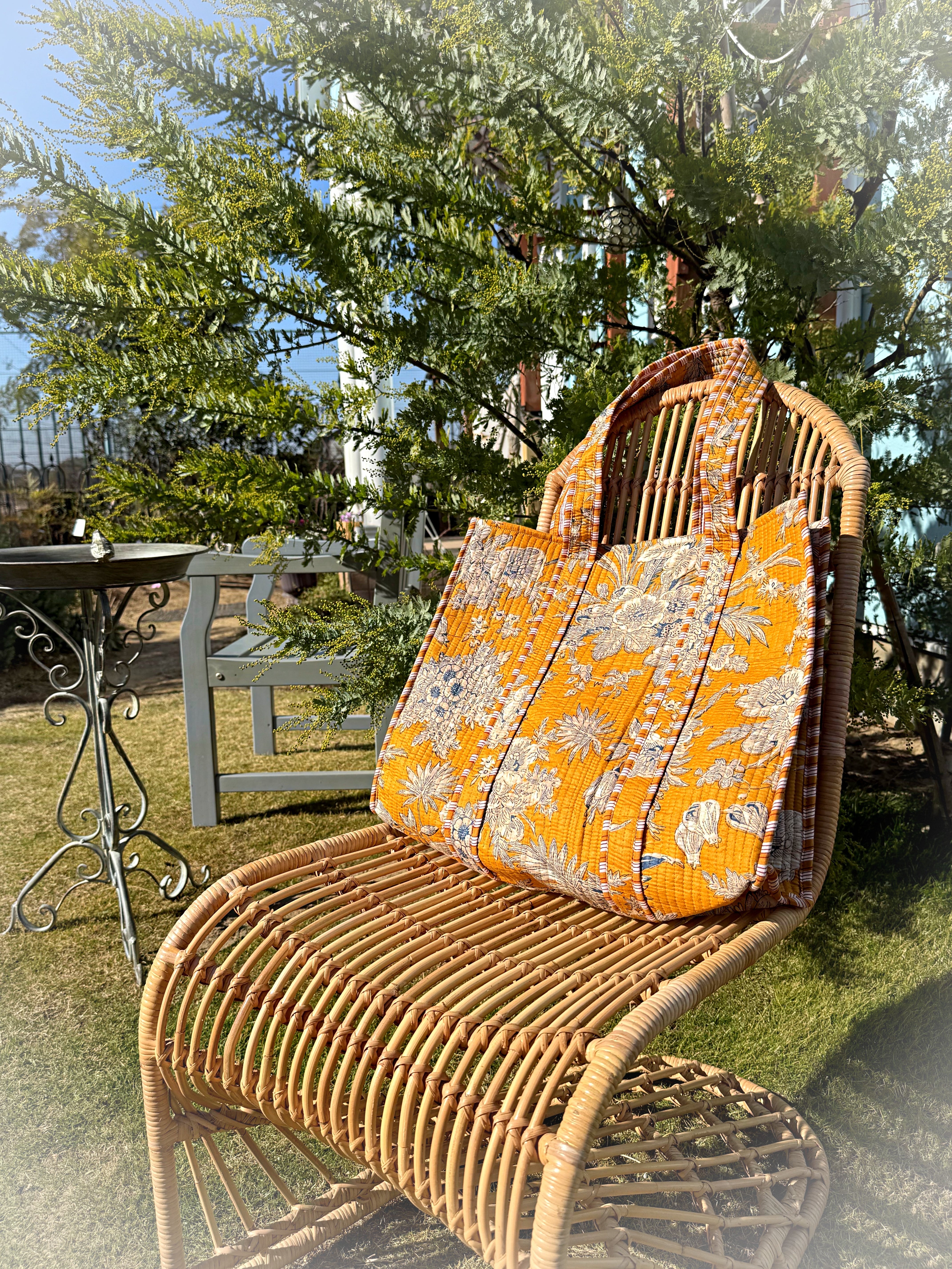 キルティング生地のハンドメイドの質感が温かく、ボタニカル柄が華やかな気分にさせてくれる使い勝手の良い綿布のトートバッグです。