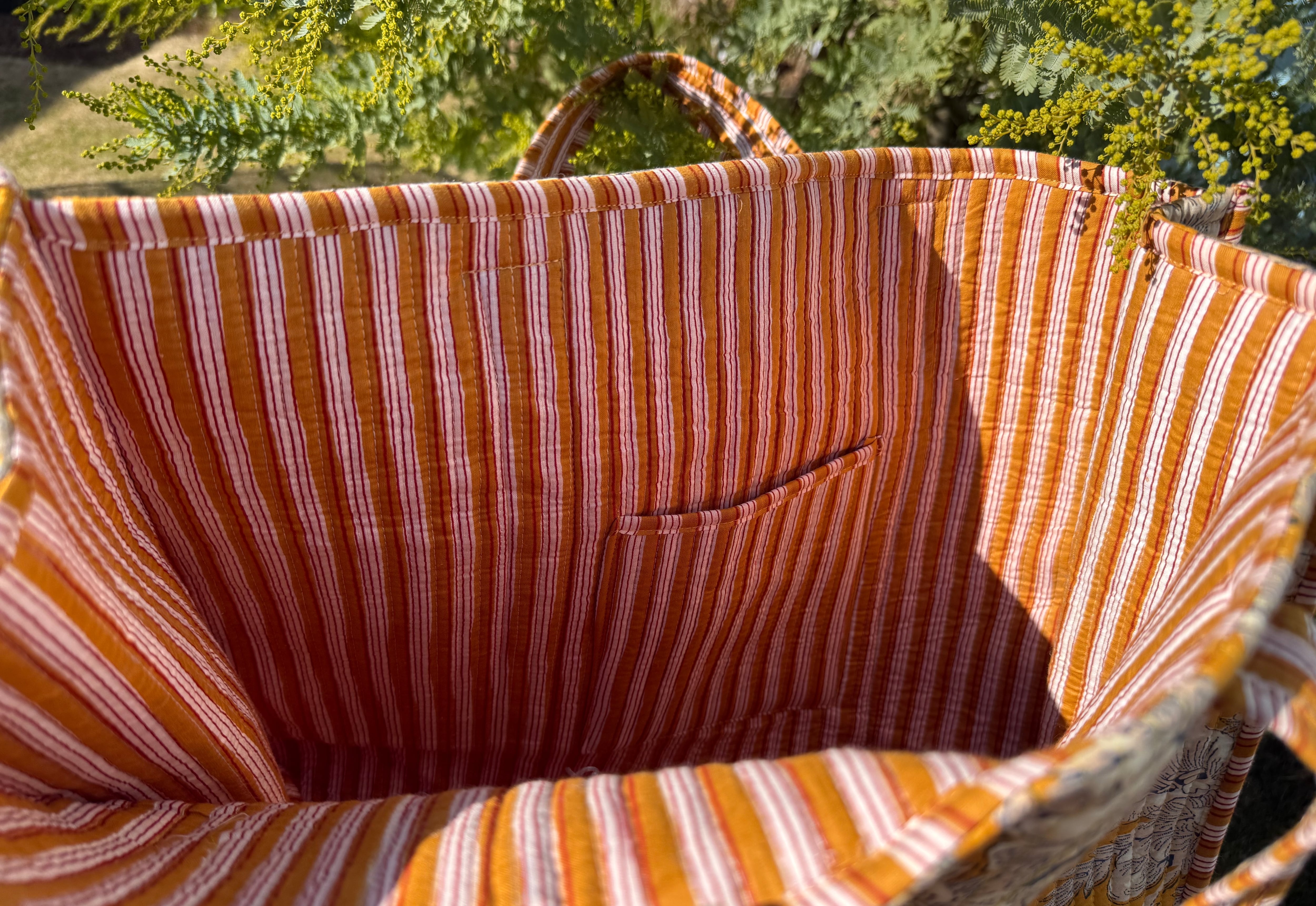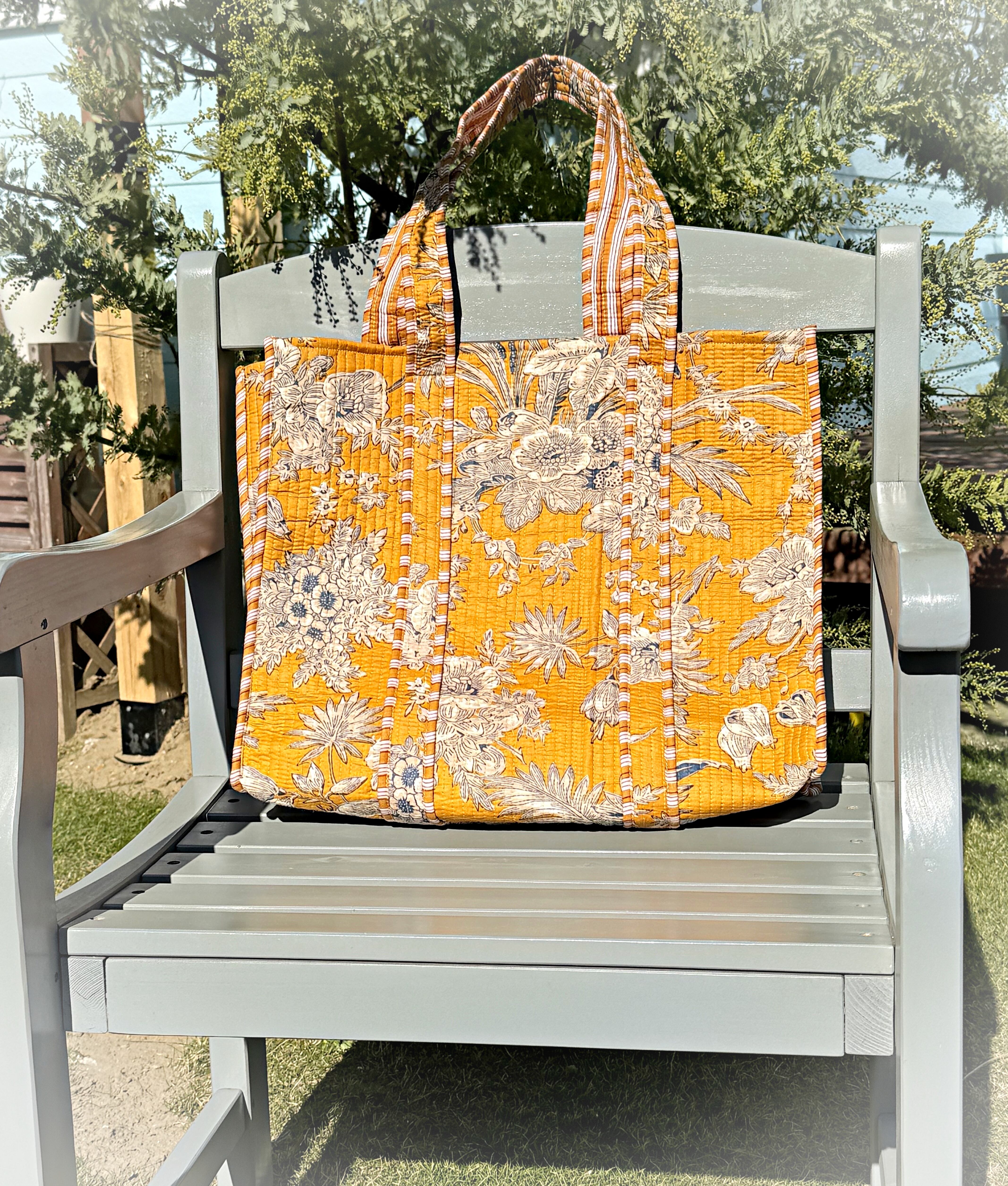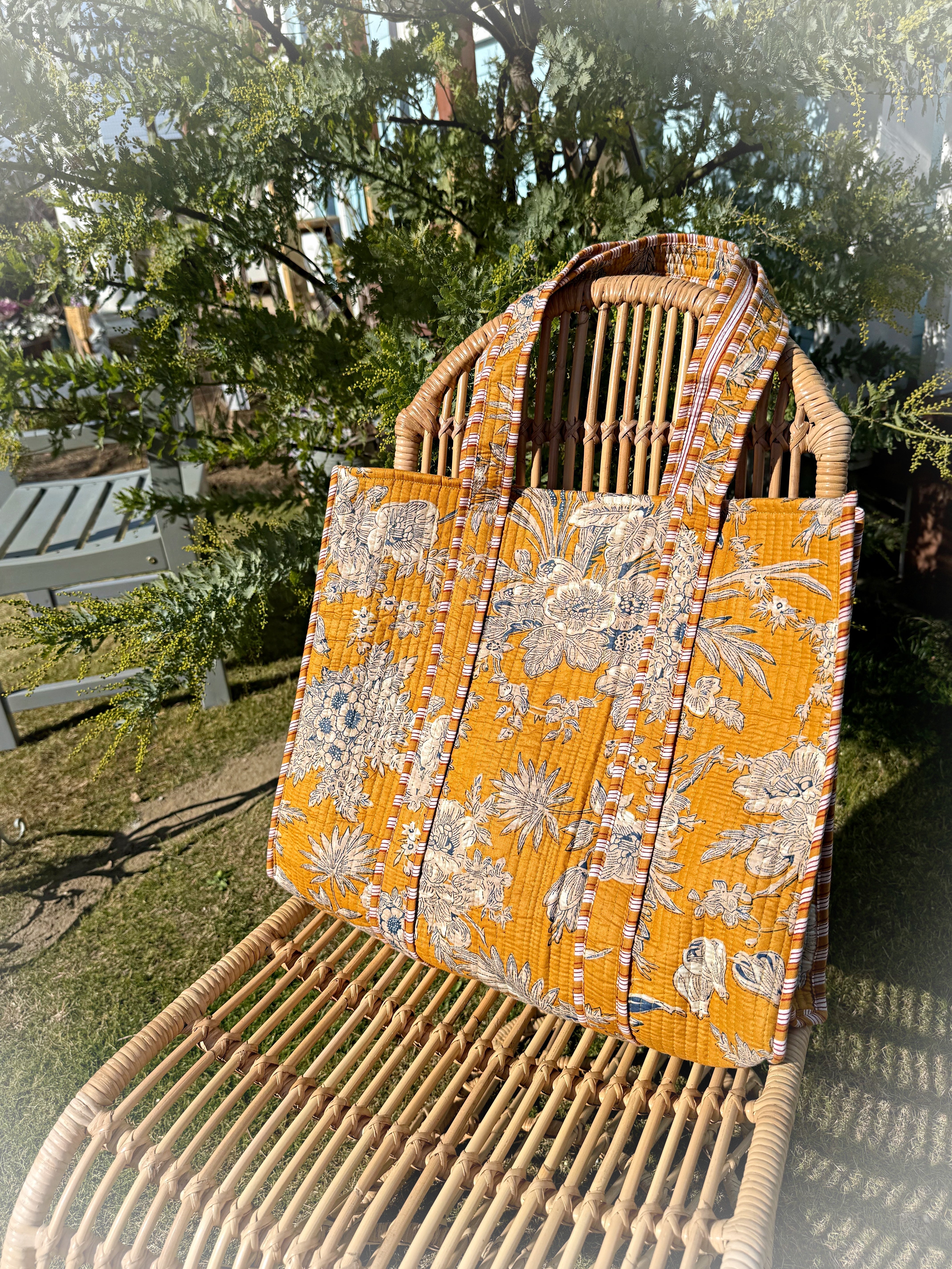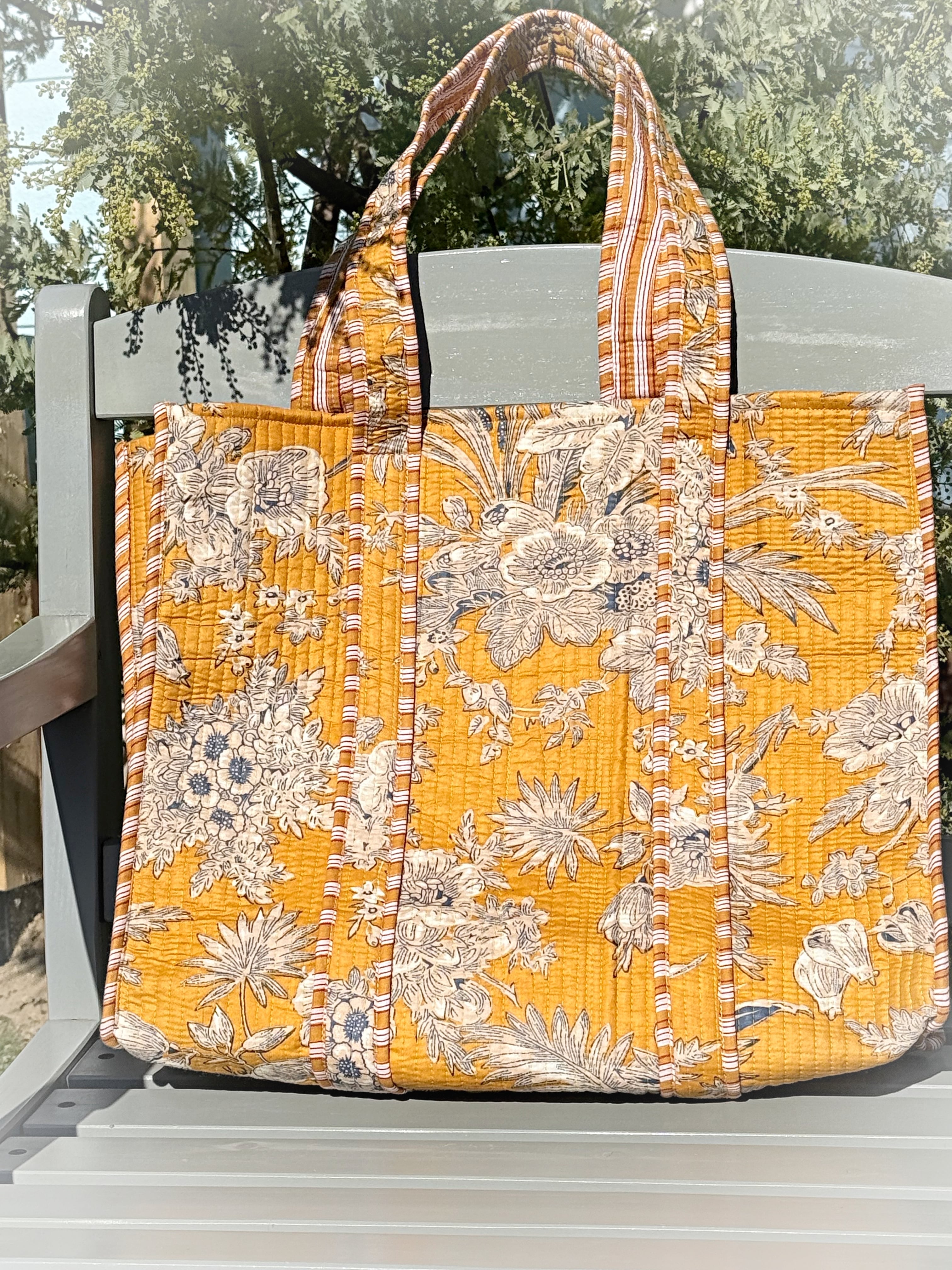 キルティング生地のハンドメイドの質感が温かく、ボタニカル柄が華やかな気分にさせてくれる使い勝手の良い綿布のトートバッグです。