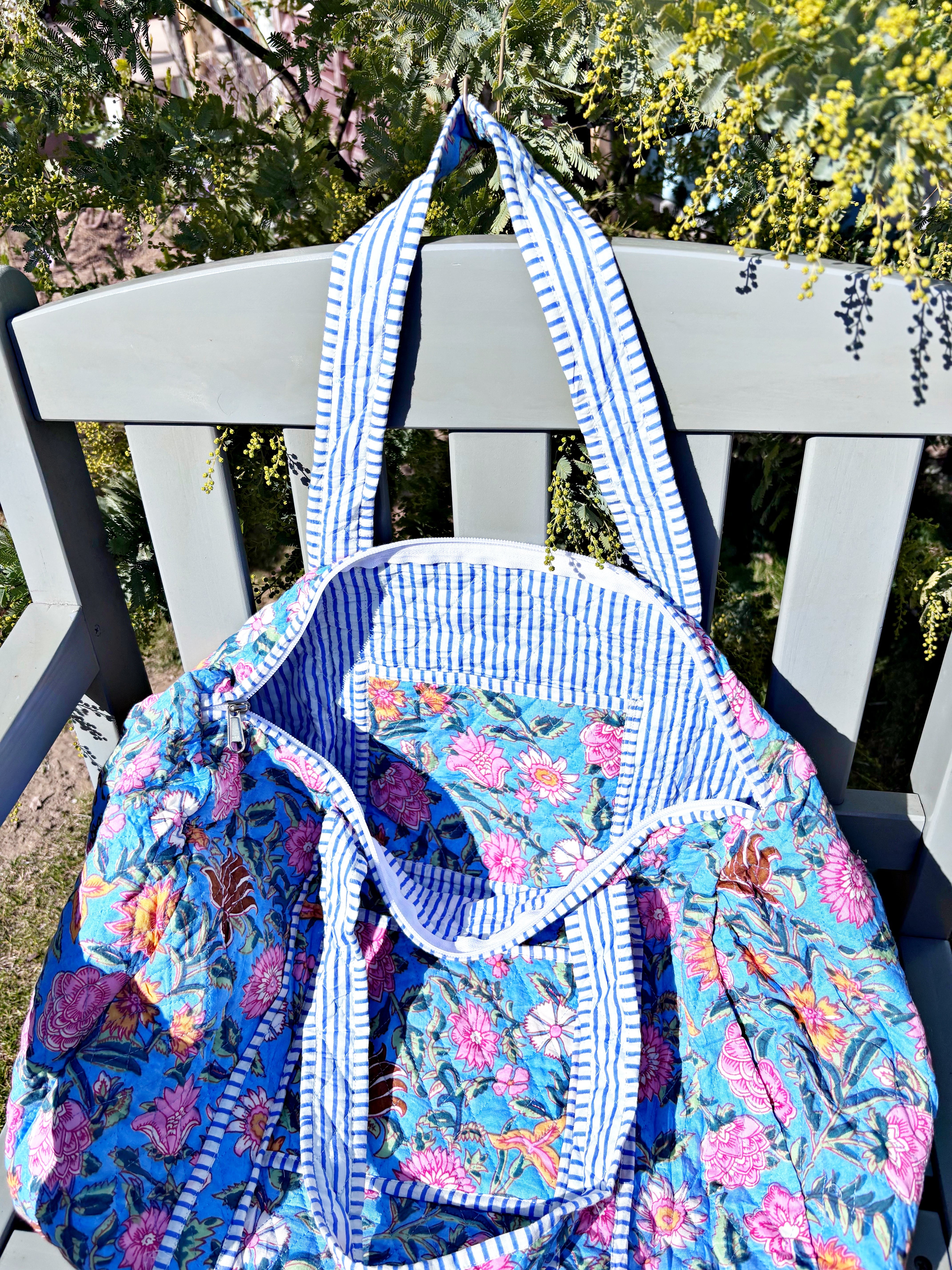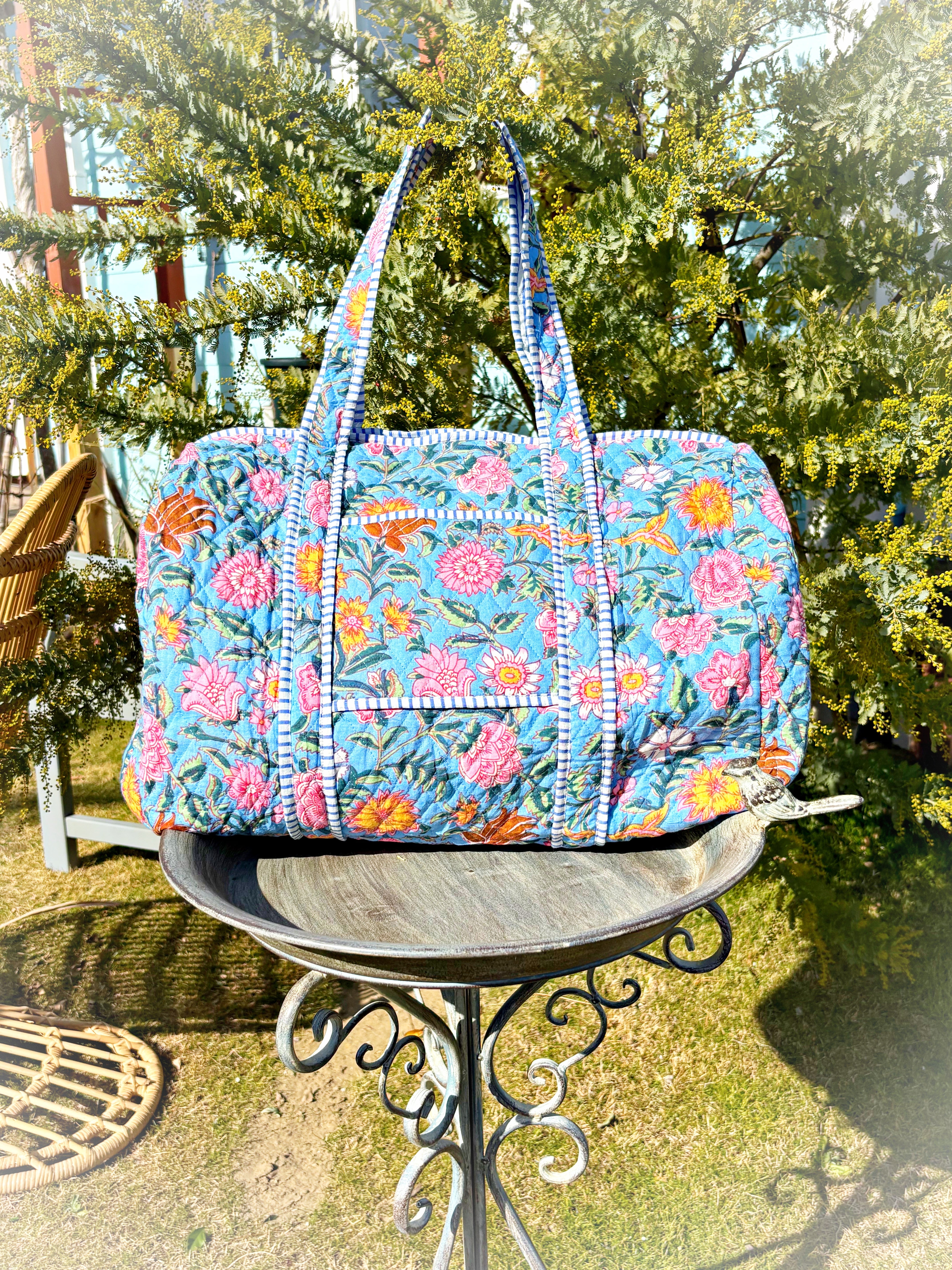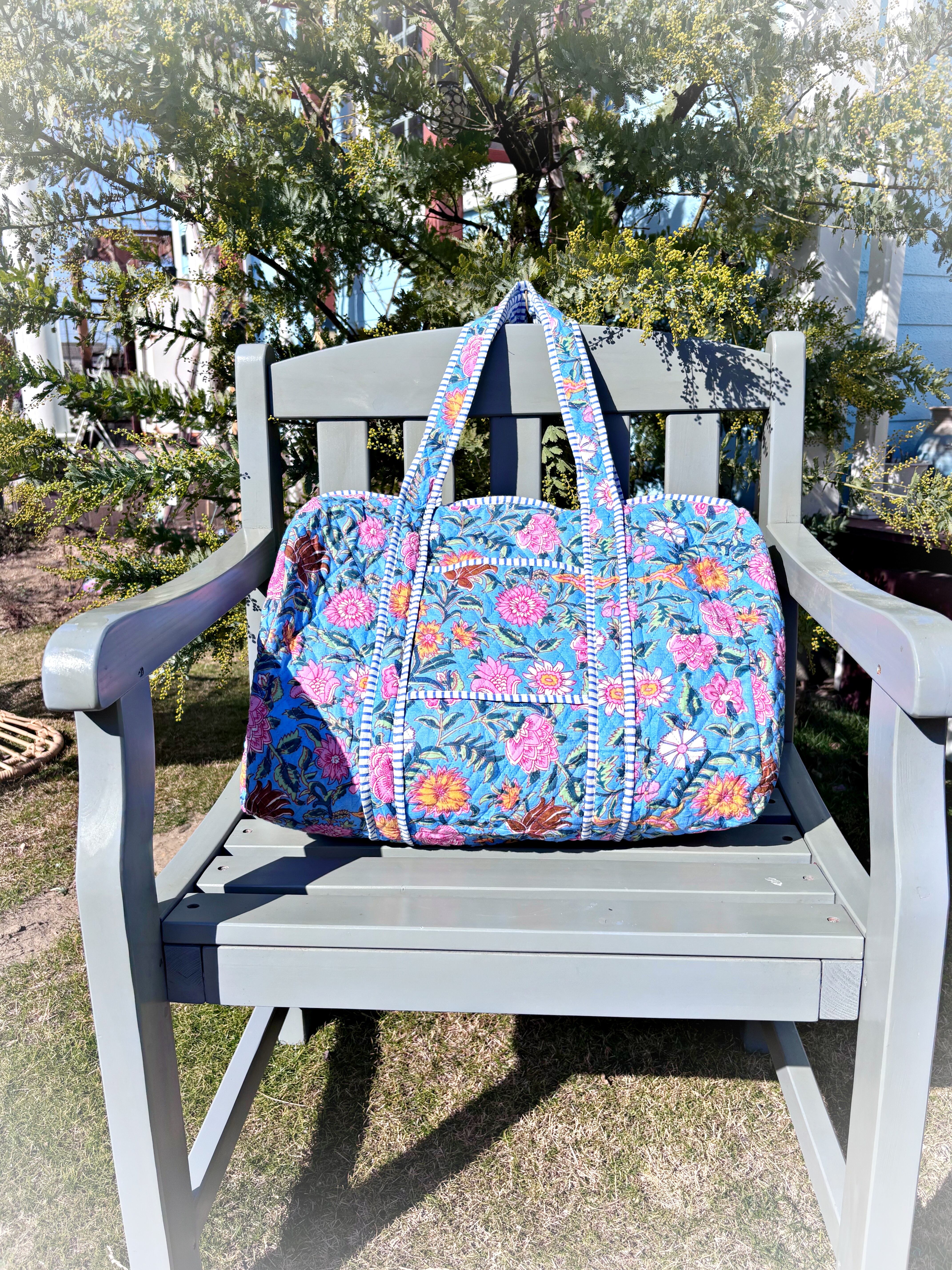 キルティング生地のハンドメイドの質感が温かく、ボタニカル柄が華やかな気分にさせてくれる綿布のボストンバッグです。