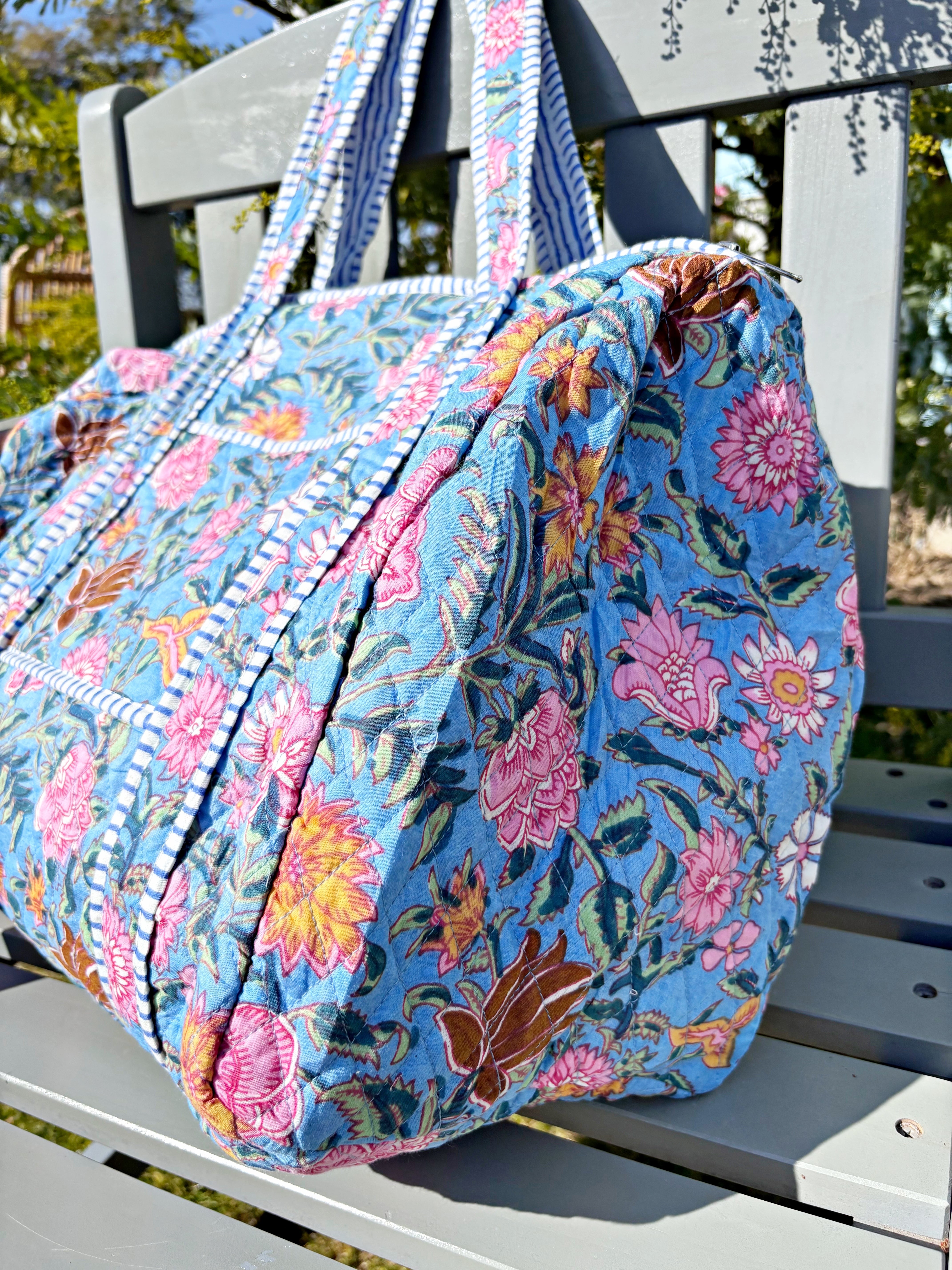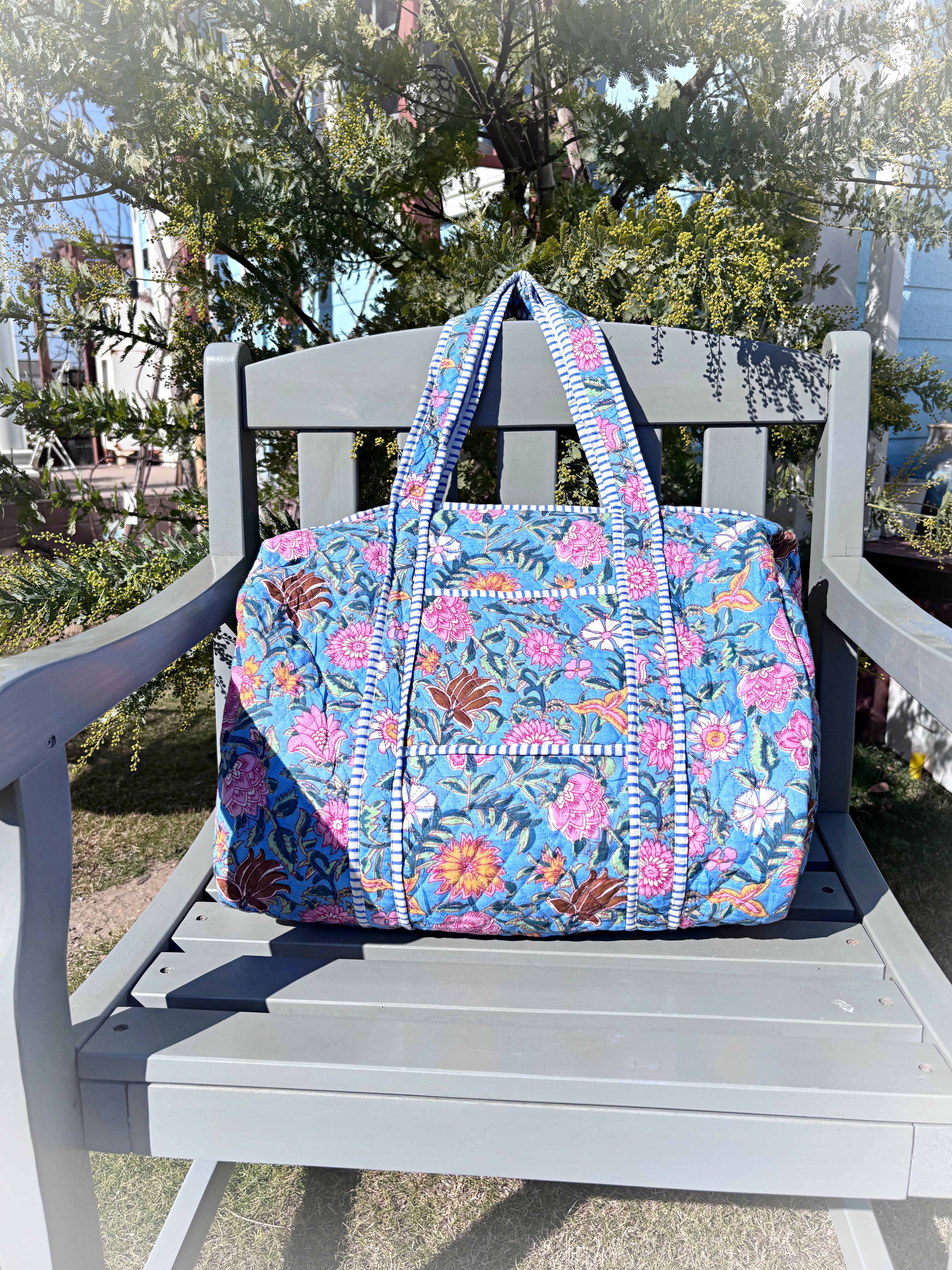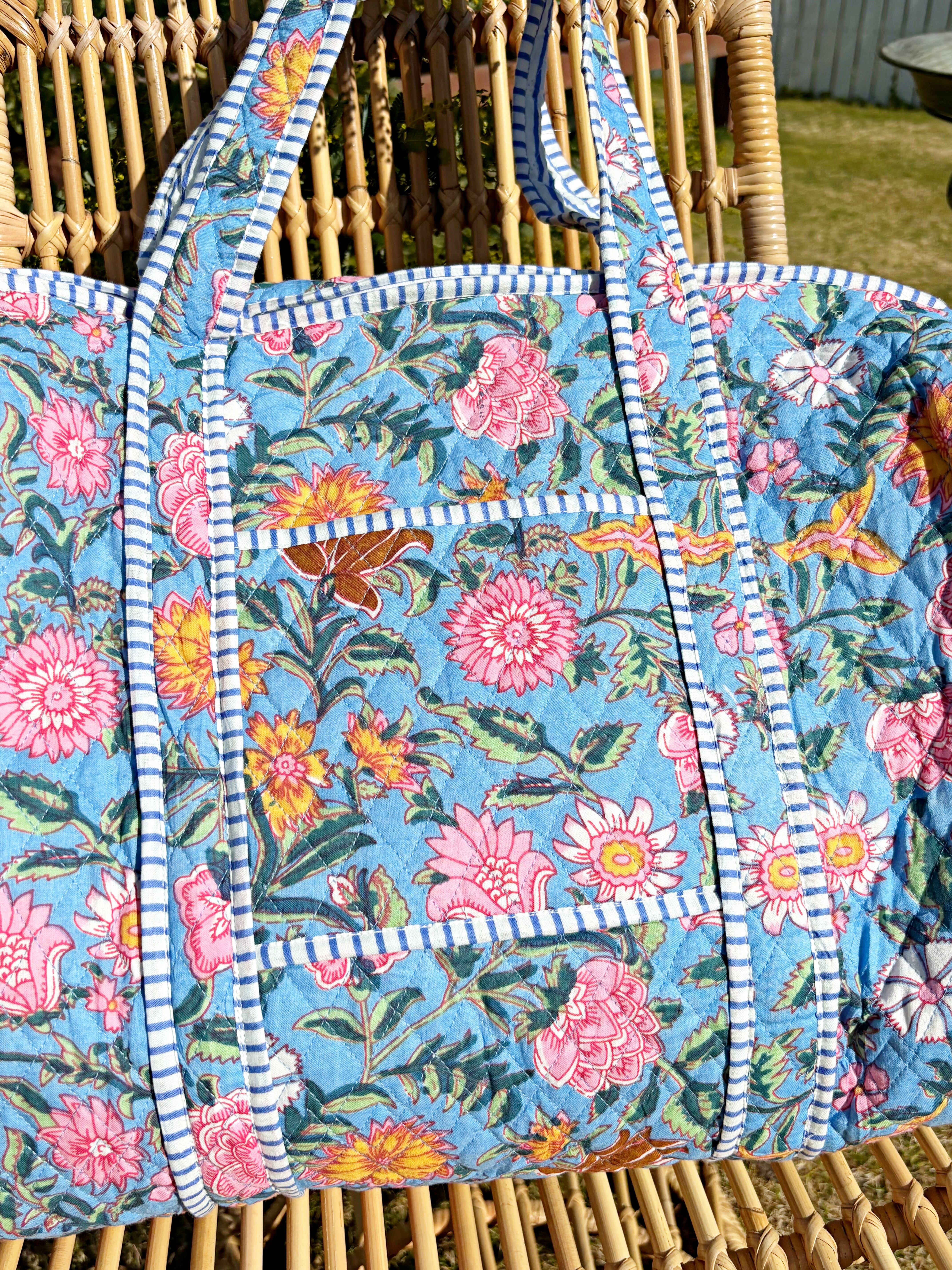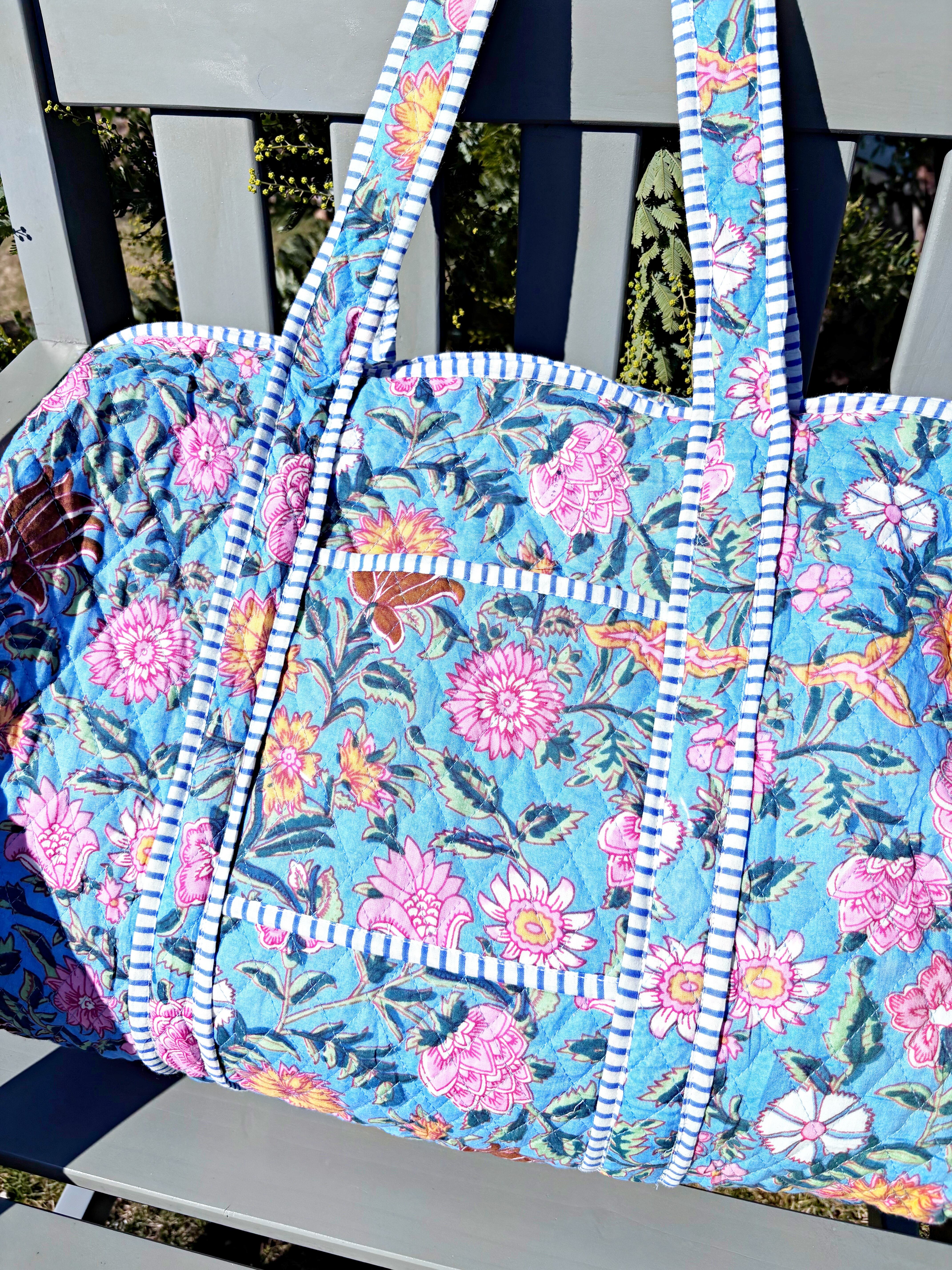 キルティング生地のハンドメイドの質感が温かく、ボタニカル柄が華やかな気分にさせてくれる綿布のボストンバッグです。