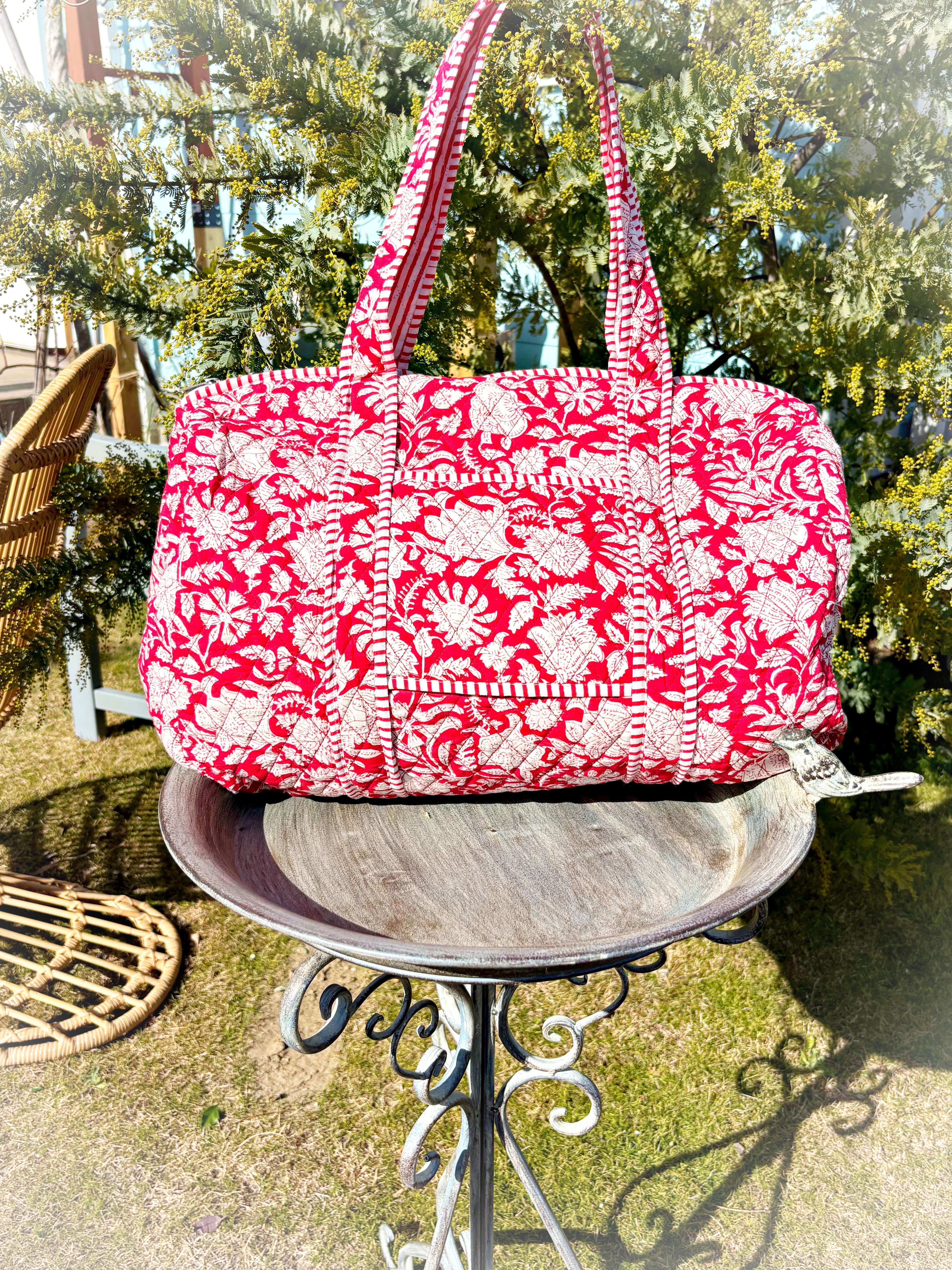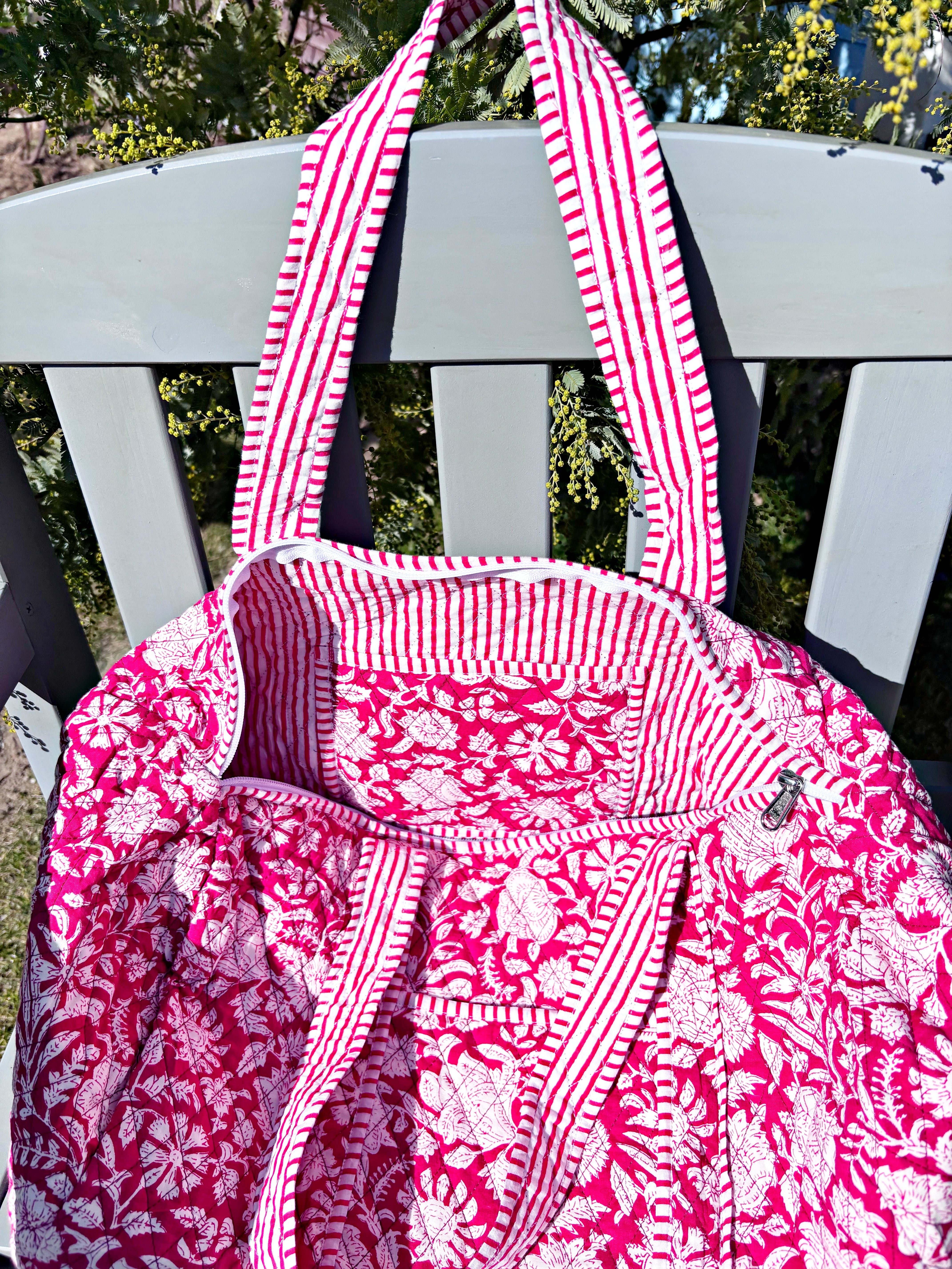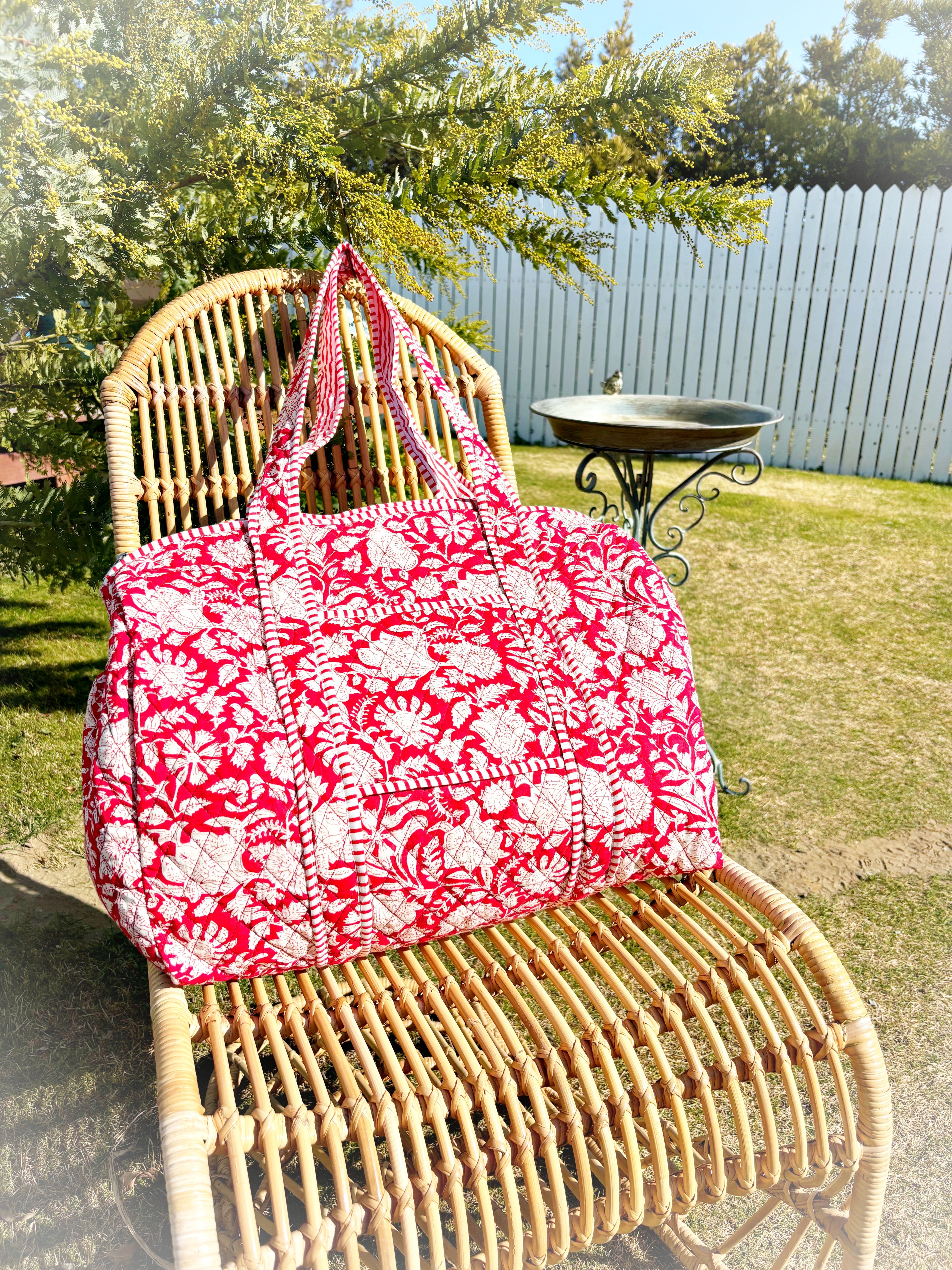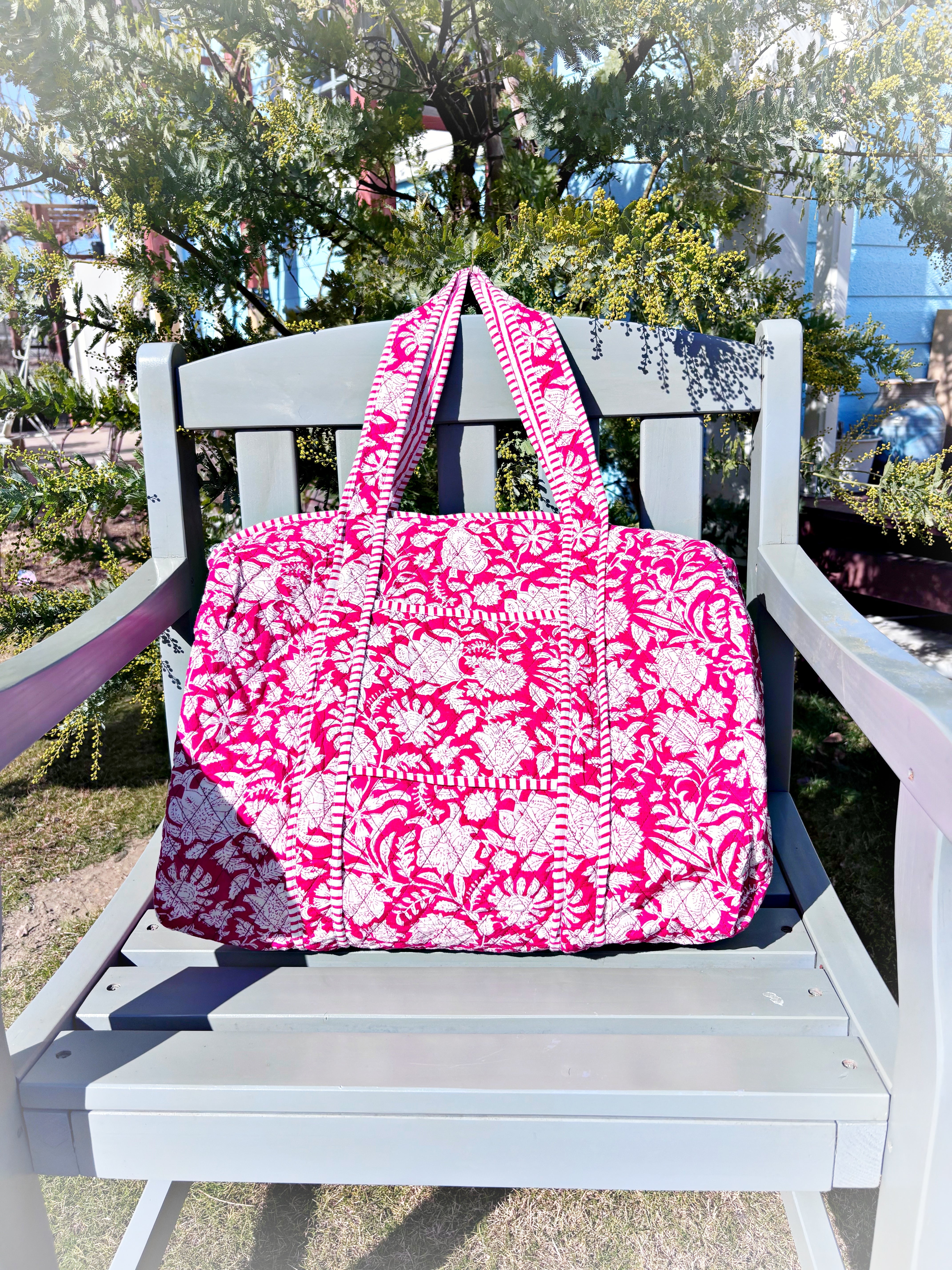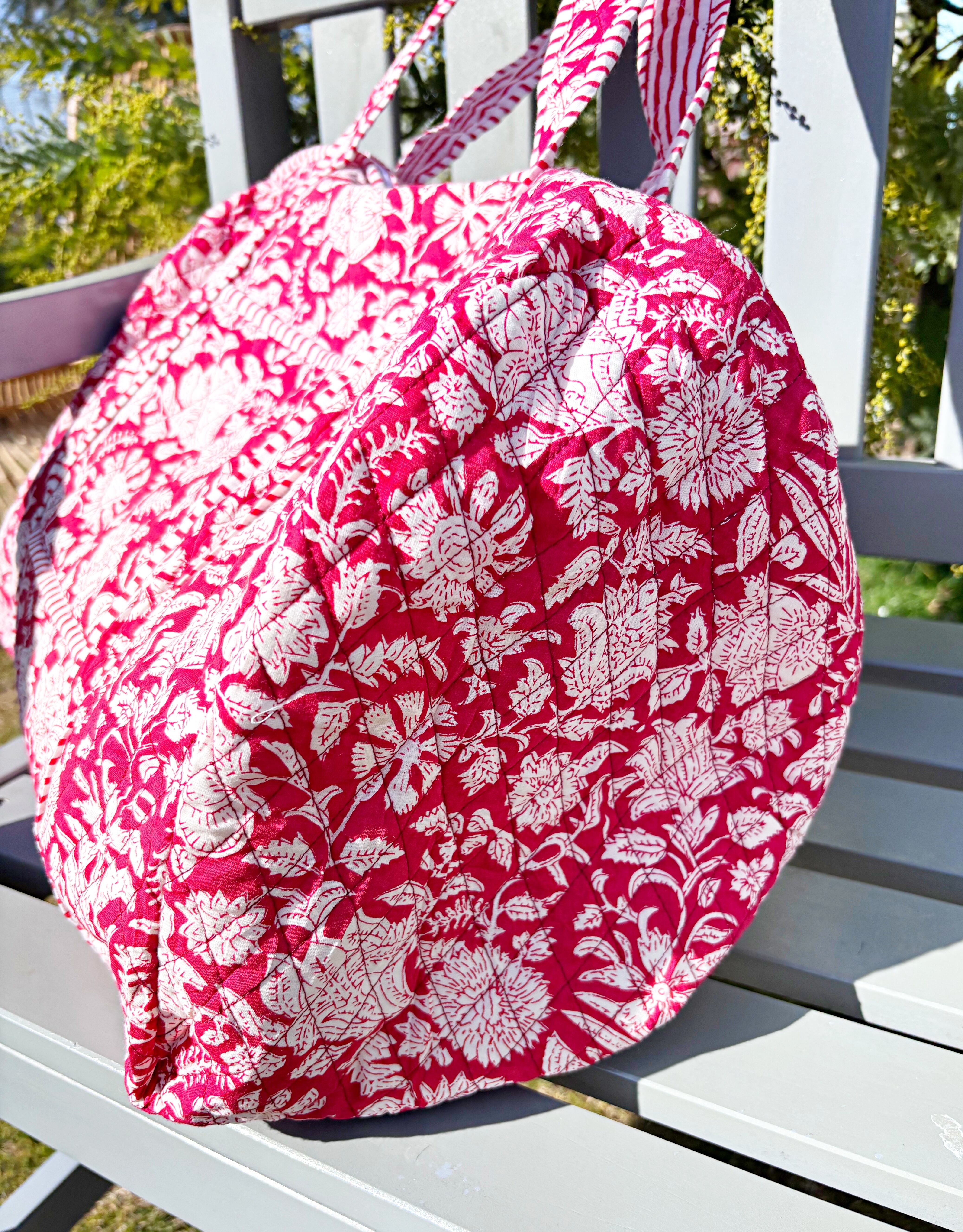 キルティング生地のハンドメイドの質感が温かく、ボタニカル柄が華やかな気分にさせてくれる綿布のボストンバッグです。