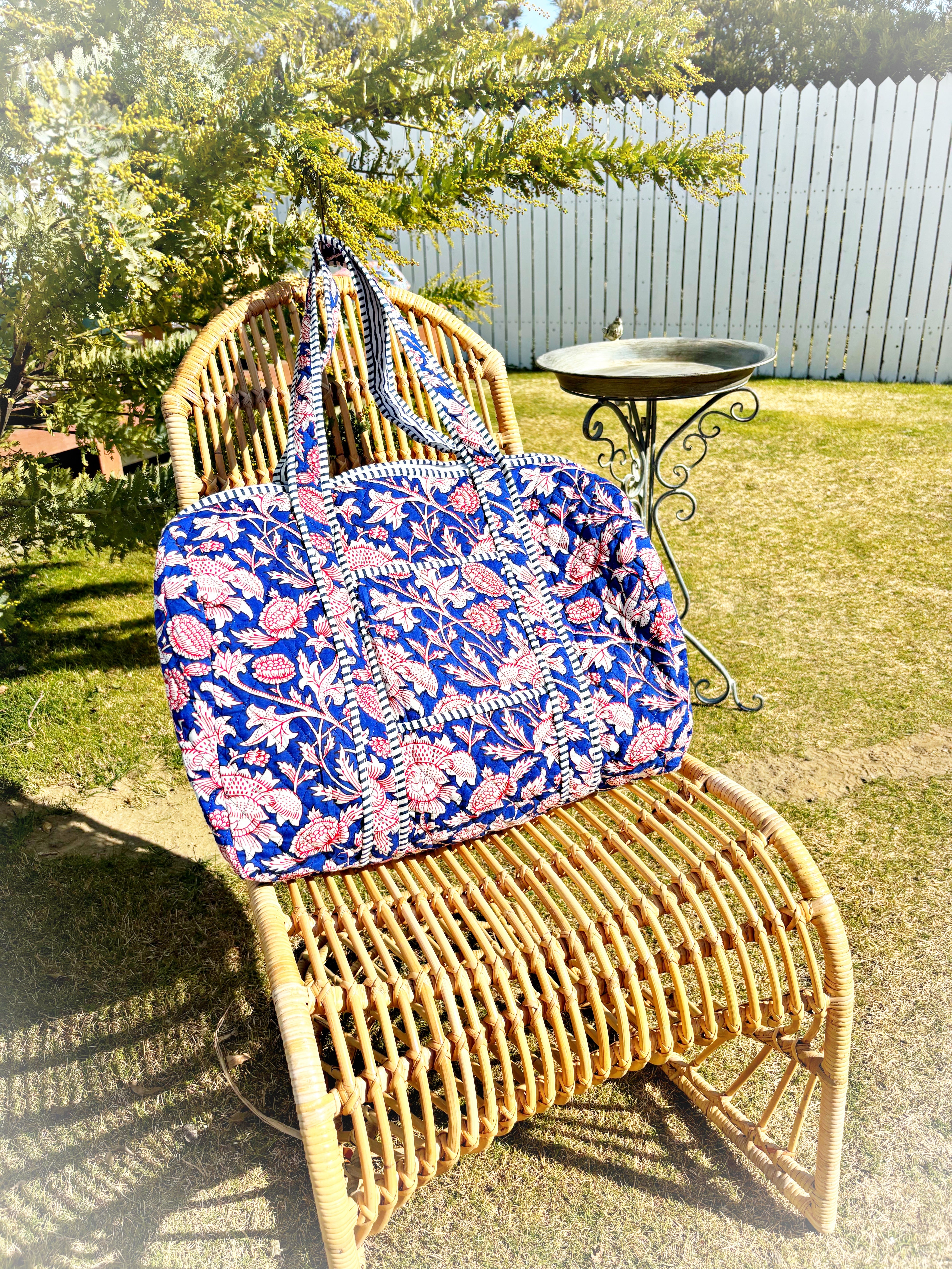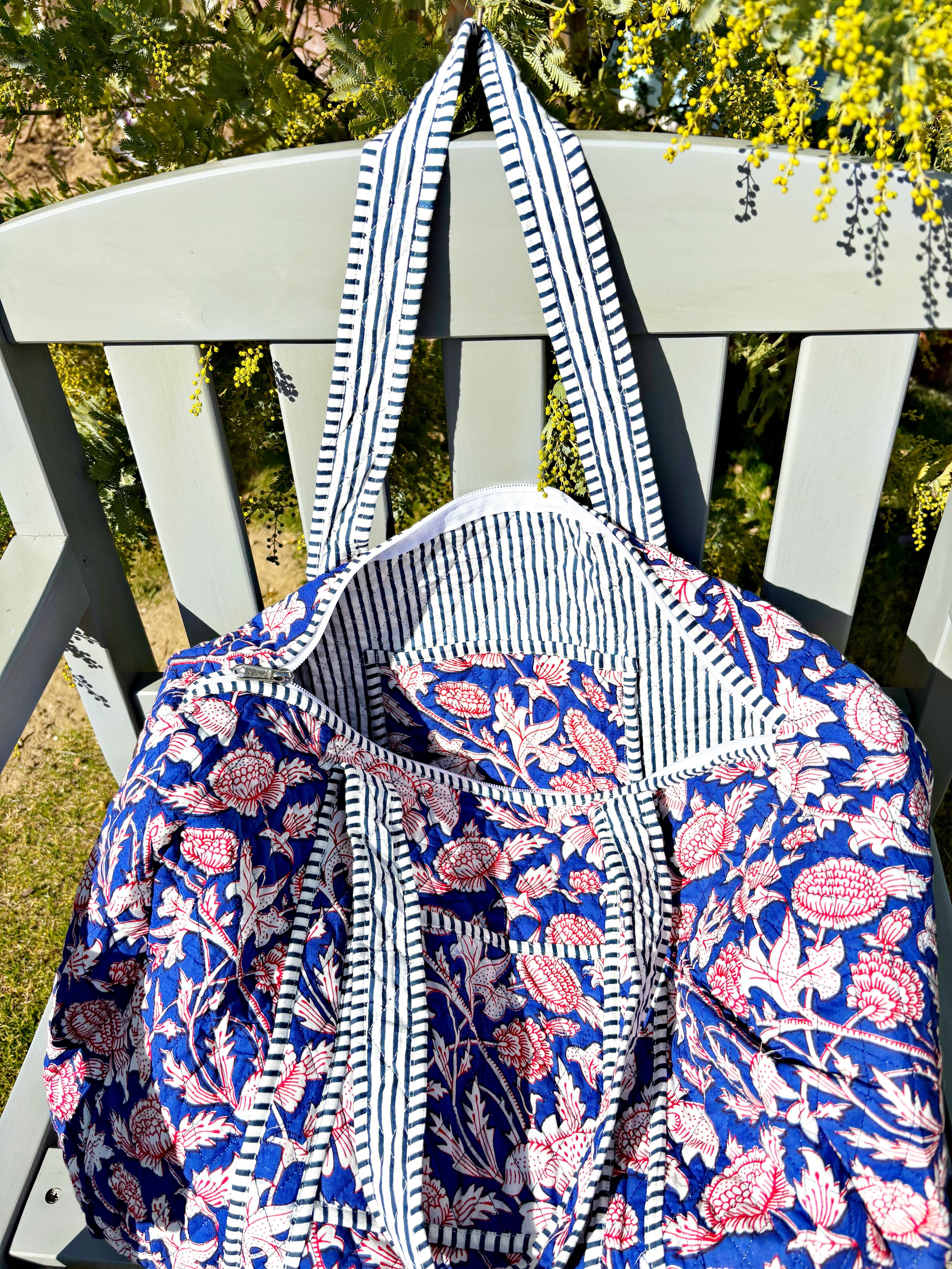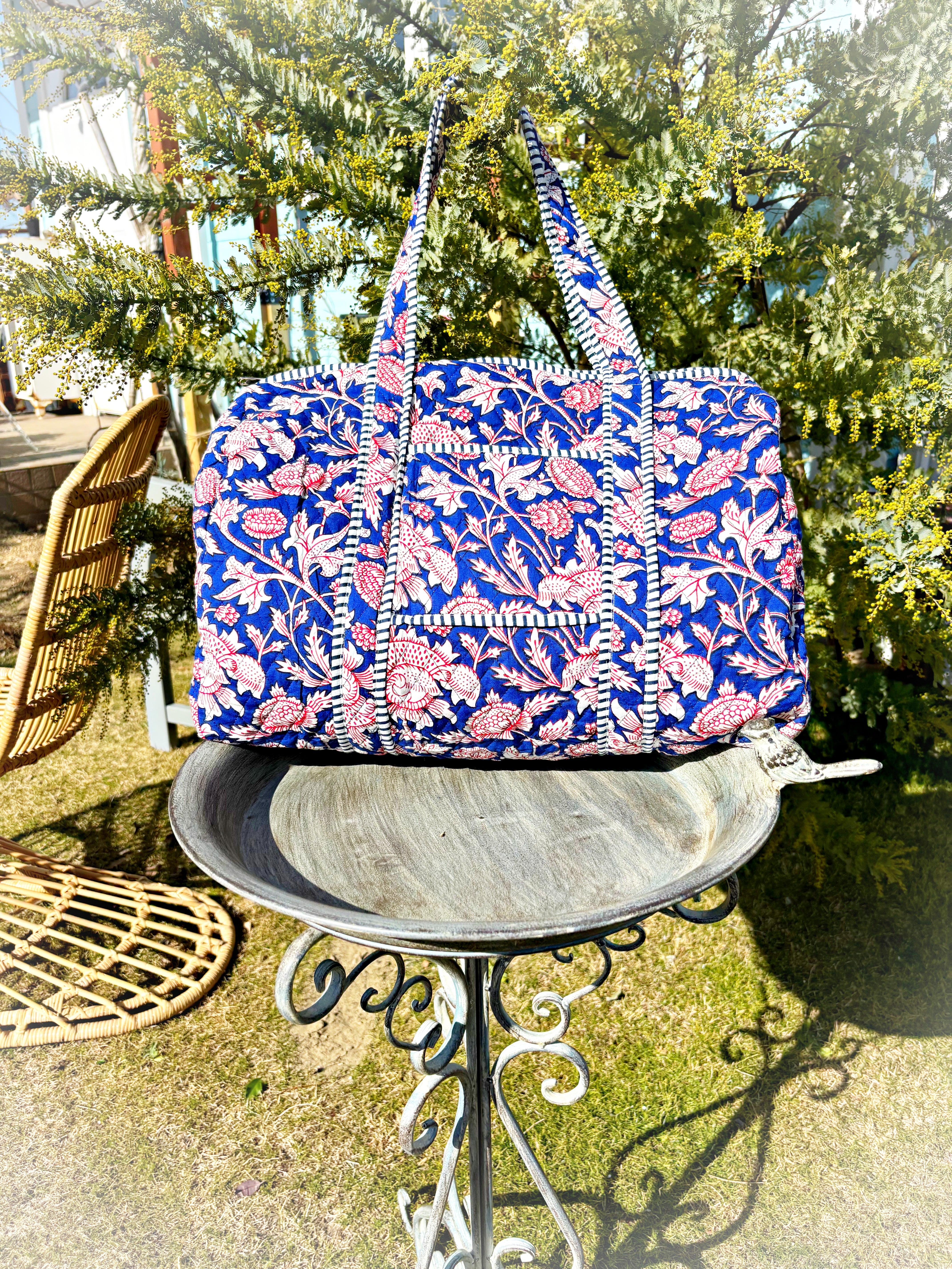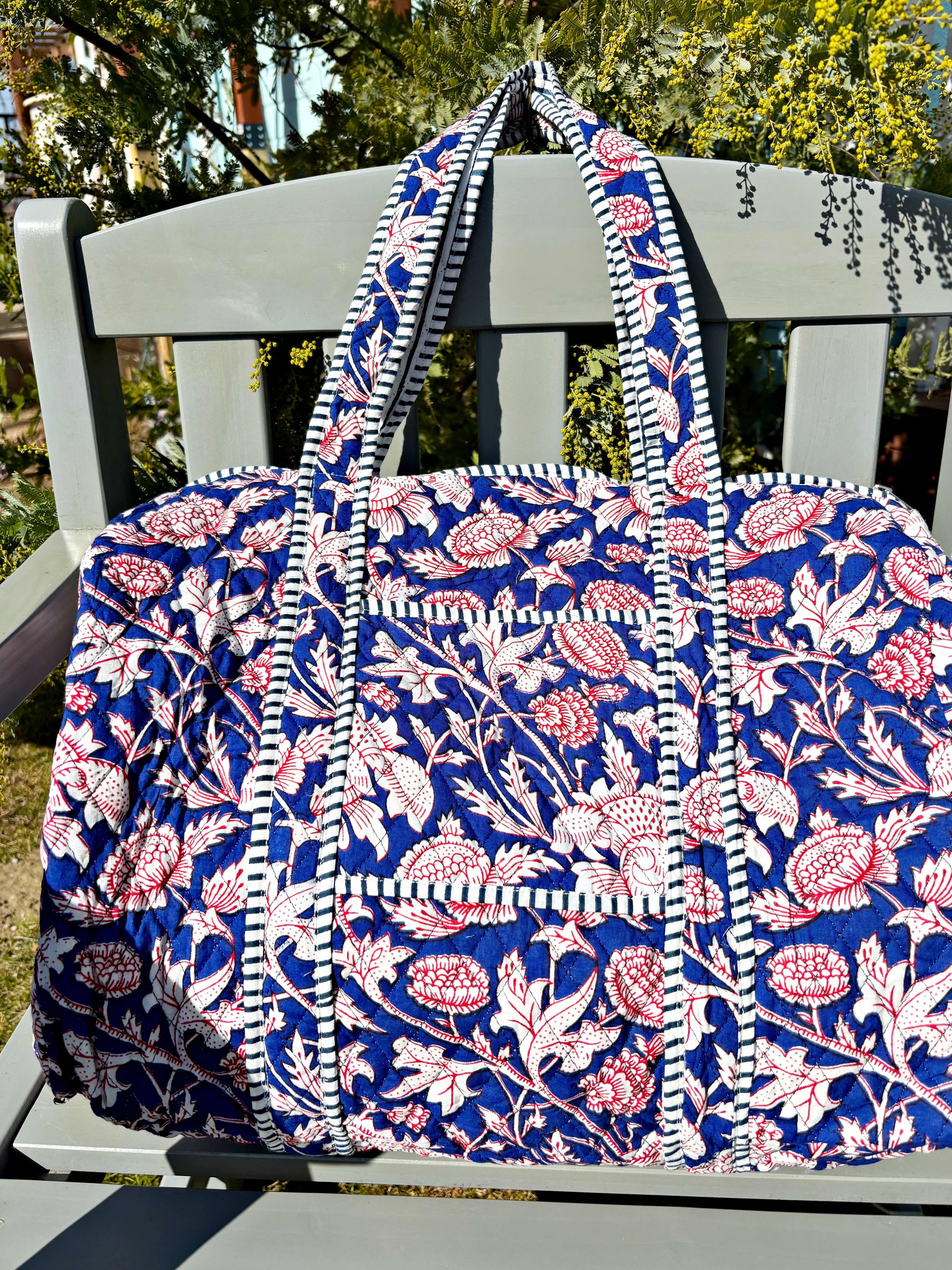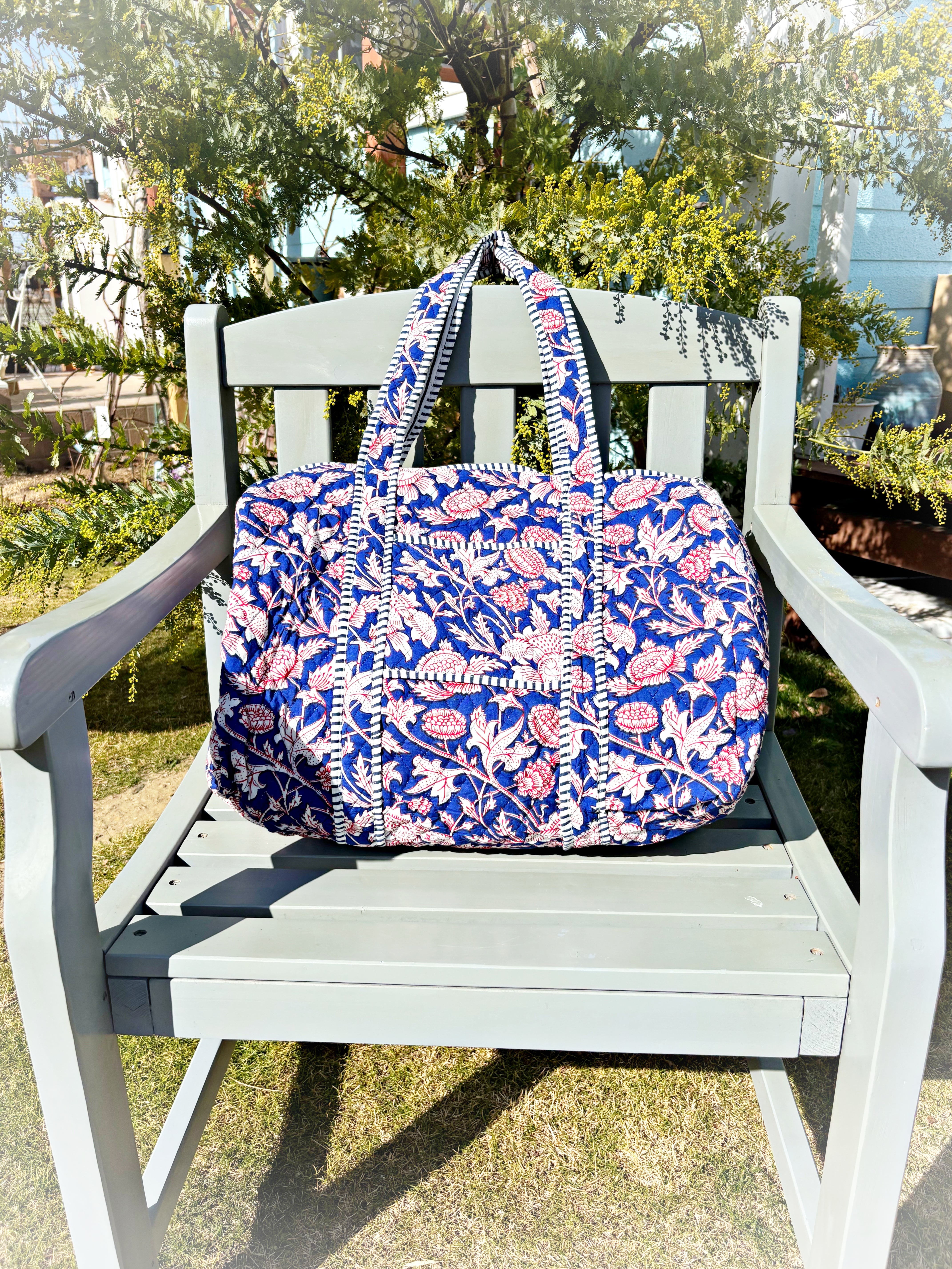 キルティング生地のハンドメイドの質感が温かく、ボタニカル柄が華やかな気分にさせてくれる綿布のボストンバッグです。