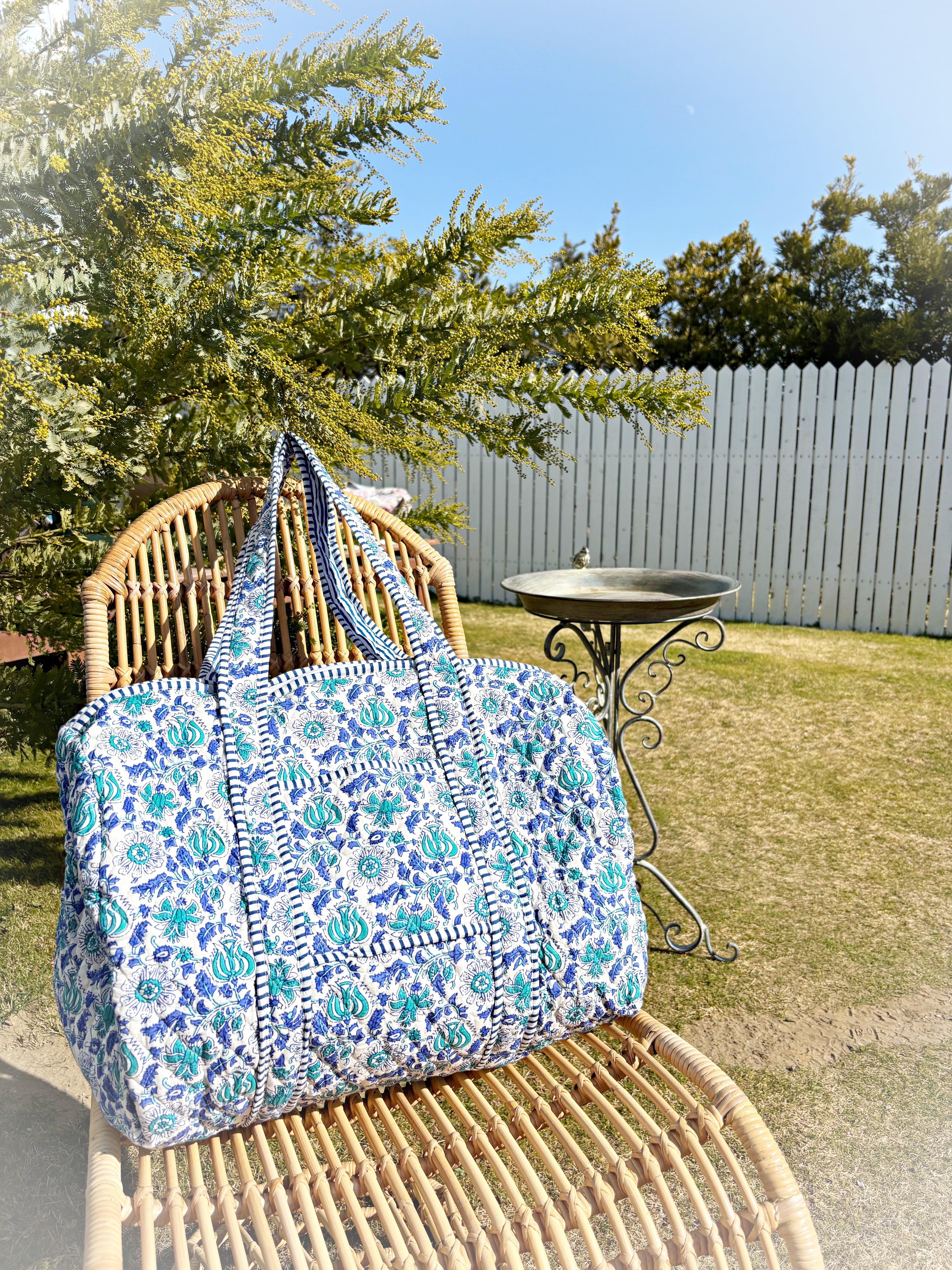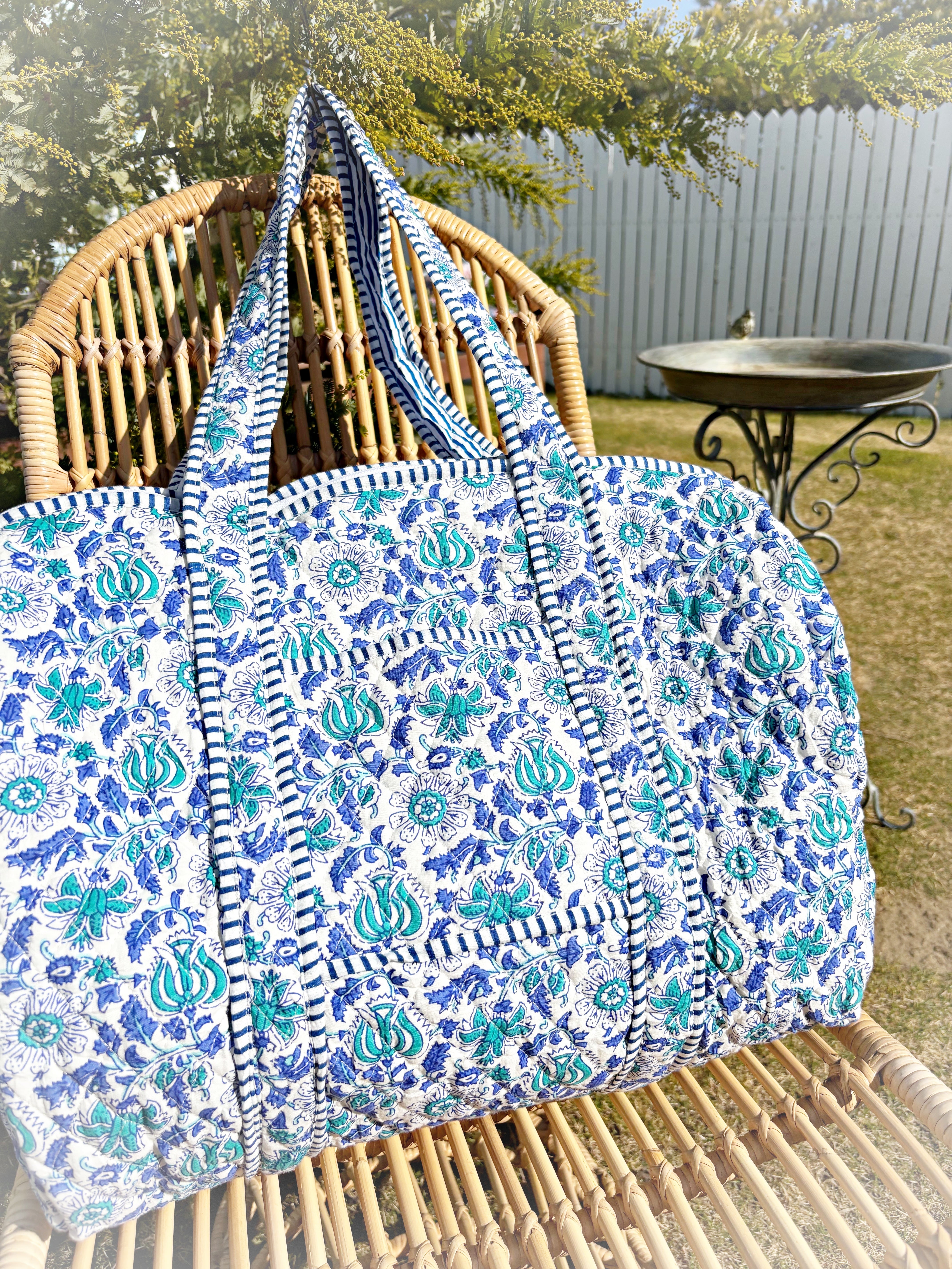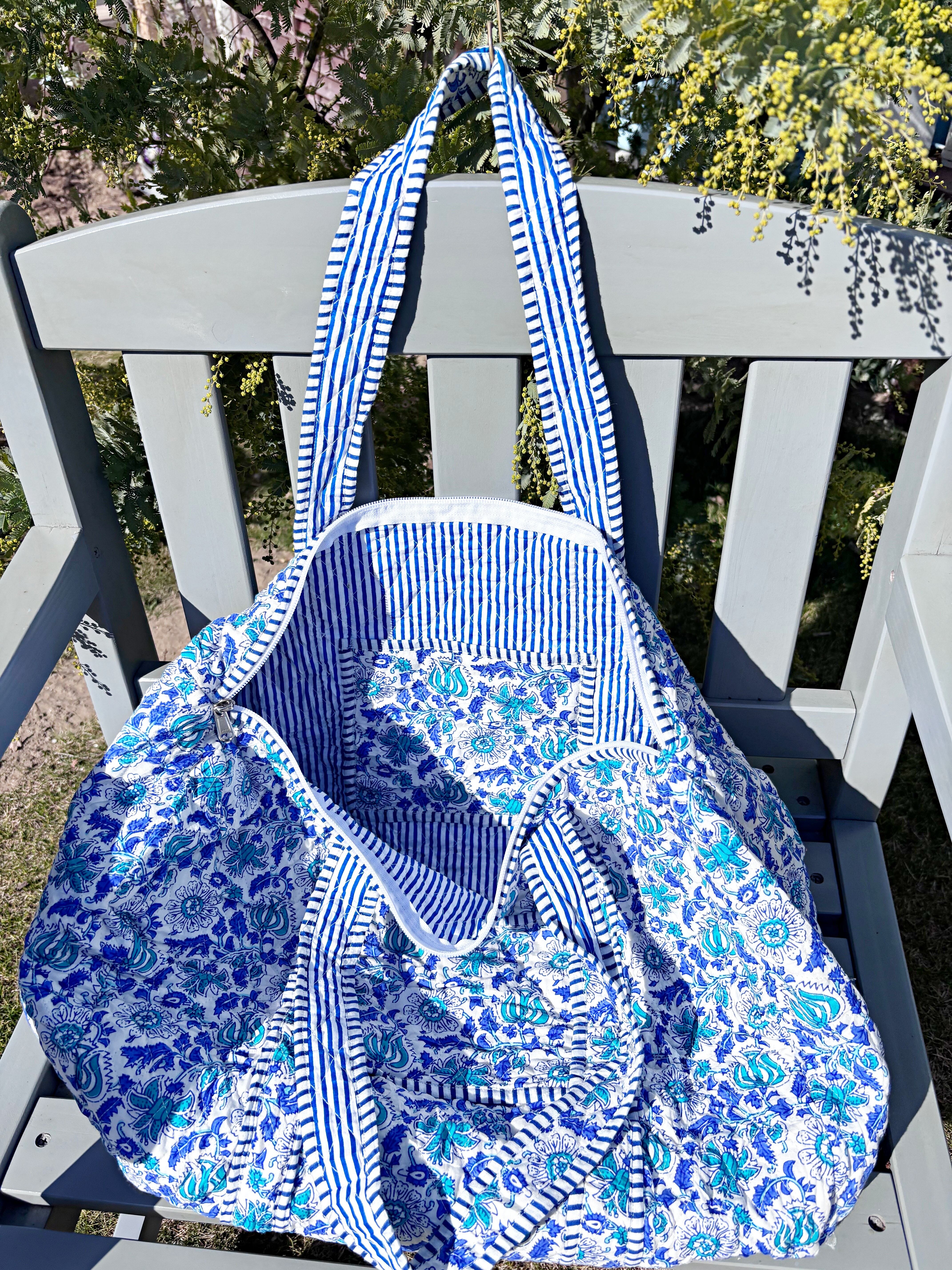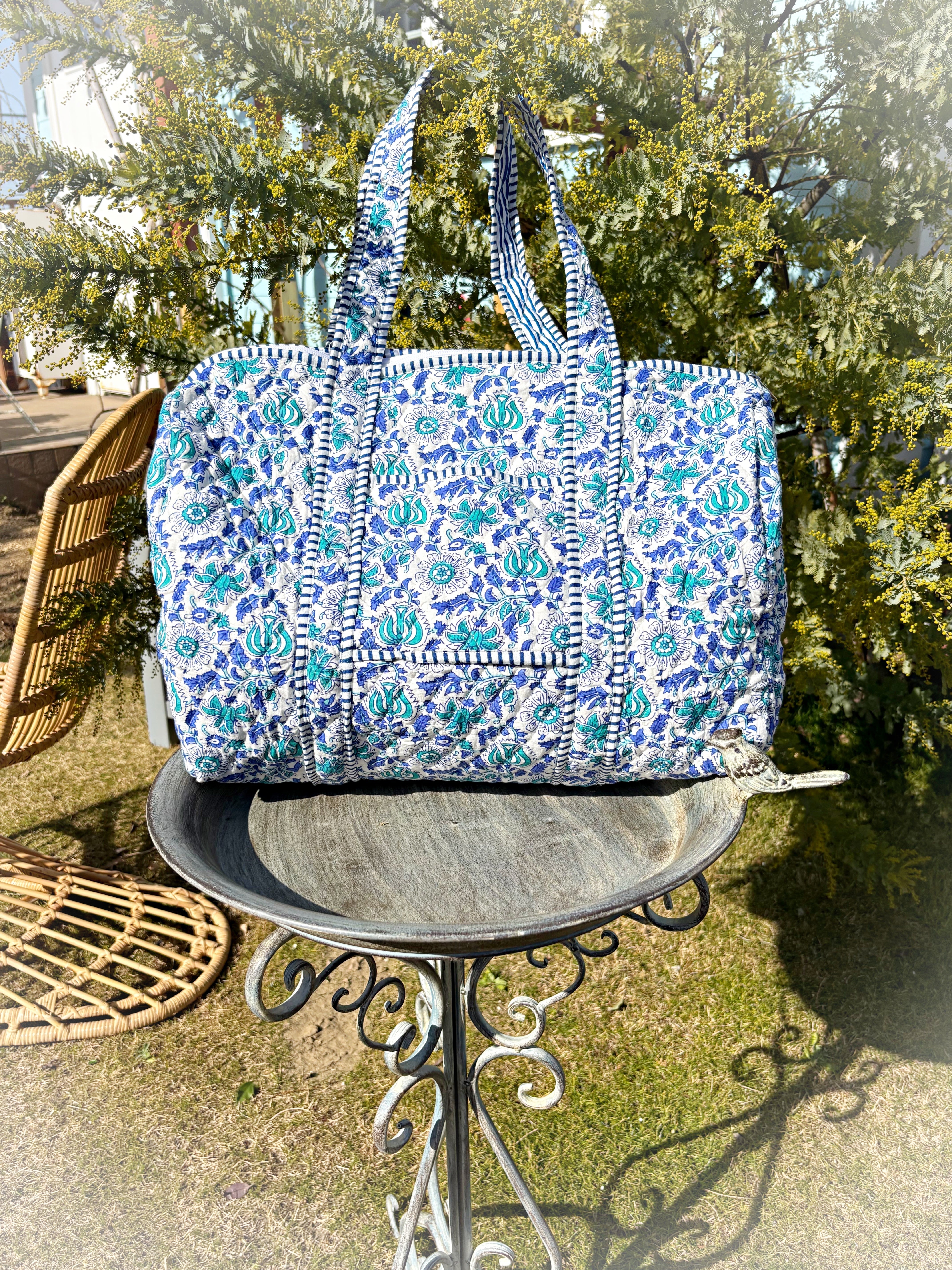 キルティング生地のハンドメイドの質感が温かく、ボタニカル柄が華やかな気分にさせてくれる綿布のボストンバッグです。