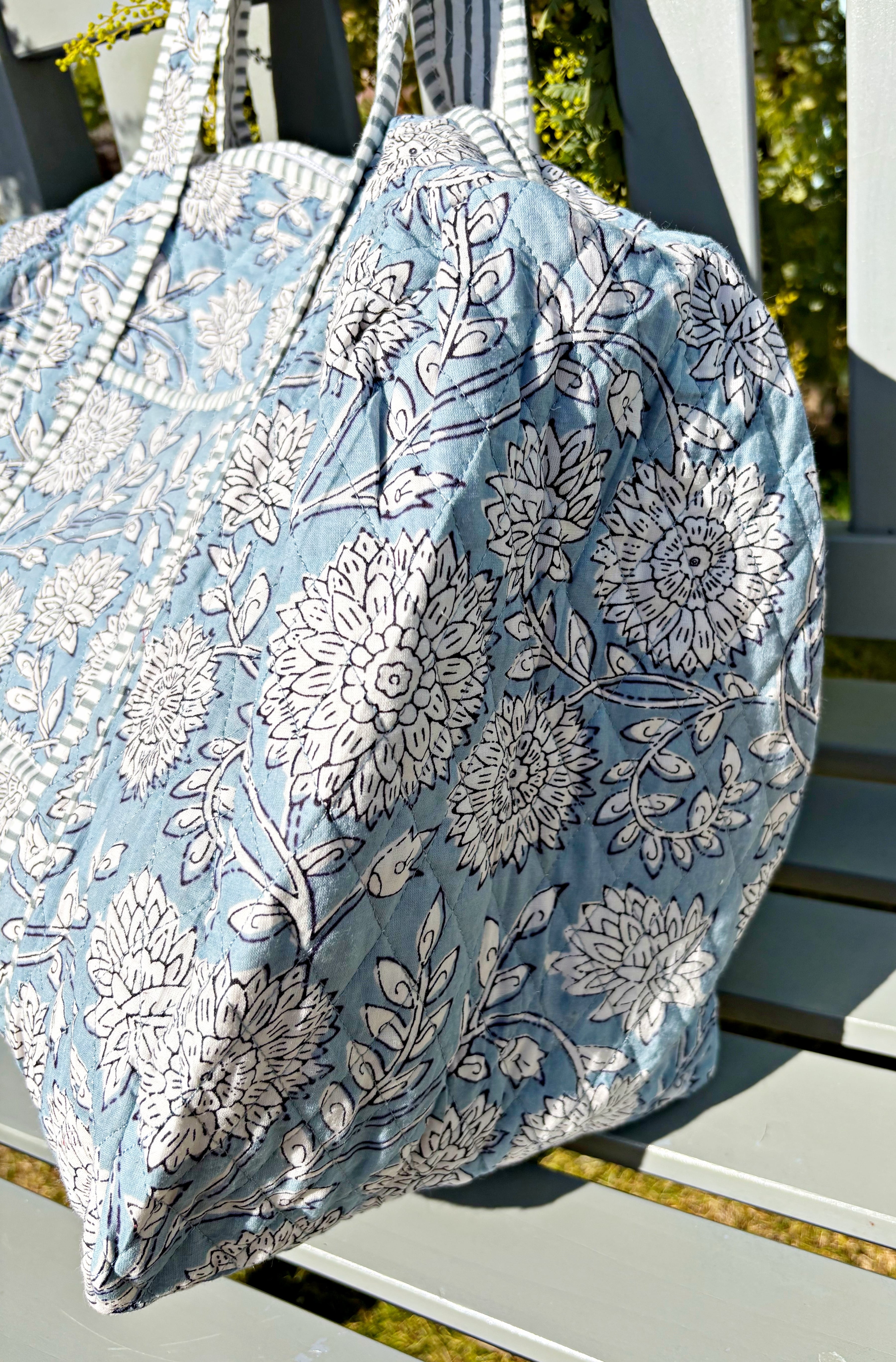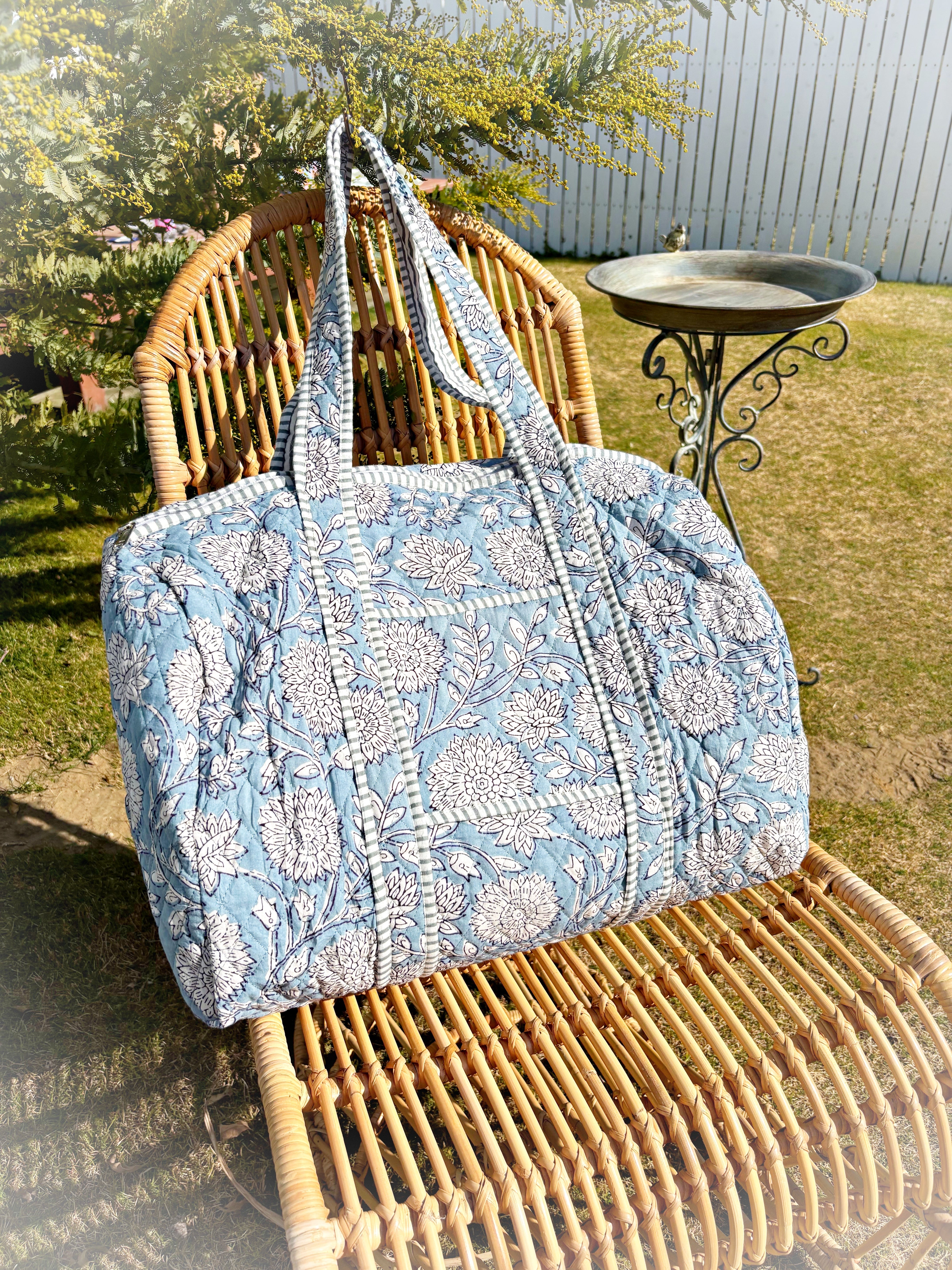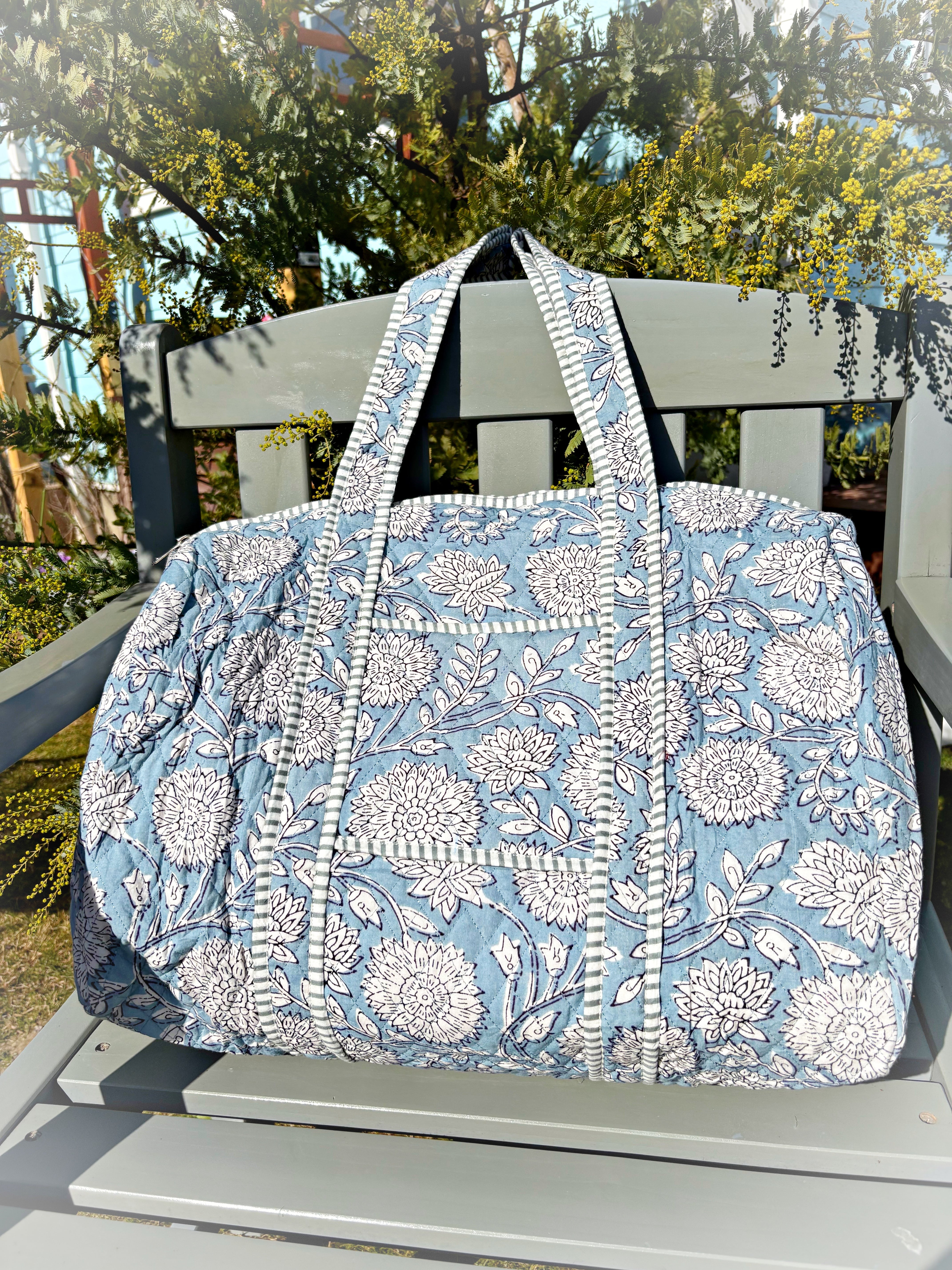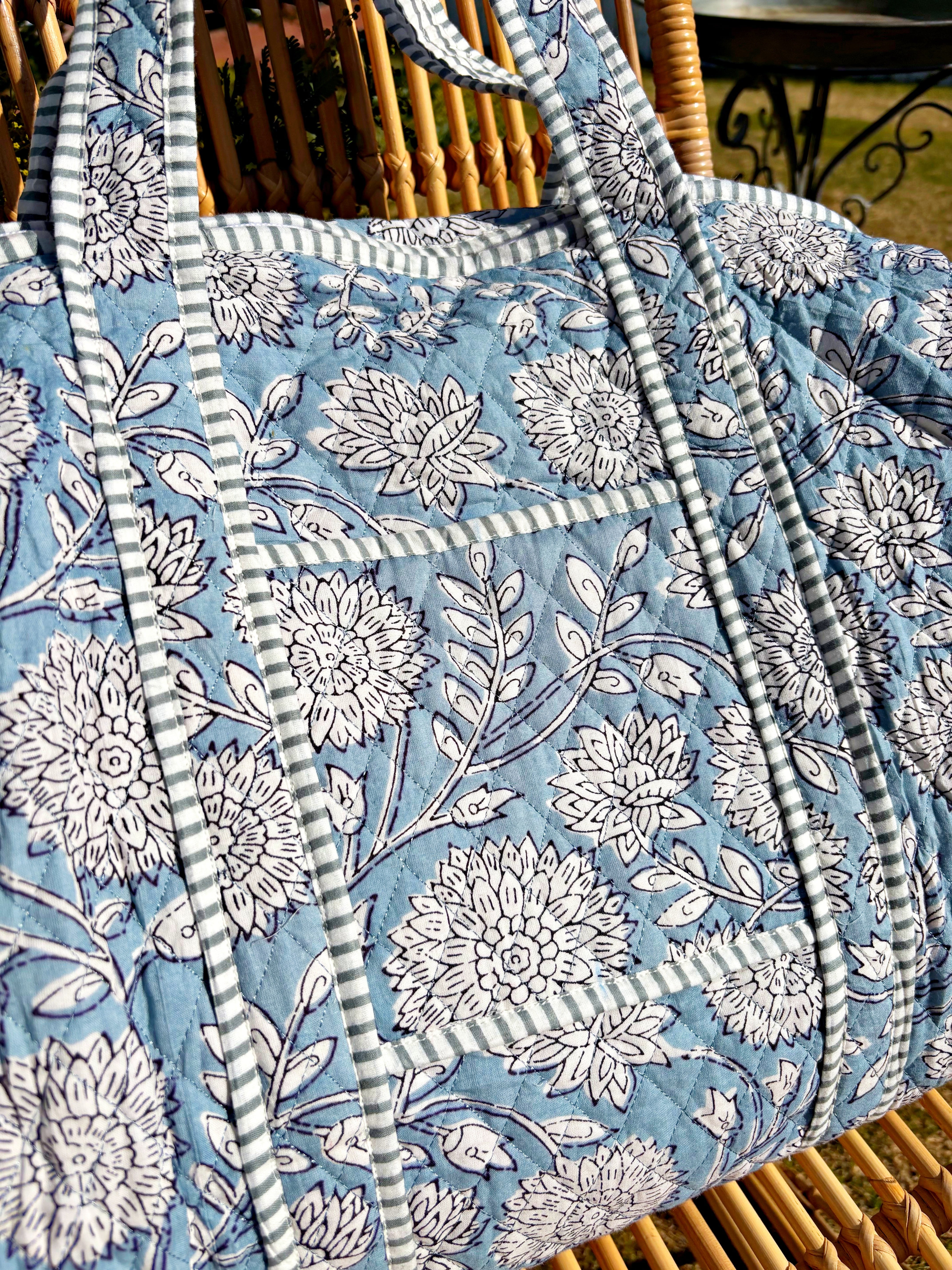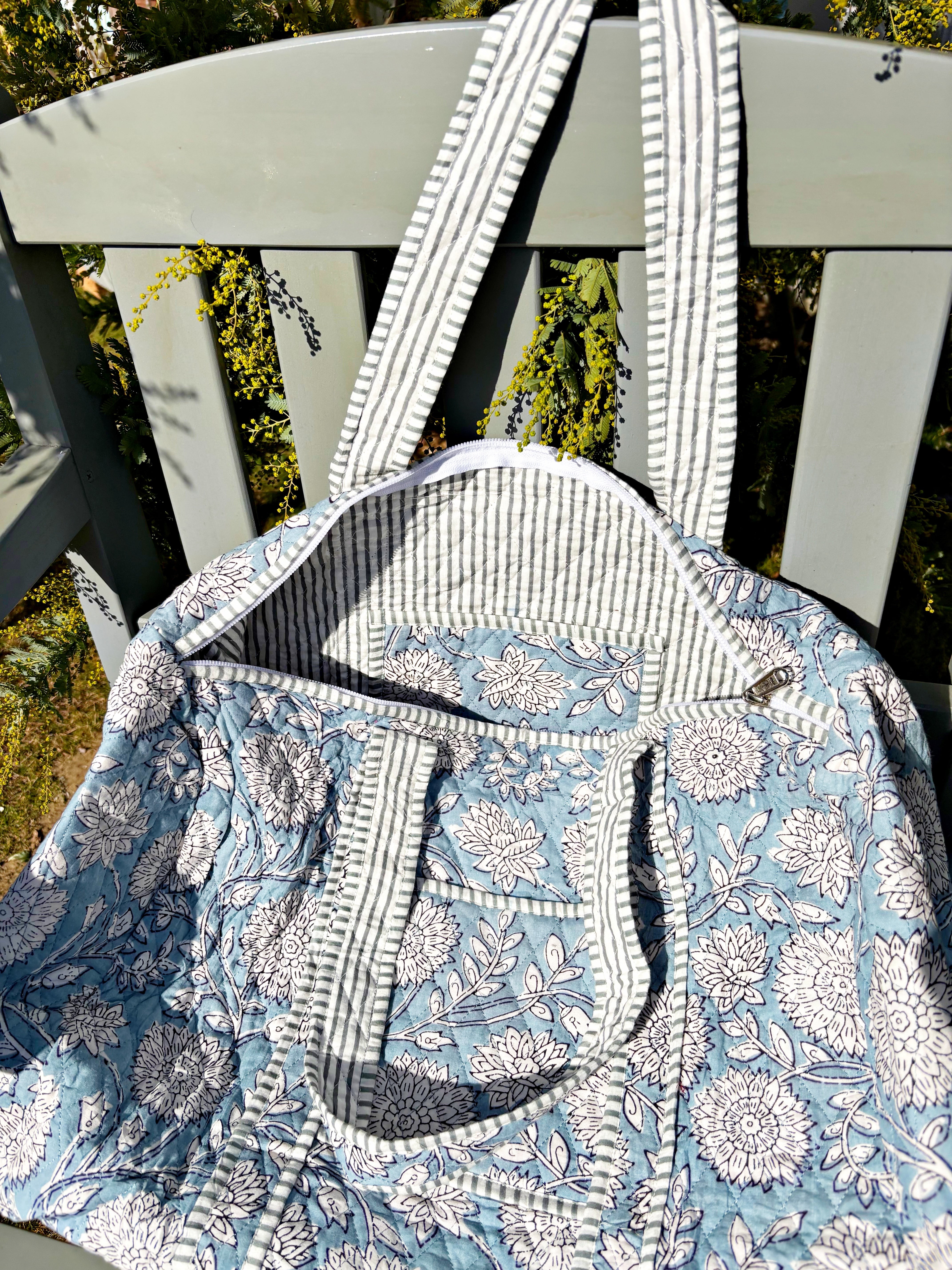 キルティング生地のハンドメイドの質感が温かく、ボタニカル柄が華やかな気分にさせてくれる綿布のボストンバッグです。