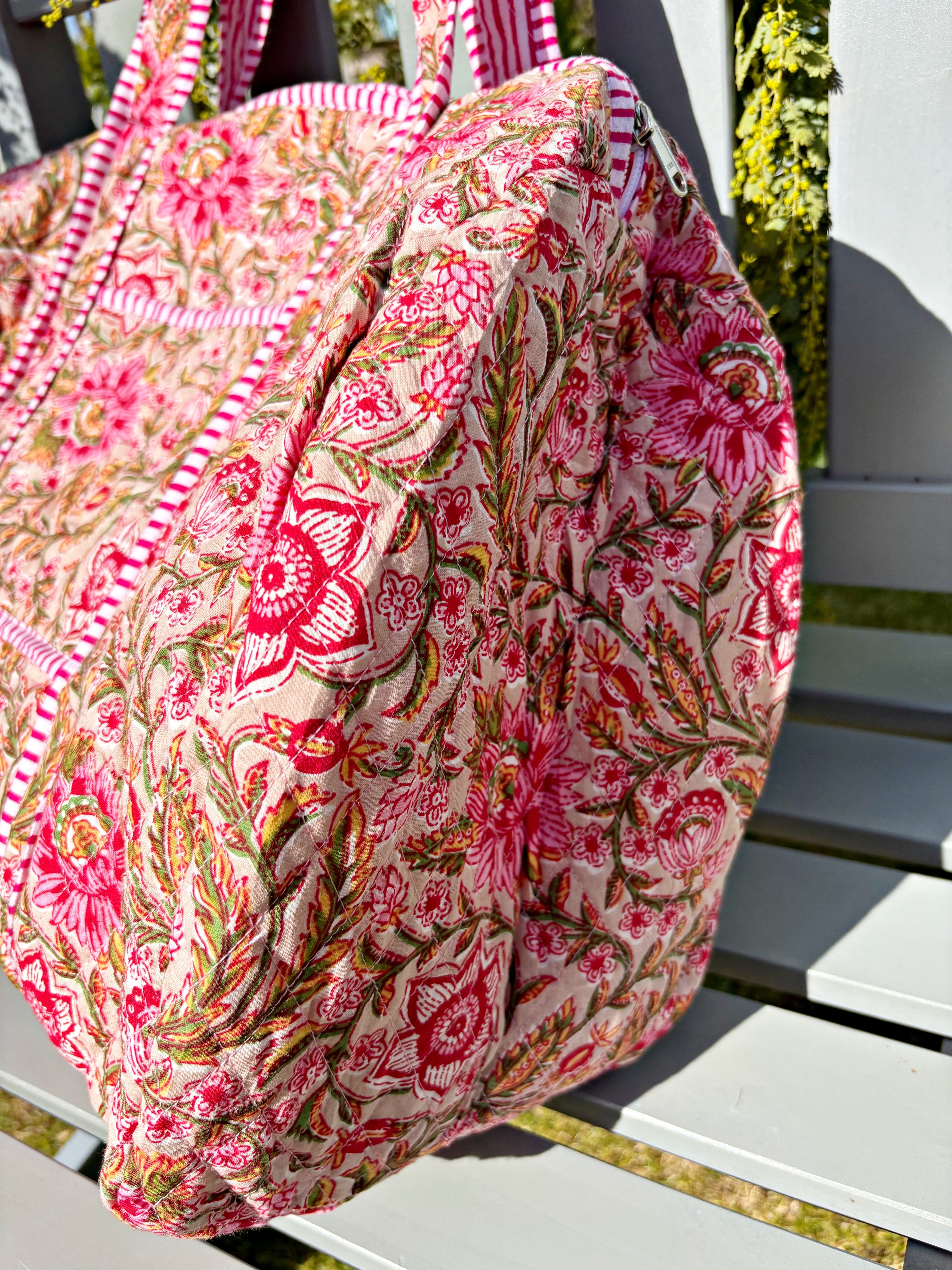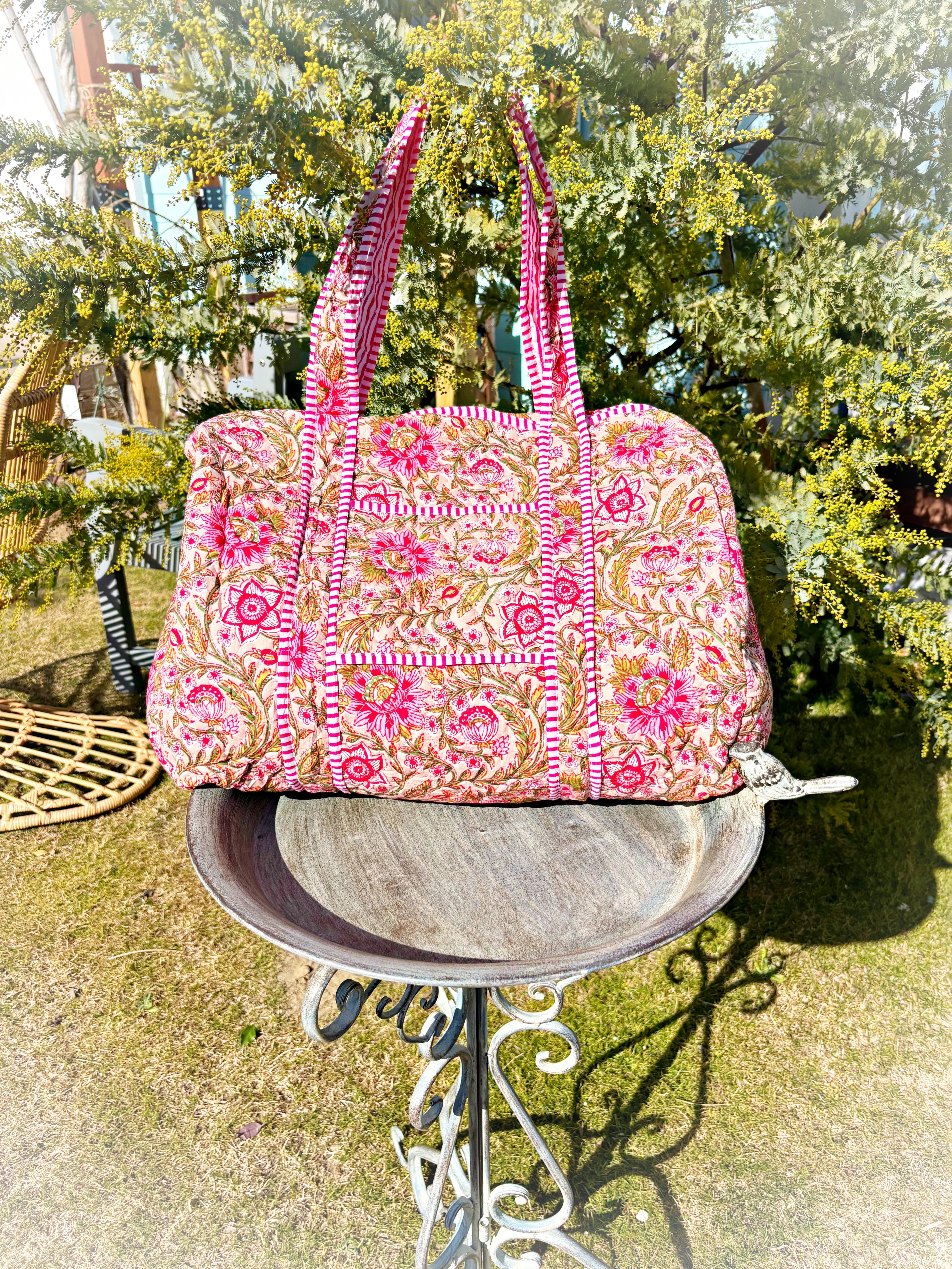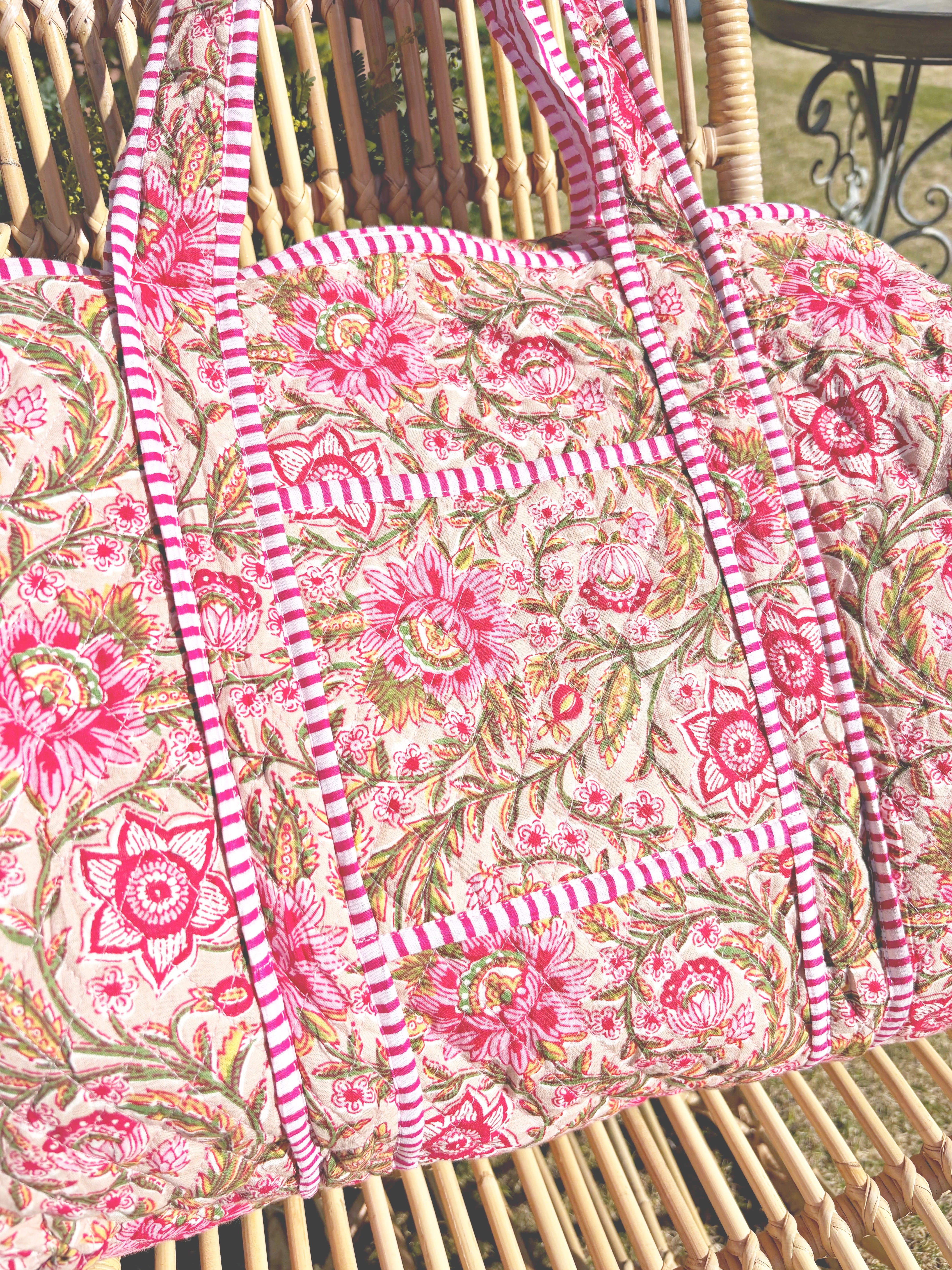 キルティング生地のハンドメイドの質感が温かく、ボタニカル柄が華やかな気分にさせてくれる綿布のボストンバッグです。