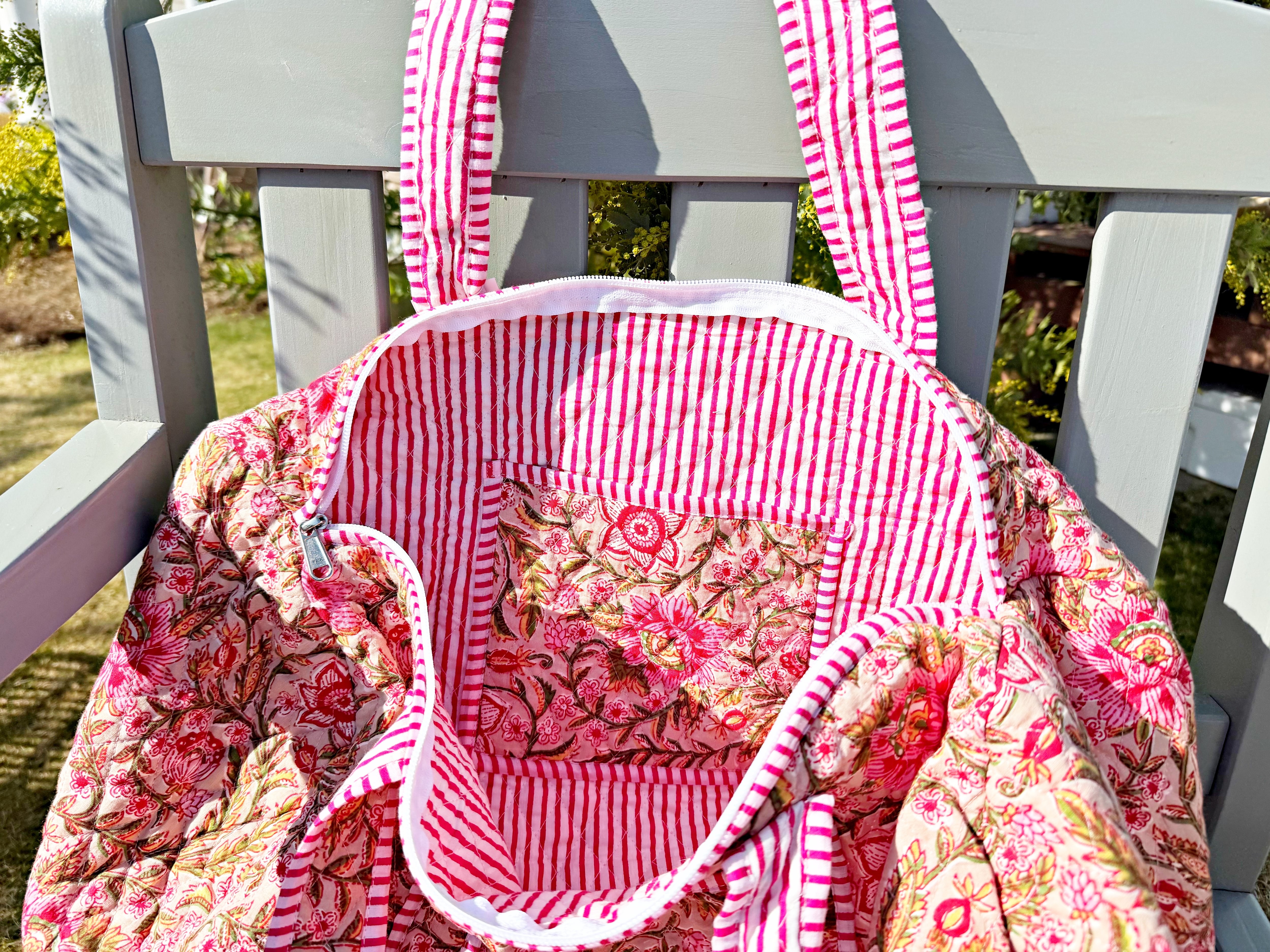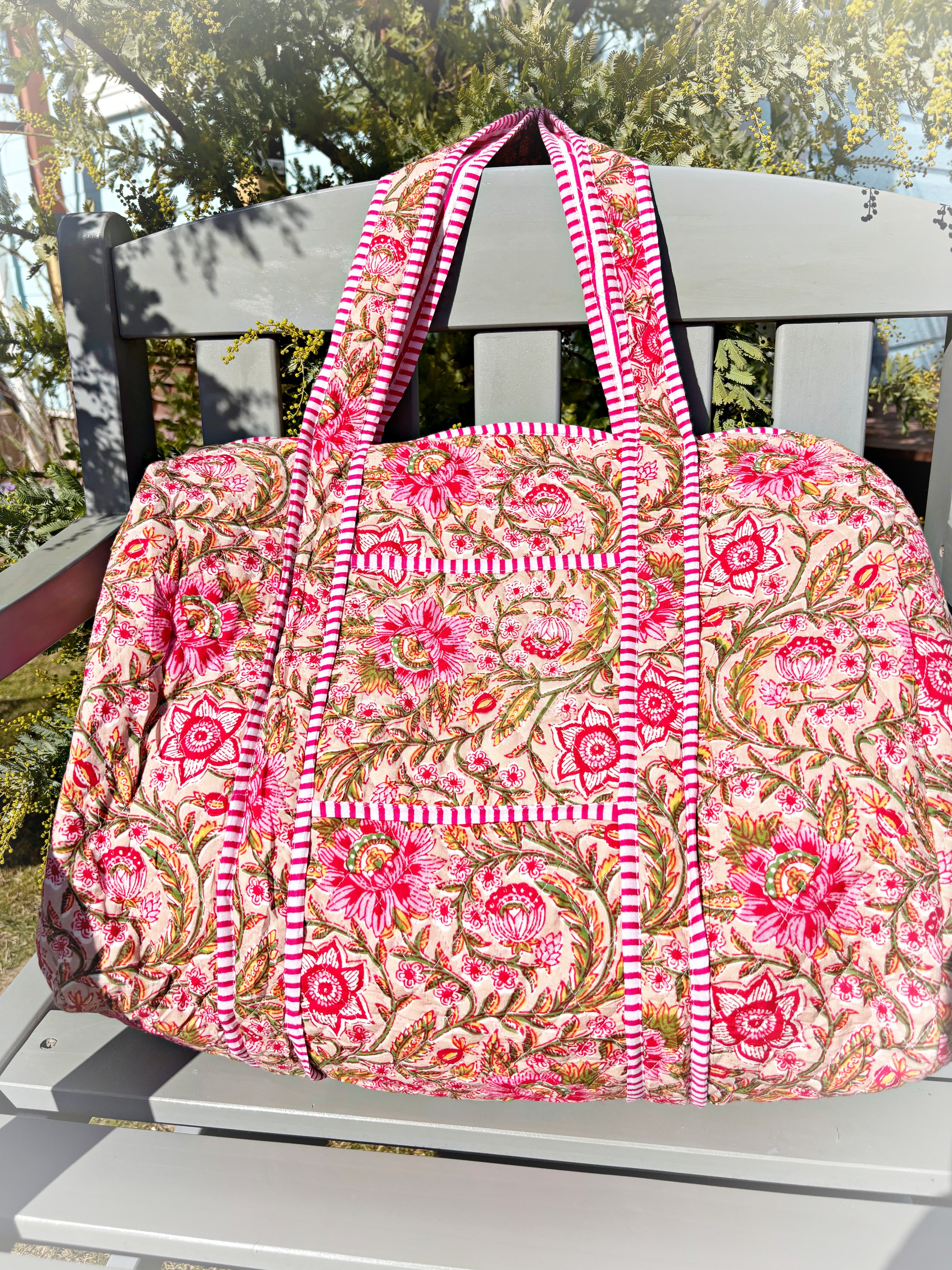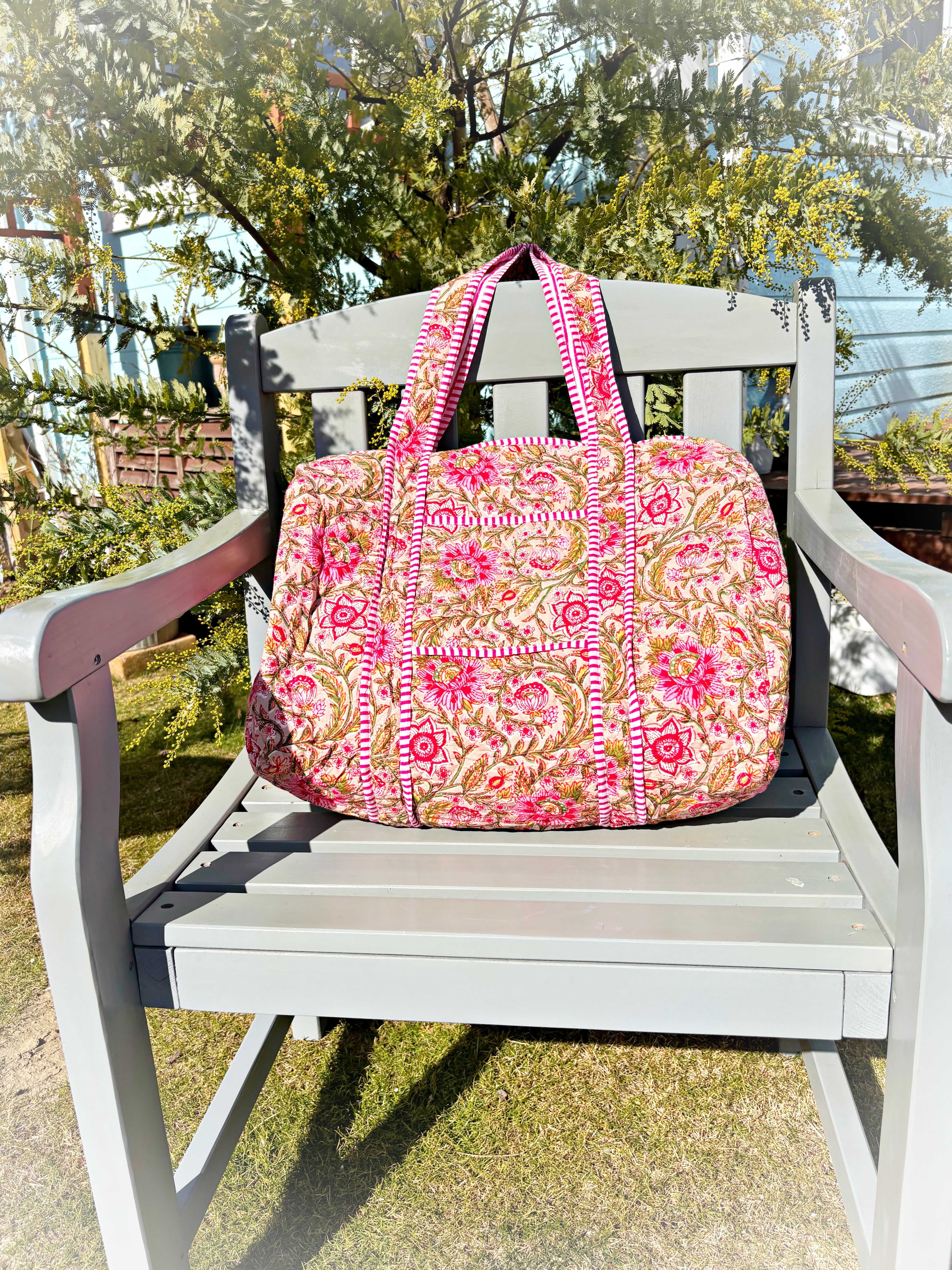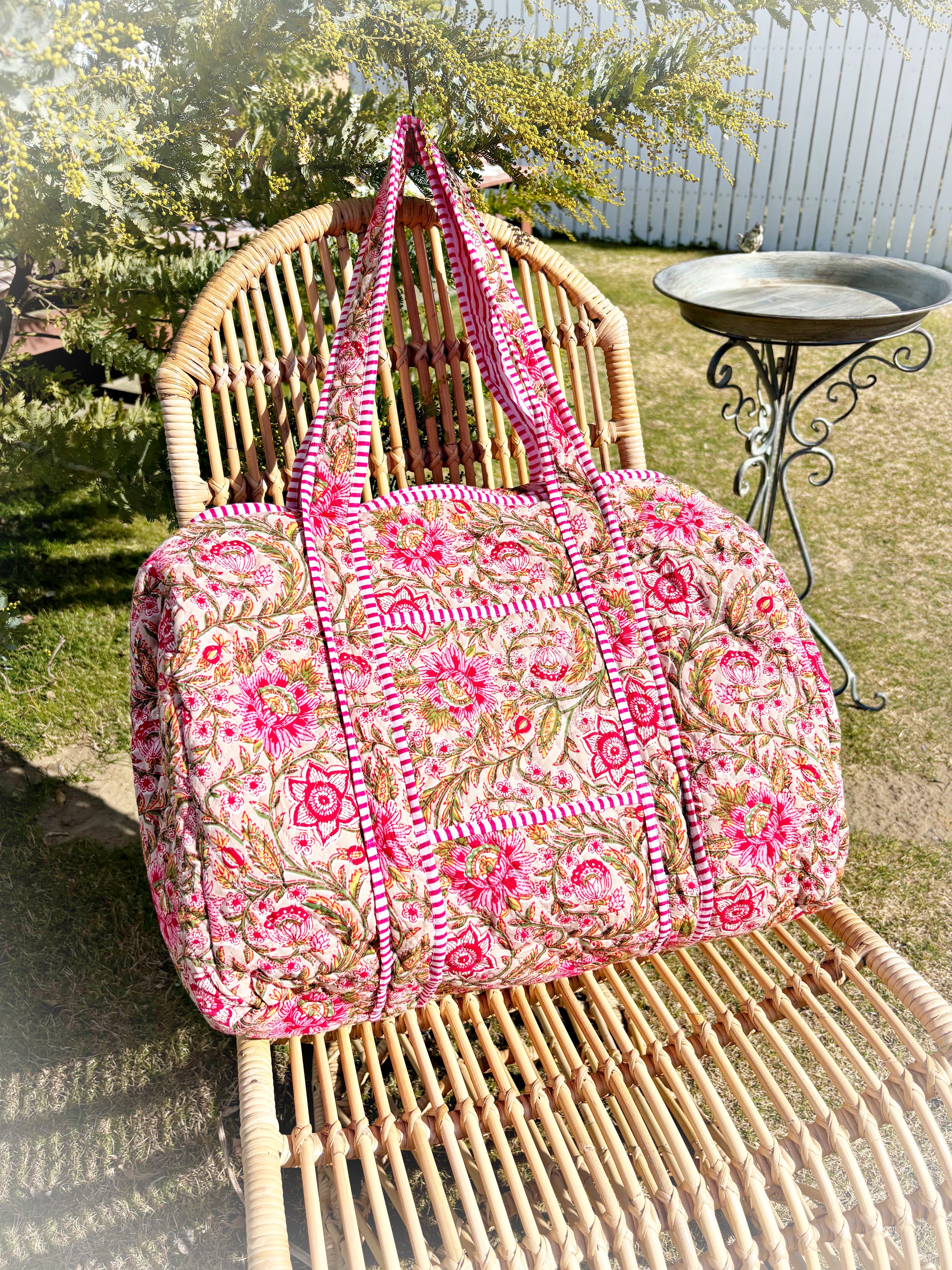 キルティング生地のハンドメイドの質感が温かく、ボタニカル柄が華やかな気分にさせてくれる綿布のボストンバッグです。