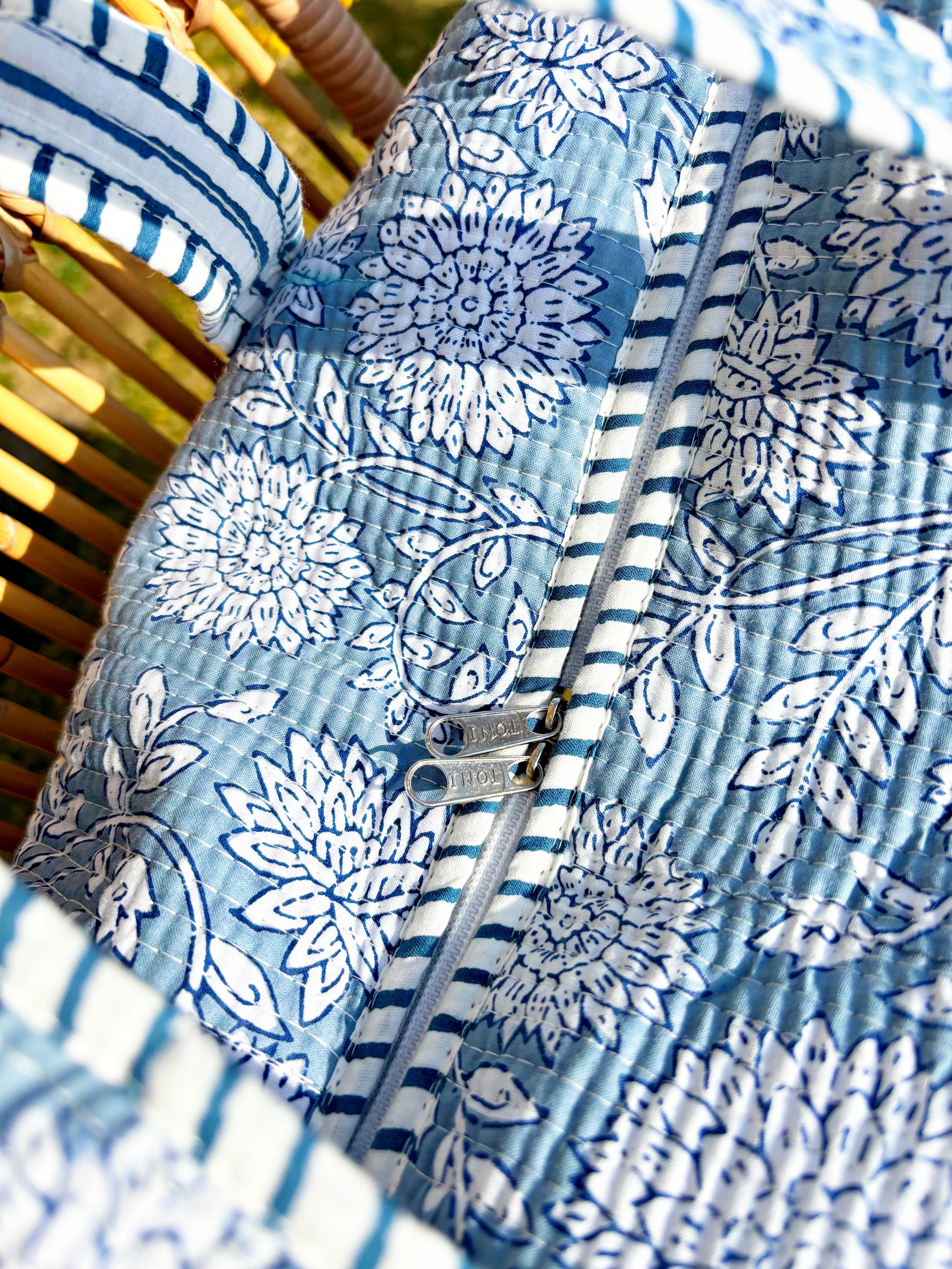 生地はインドの伝統的な技法〈ブロックプリント〉で染色されており、ブロックプリント独特の素朴で可愛らしい模様が特徴的です。