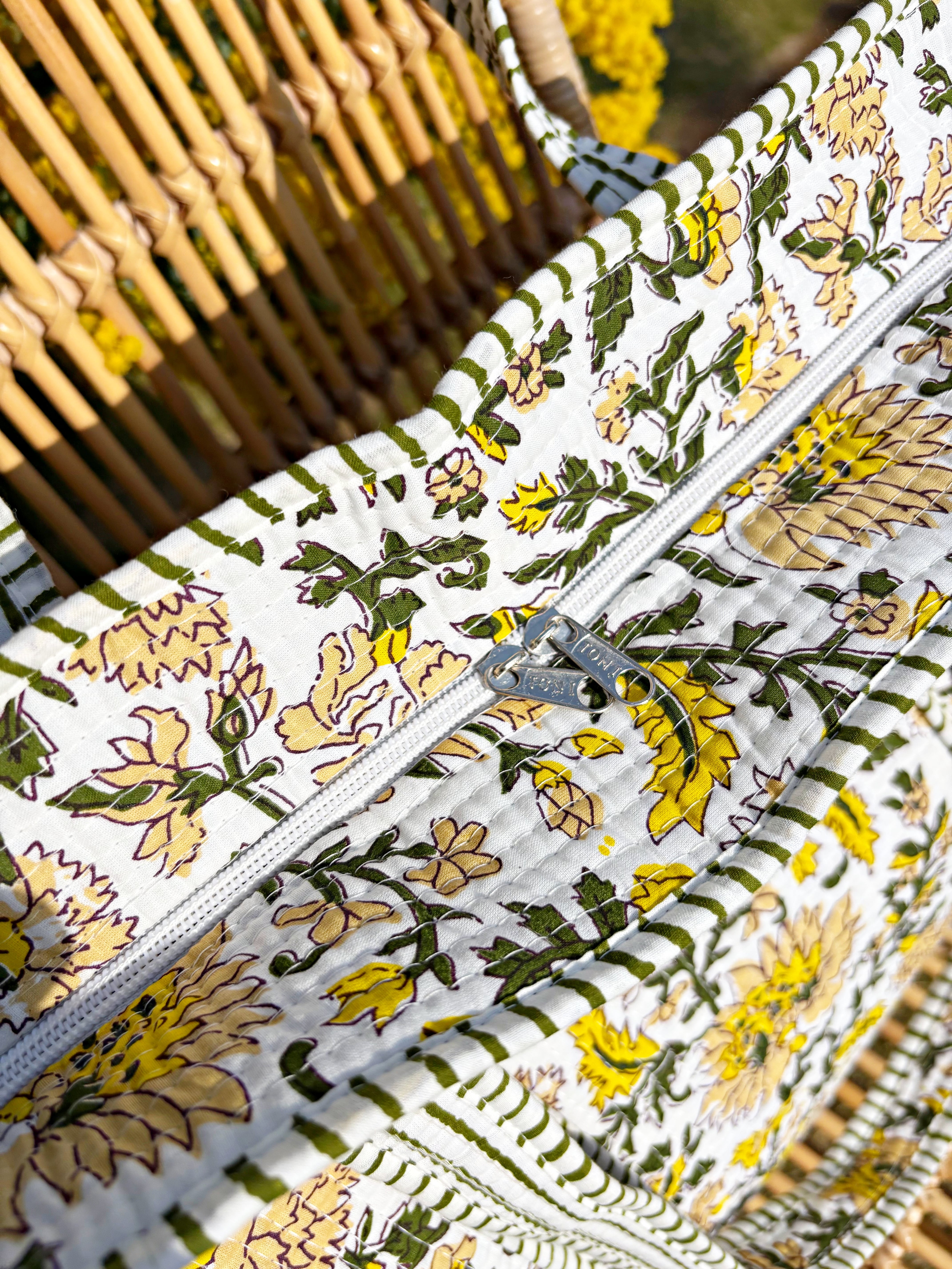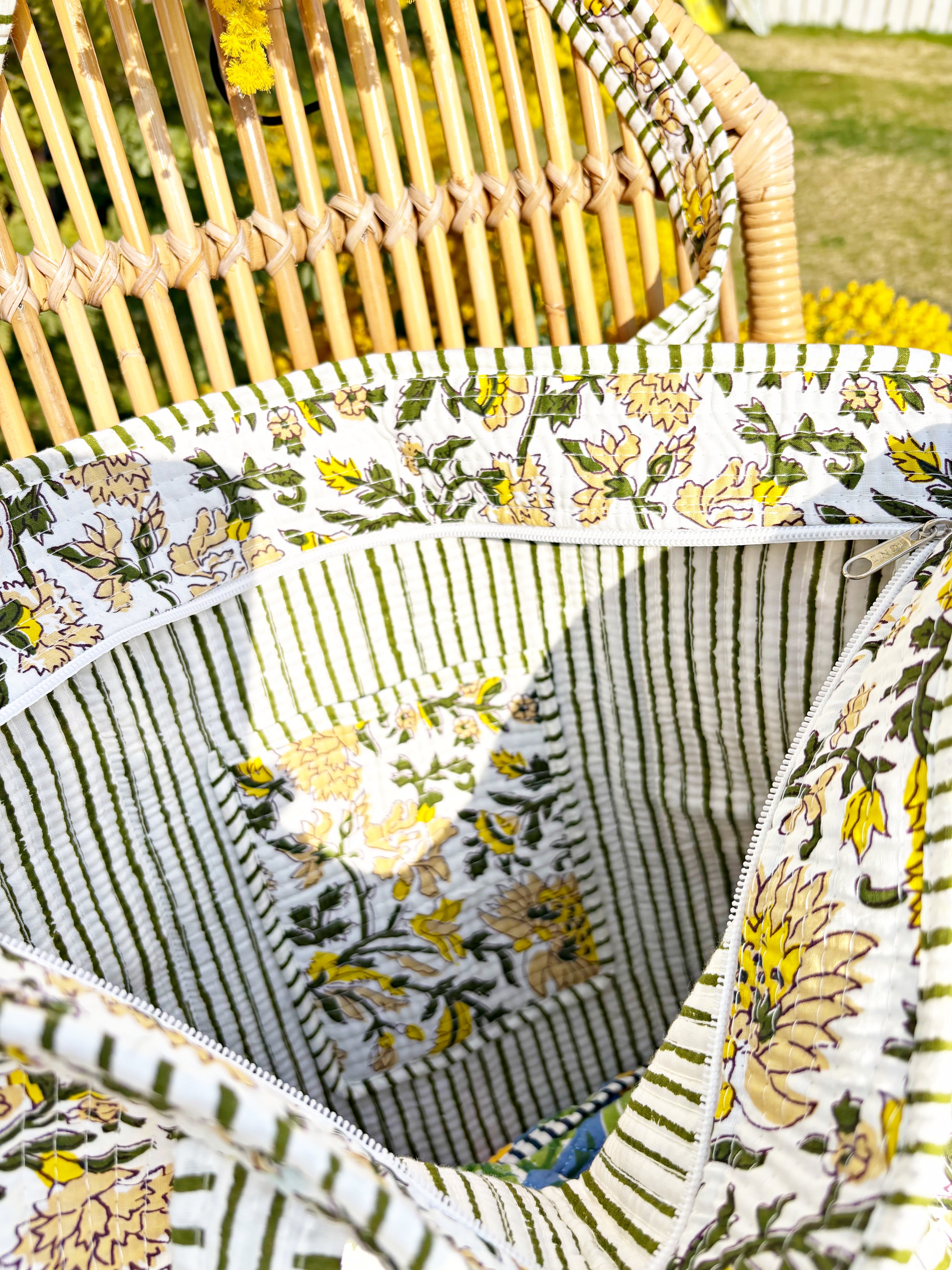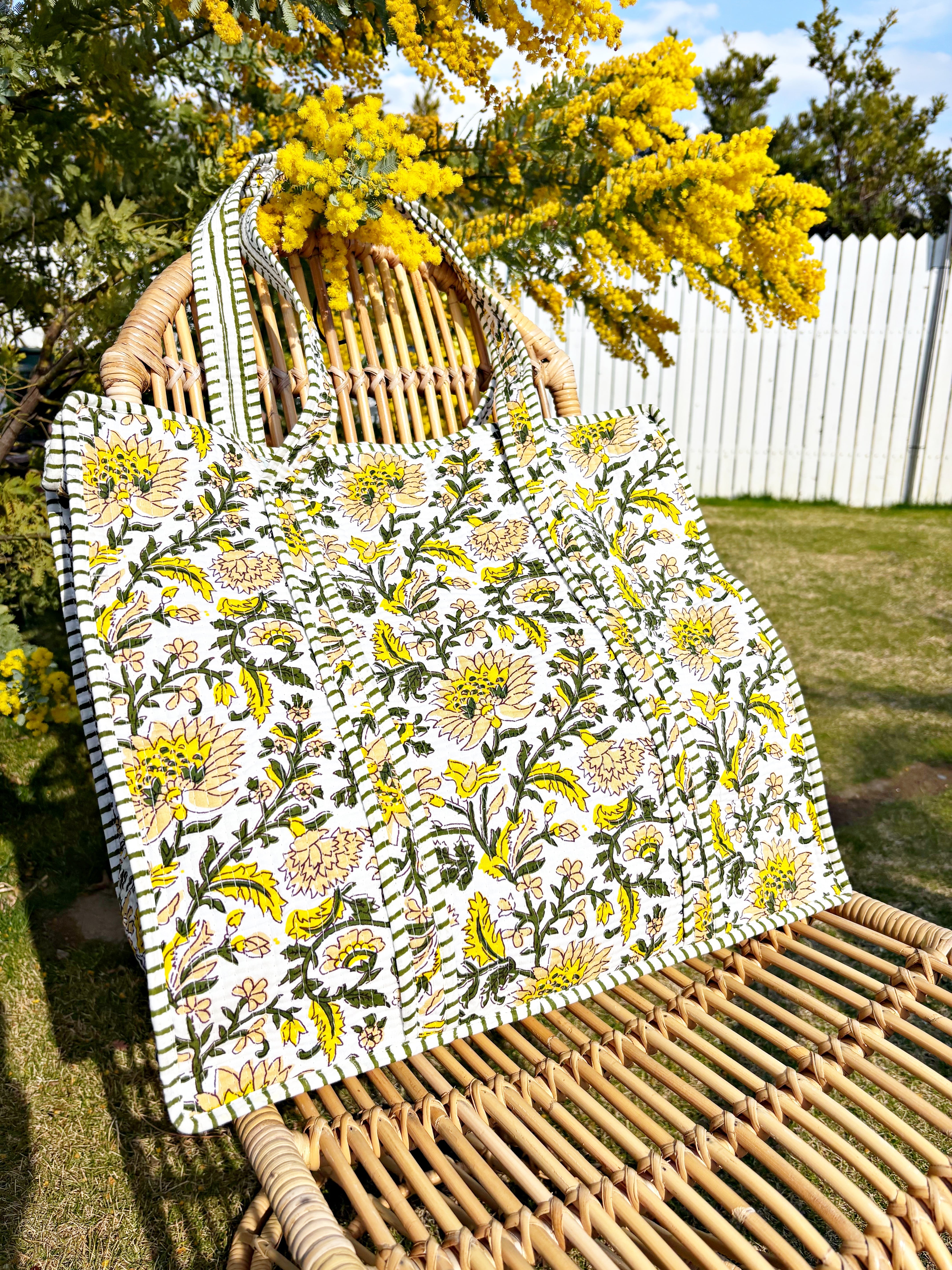 キルティング生地のハンドメイドの質感が温かく、ボタニカル柄が華やかな気分にさせてくれる使い勝手の良い綿布のトートバッグです。