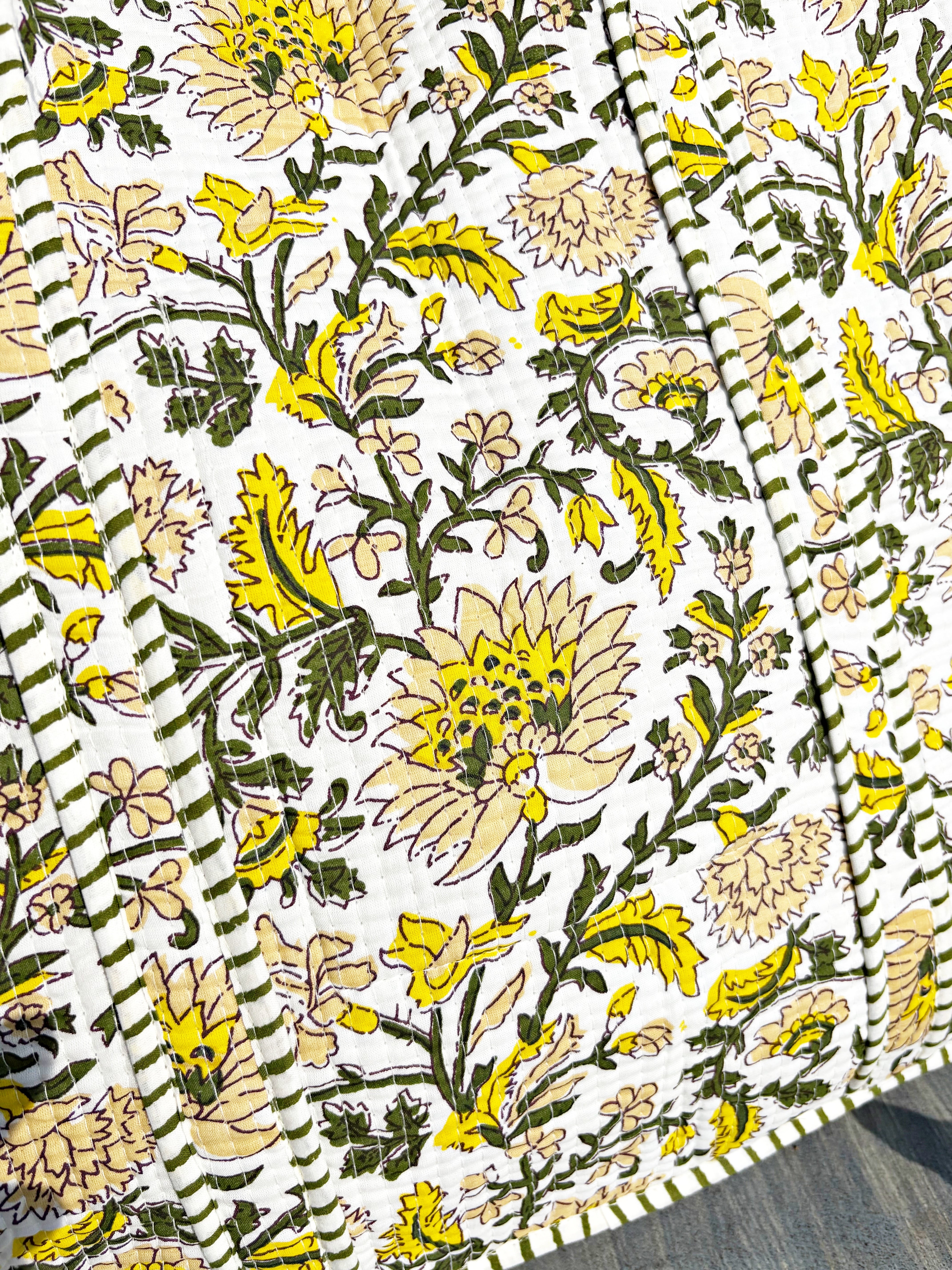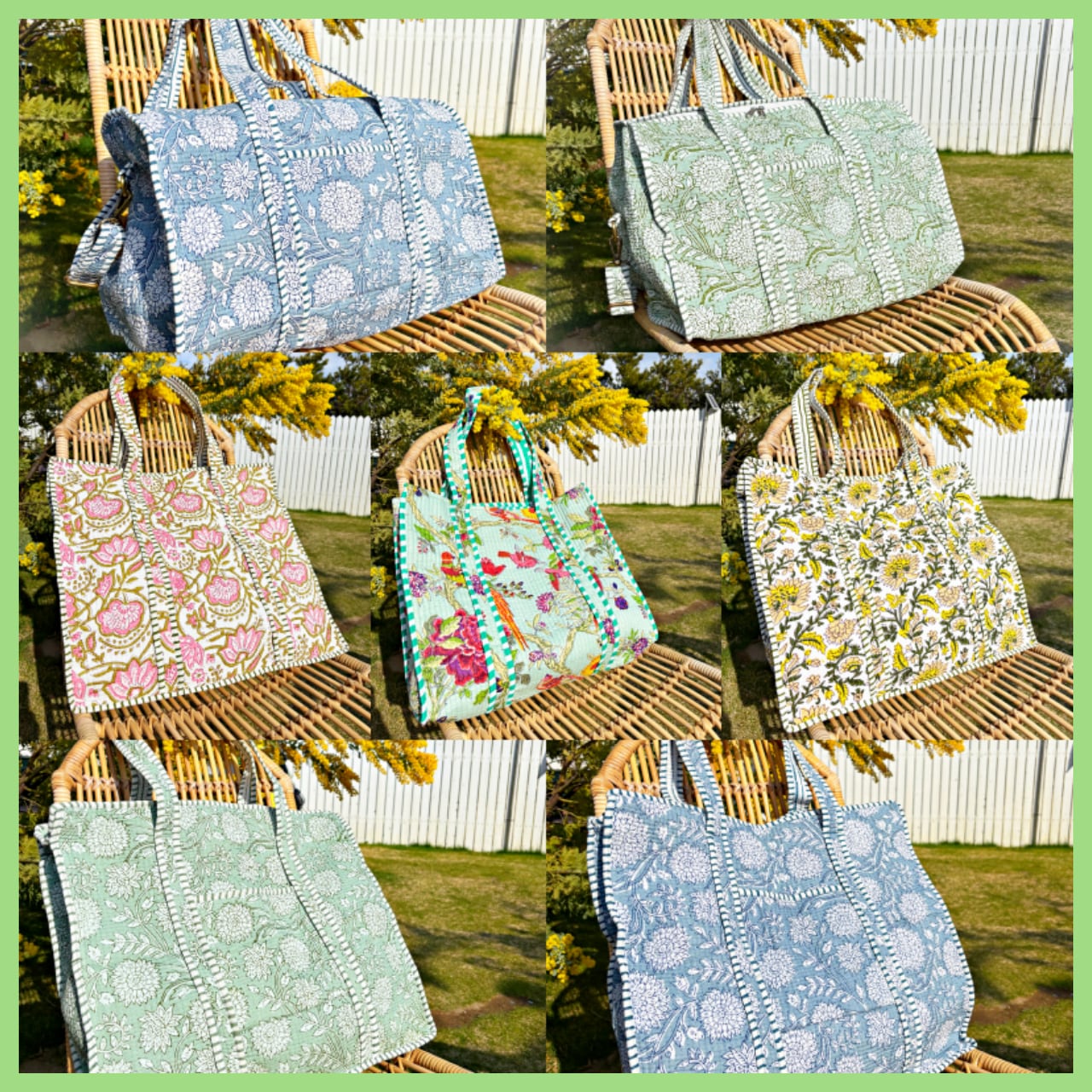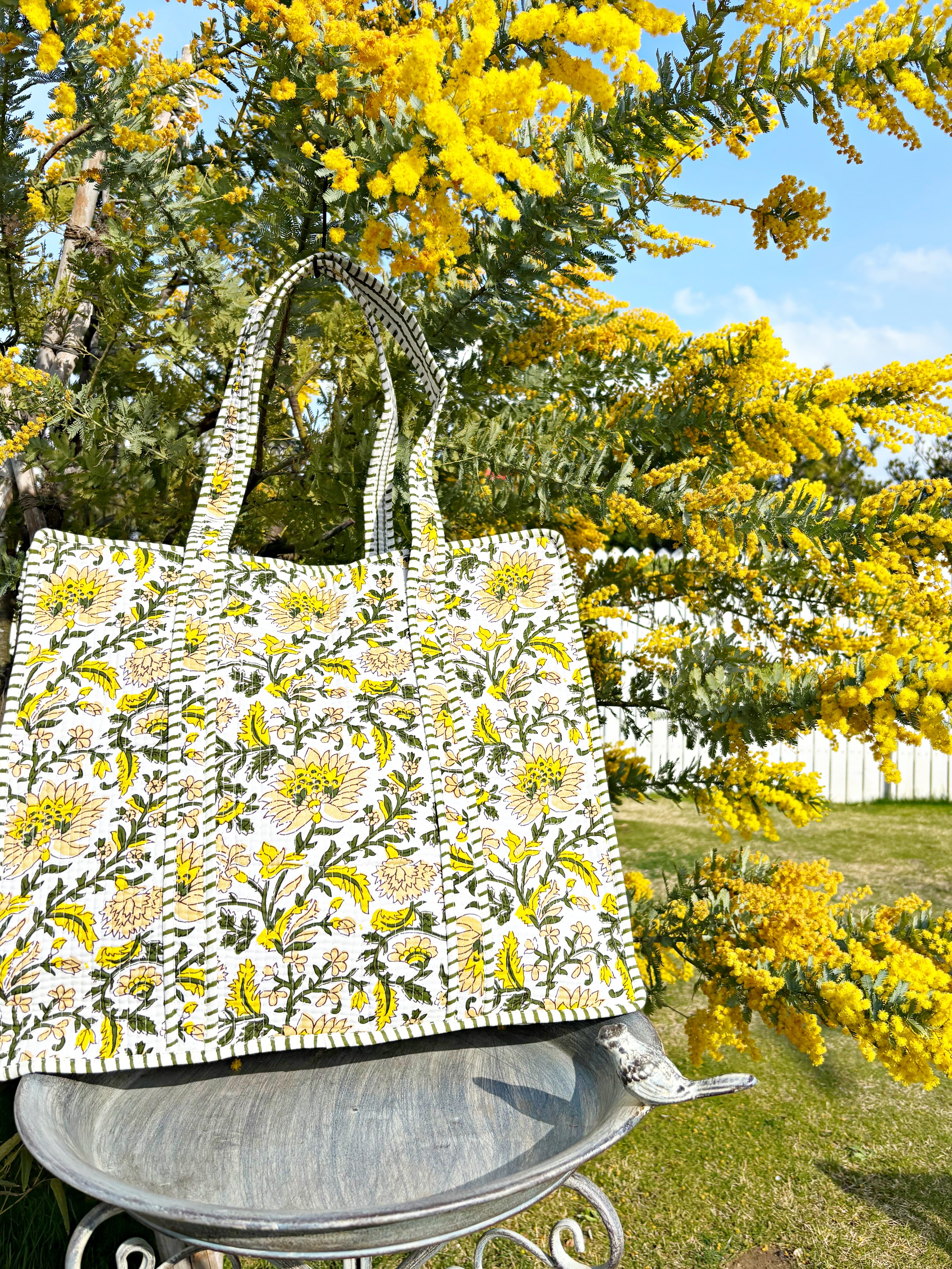 キルティング生地のハンドメイドの質感が温かく、ボタニカル柄が華やかな気分にさせてくれる使い勝手の良い綿布のトートバッグです。