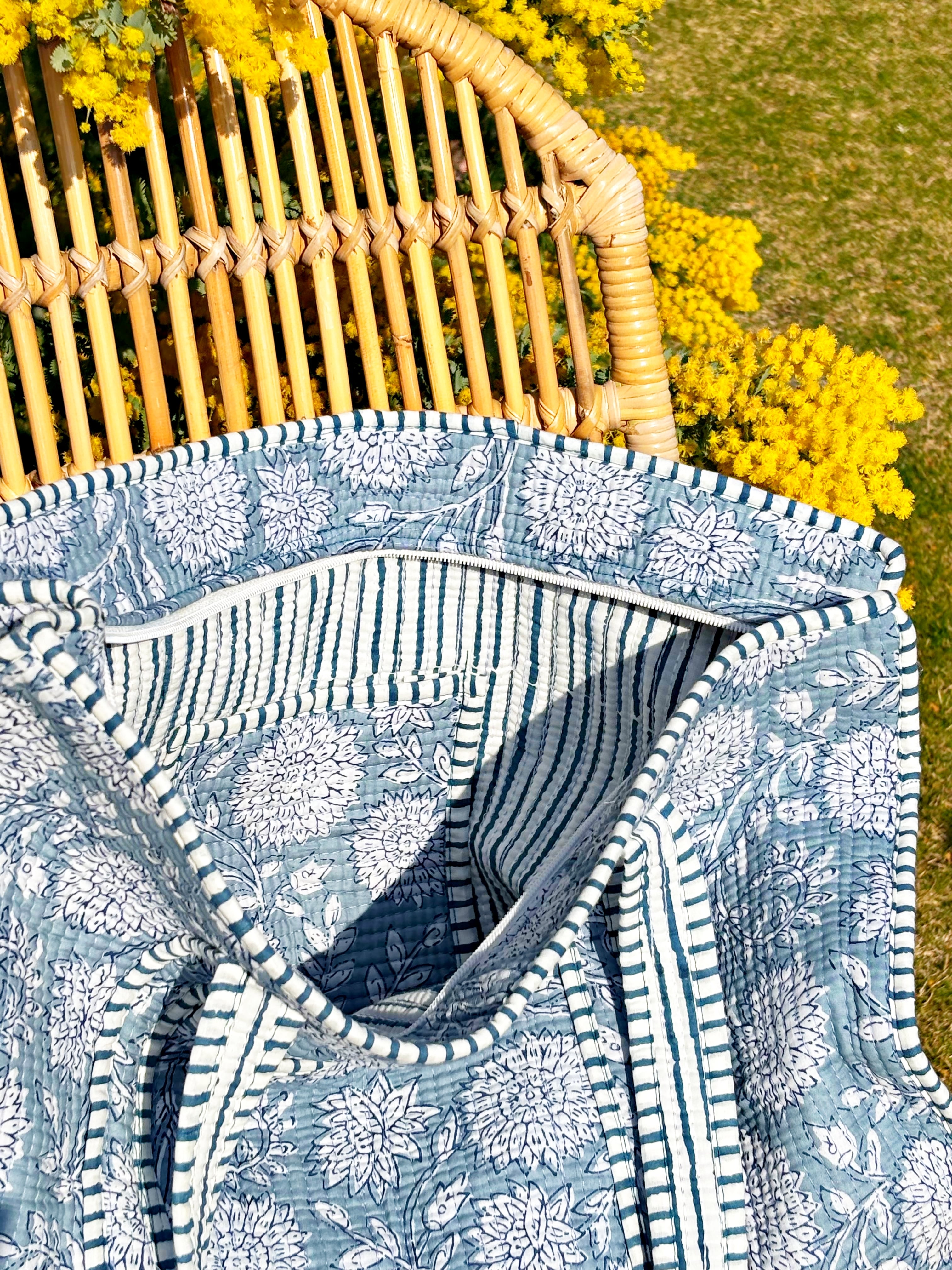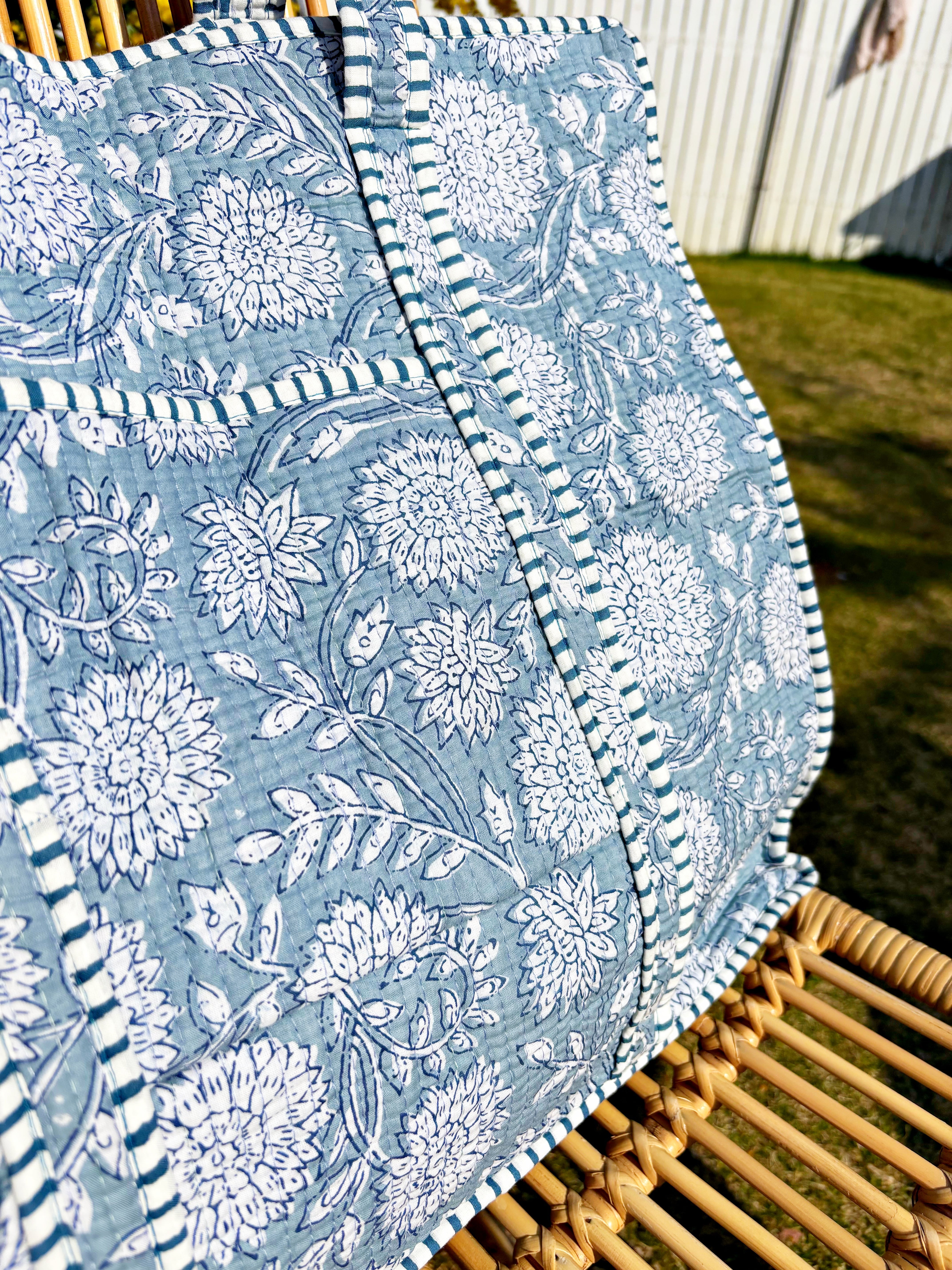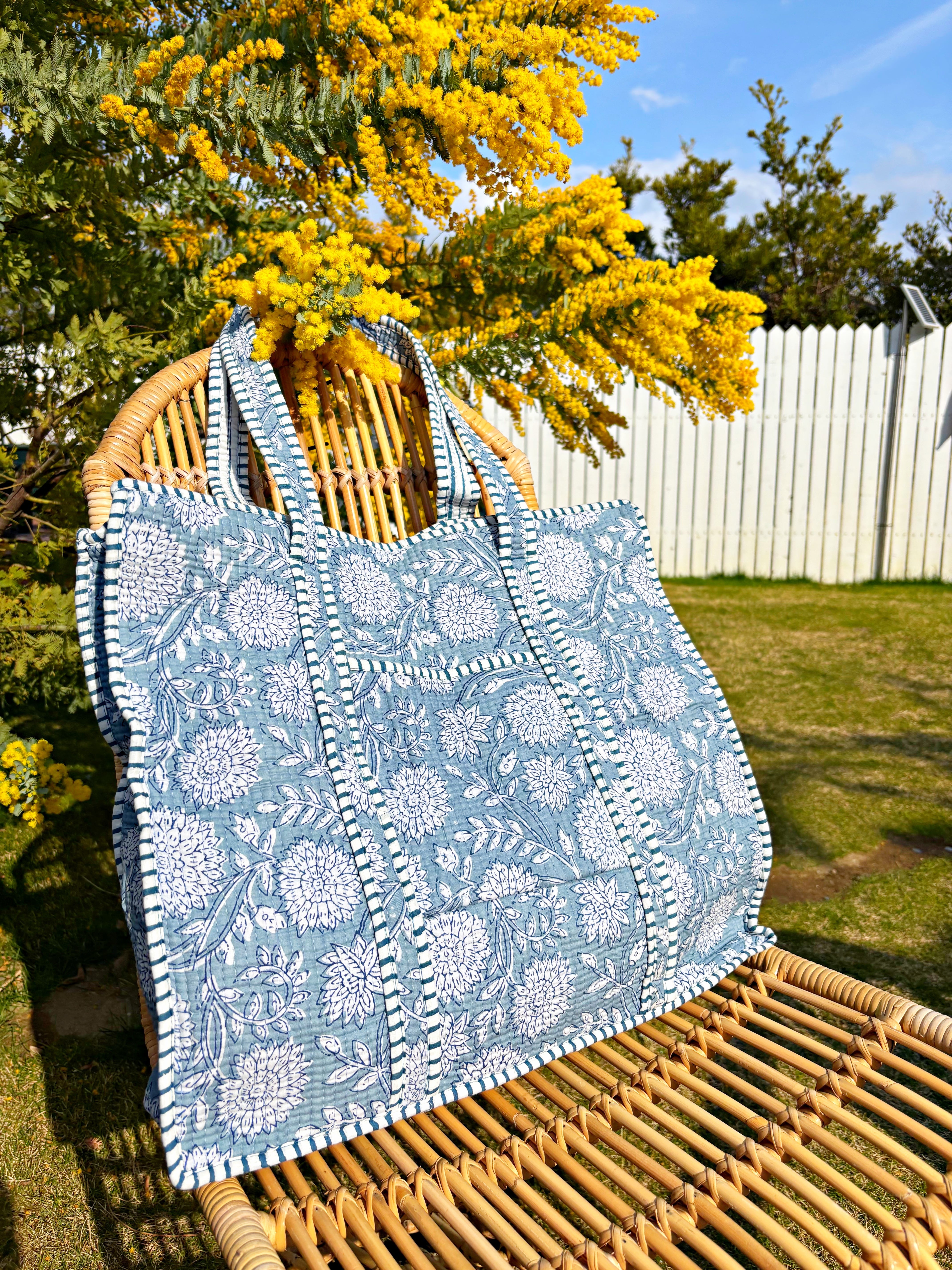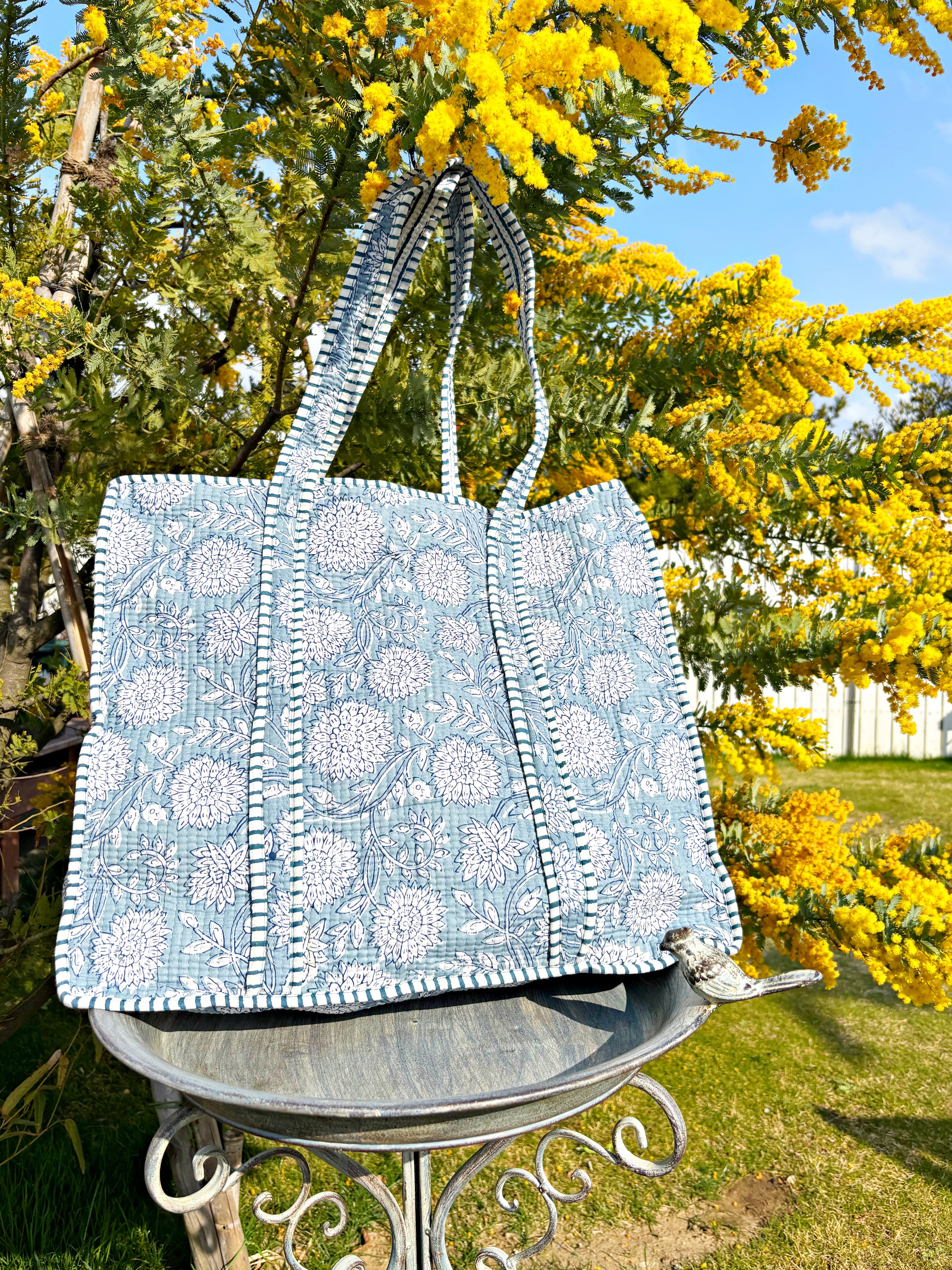キルティング生地のハンドメイドの質感が温かく、ボタニカル柄が華やかな気分にさせてくれる使い勝手の良い綿布のトートバッグです。