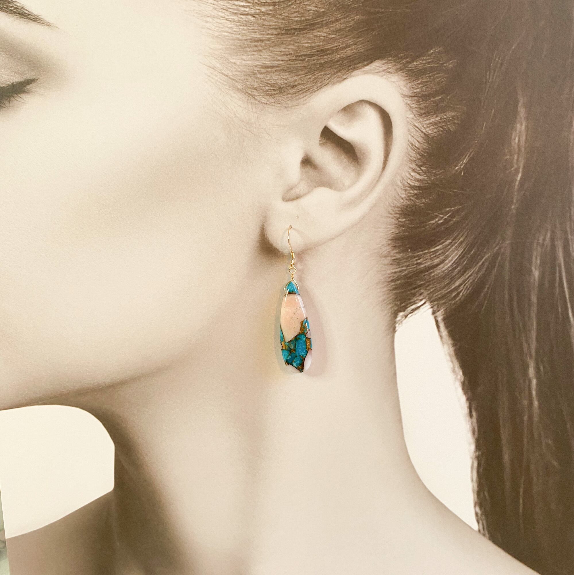 これらは”偽物”ということではなく、ターコイズ自体が元々硬度が弱く、柔らかい物質なので、それ自体ではアクセサリーとしての加工が難しいため、他のものと合わせることで、強度が増すことと、独特な模様や風合いが生まれて、アクセサリーとして非常に相性が良いのです。