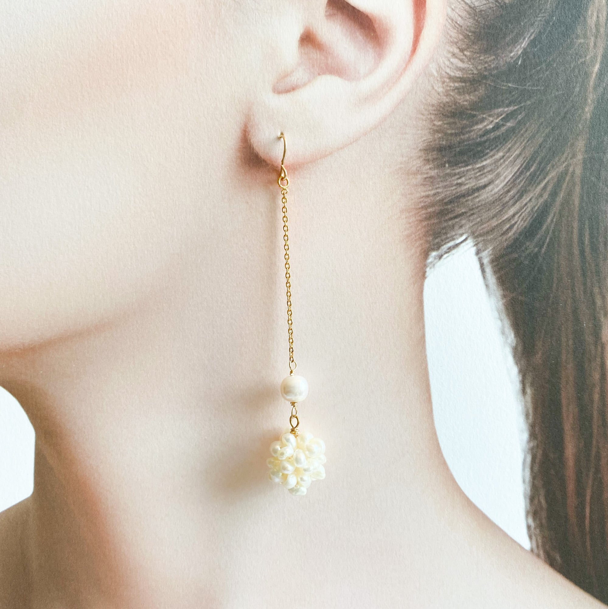 地のネックレスは大きさや形の異なるパールを使用。