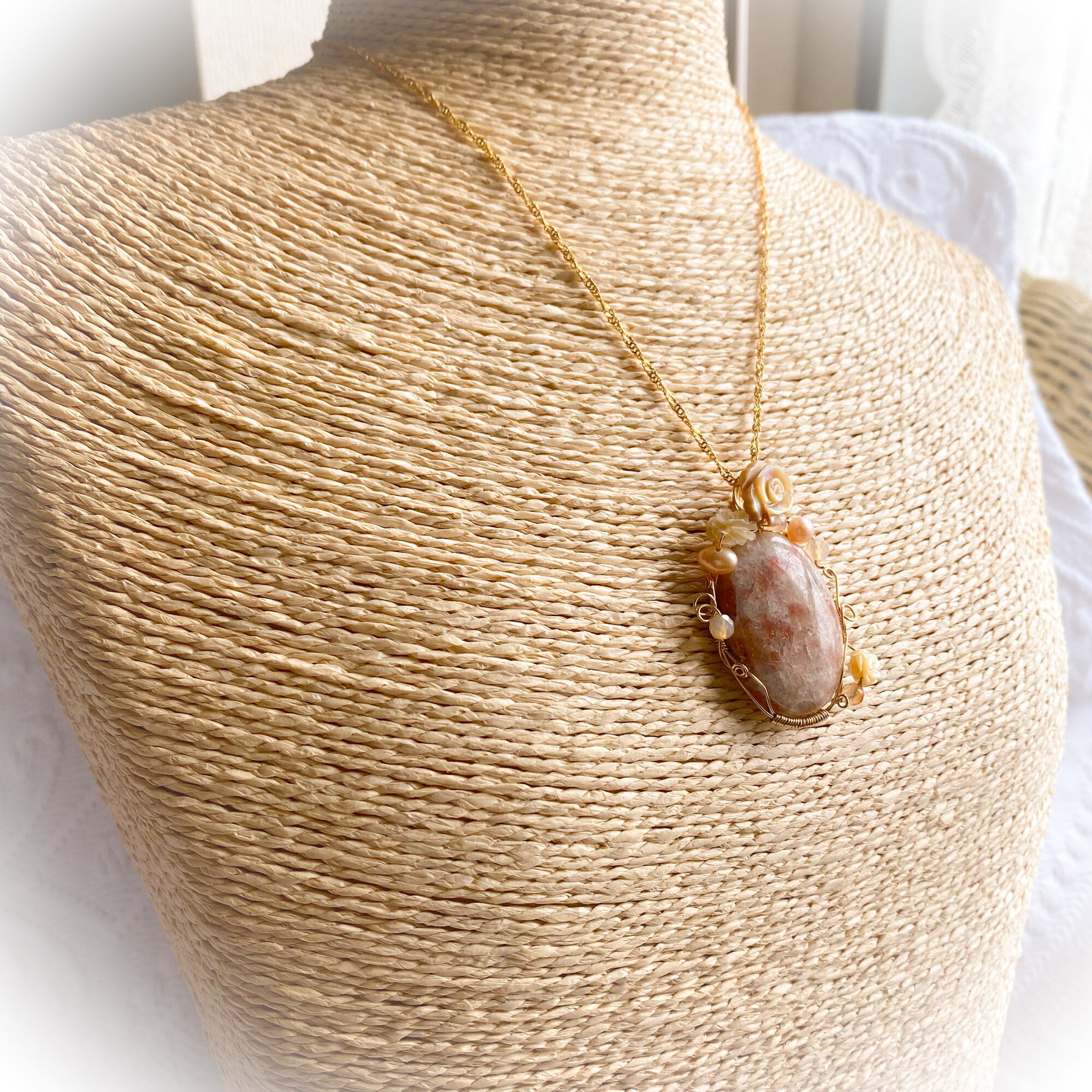 3.5cmの大きめのサンストーンペンダントを、シェルパールのローズ