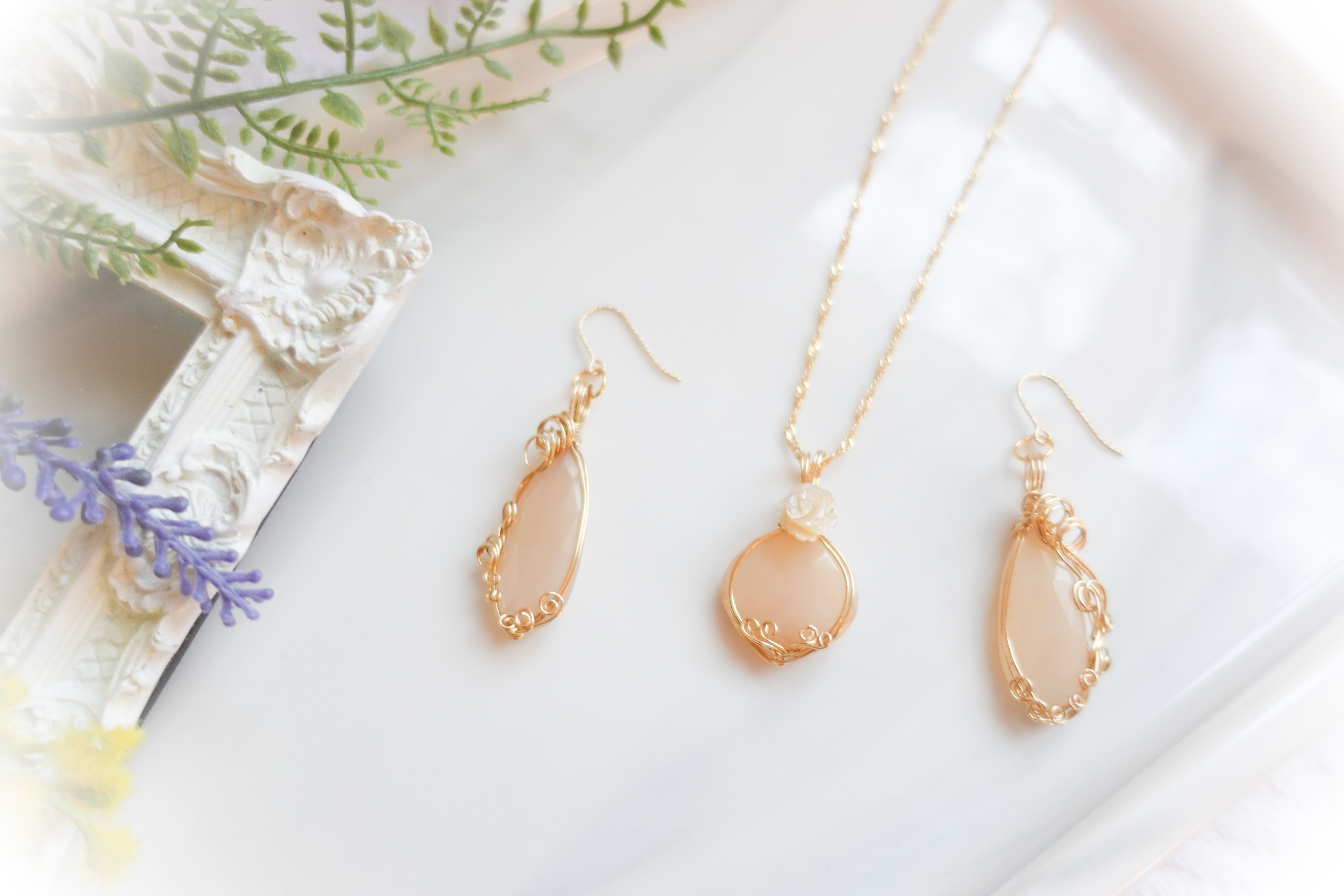 《大人のベージュ》上品ピーチムーンストーン ネックレス&ピアスセット