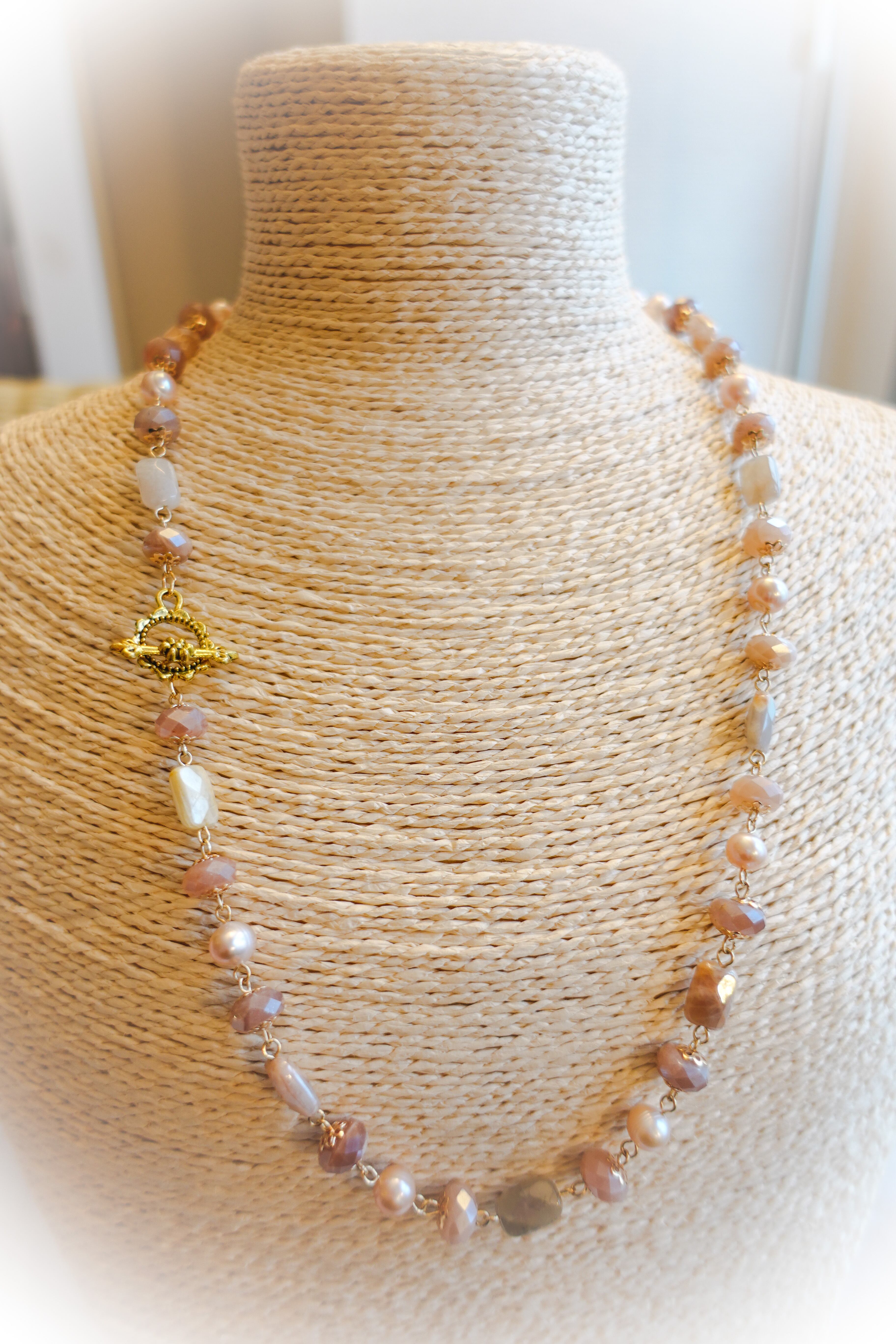キラキラカットのサンストーンと、天然淡水パールを合わせてネックレスにしました。