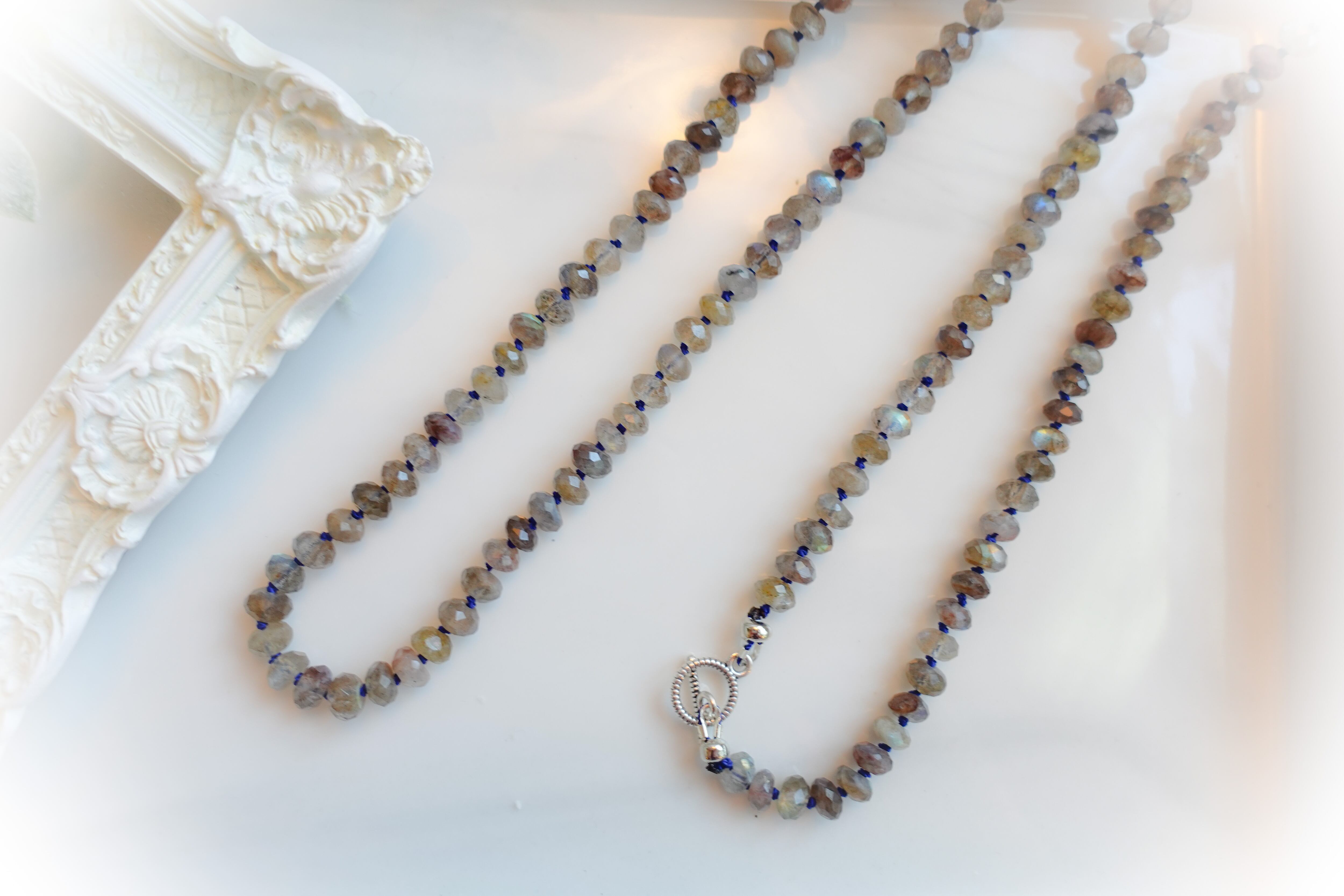 輝きのカットが施された高品質のラブラドライトを使い、上品で華奢なネックレスを作りました。
