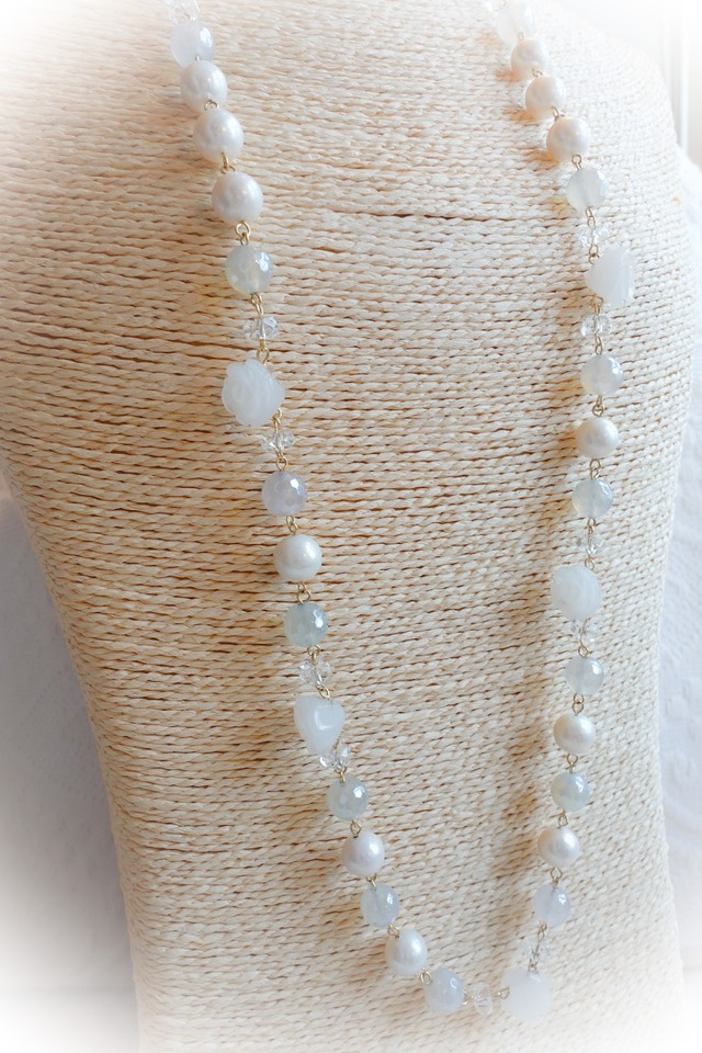 クリアクォーツで、上品な青とホワイトのネックレスを作りました。