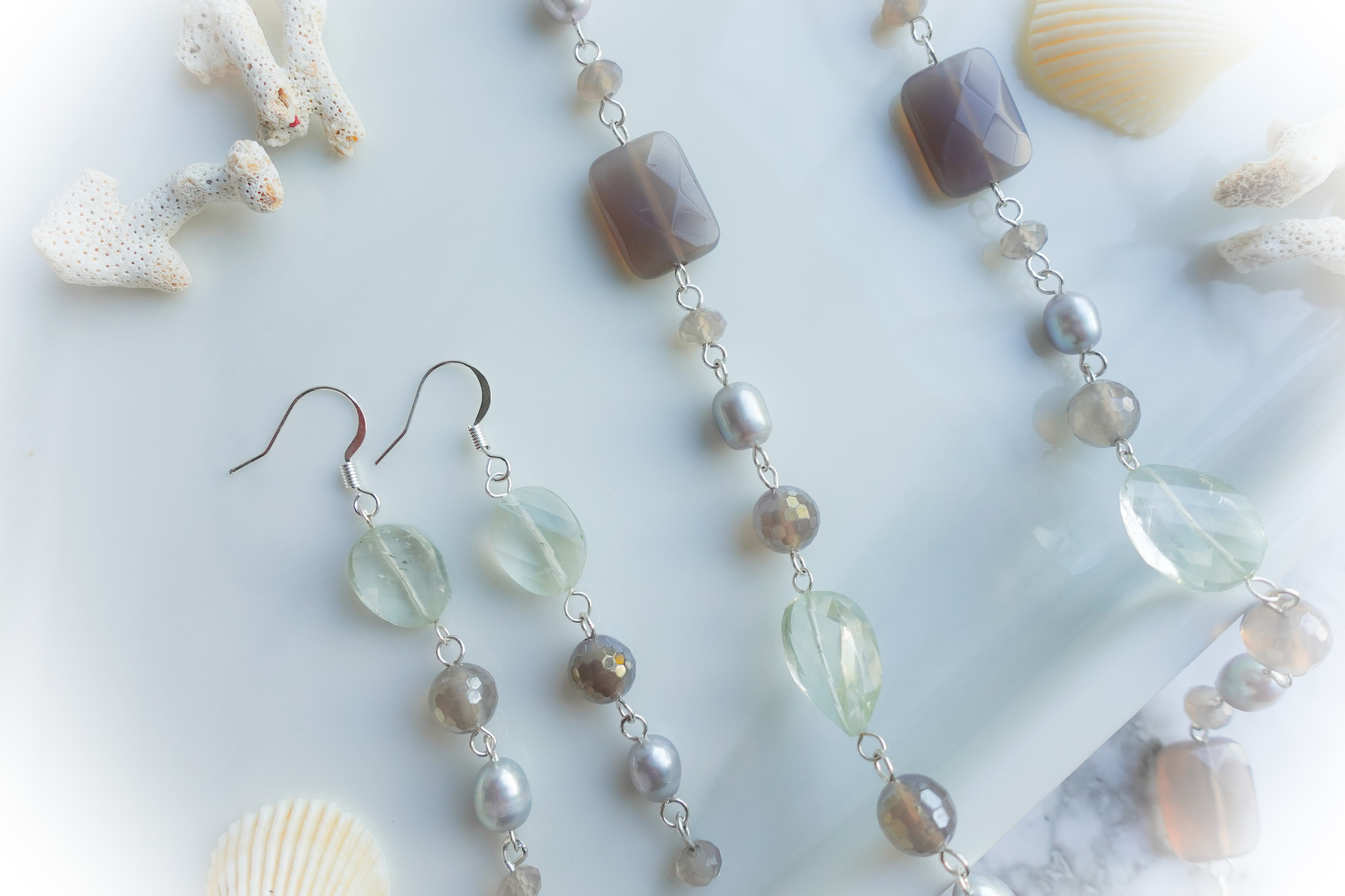 * インド産グリーンアメジスト、ブラジル産グレーアゲート、天然淡水パール、ミャンマー翡翠ビーズ、シェル