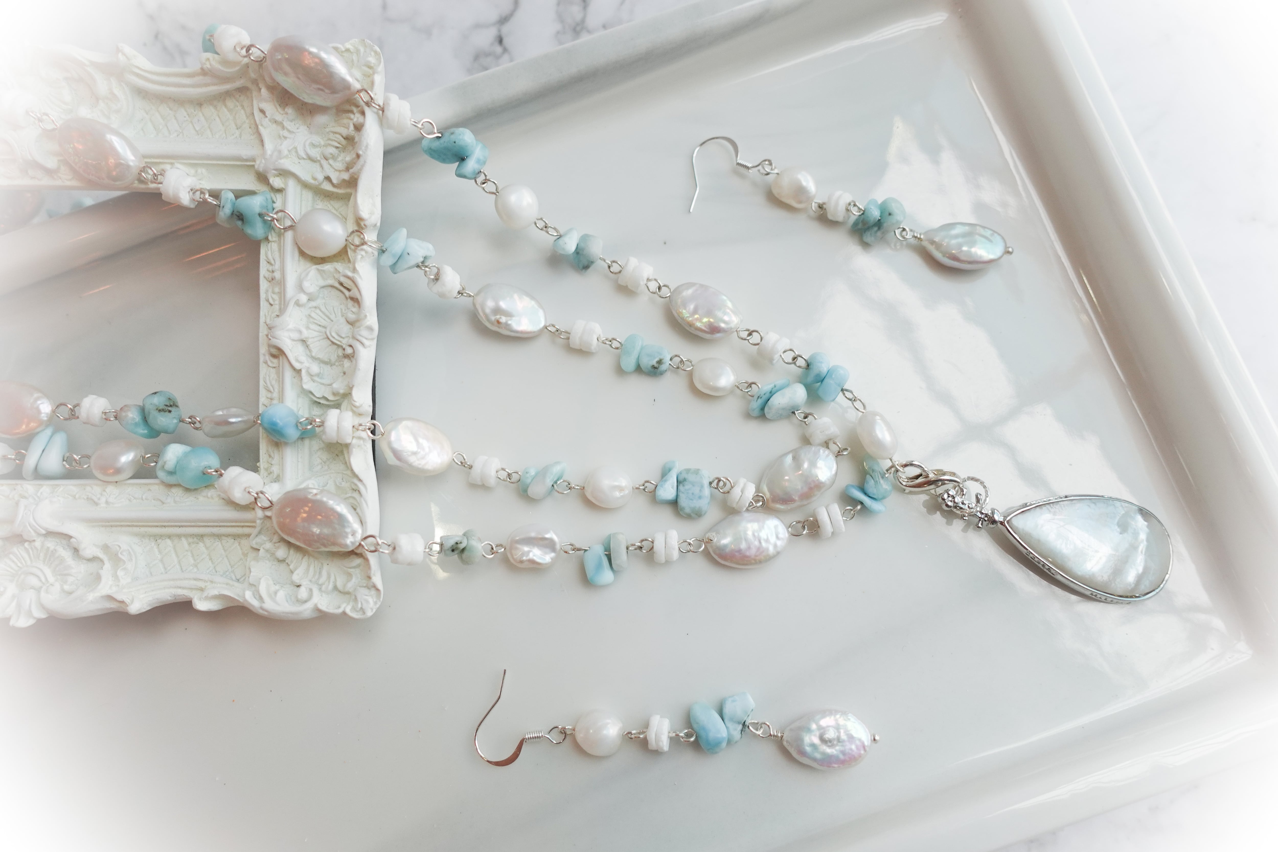 《パール祭り》マザーオブパール付きラリマーx淡水パールxシェルロングネックレス&ピアスセット