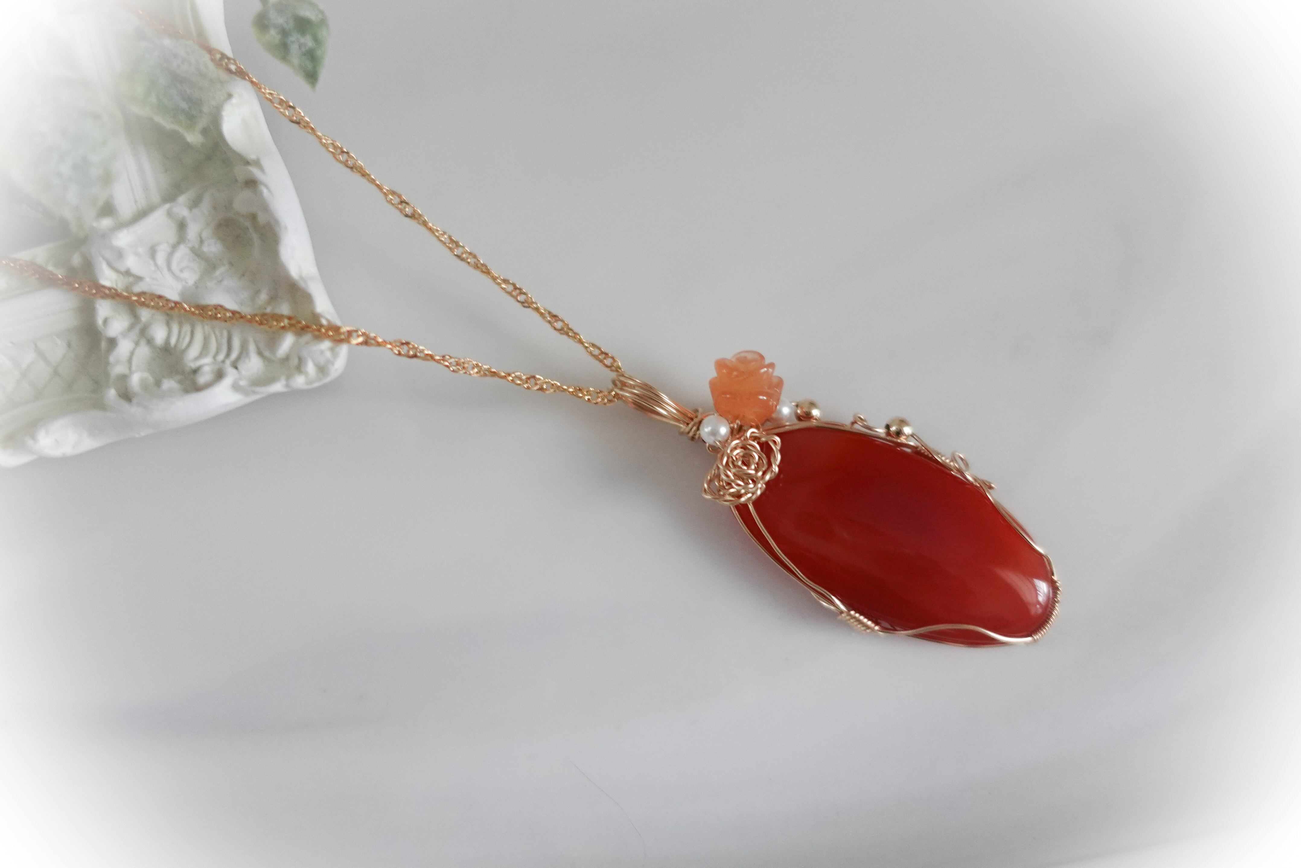 美しく磨かれた高品質なカーネリアンを、ワイヤーの薔薇、カーネリアンビーズの薔薇、