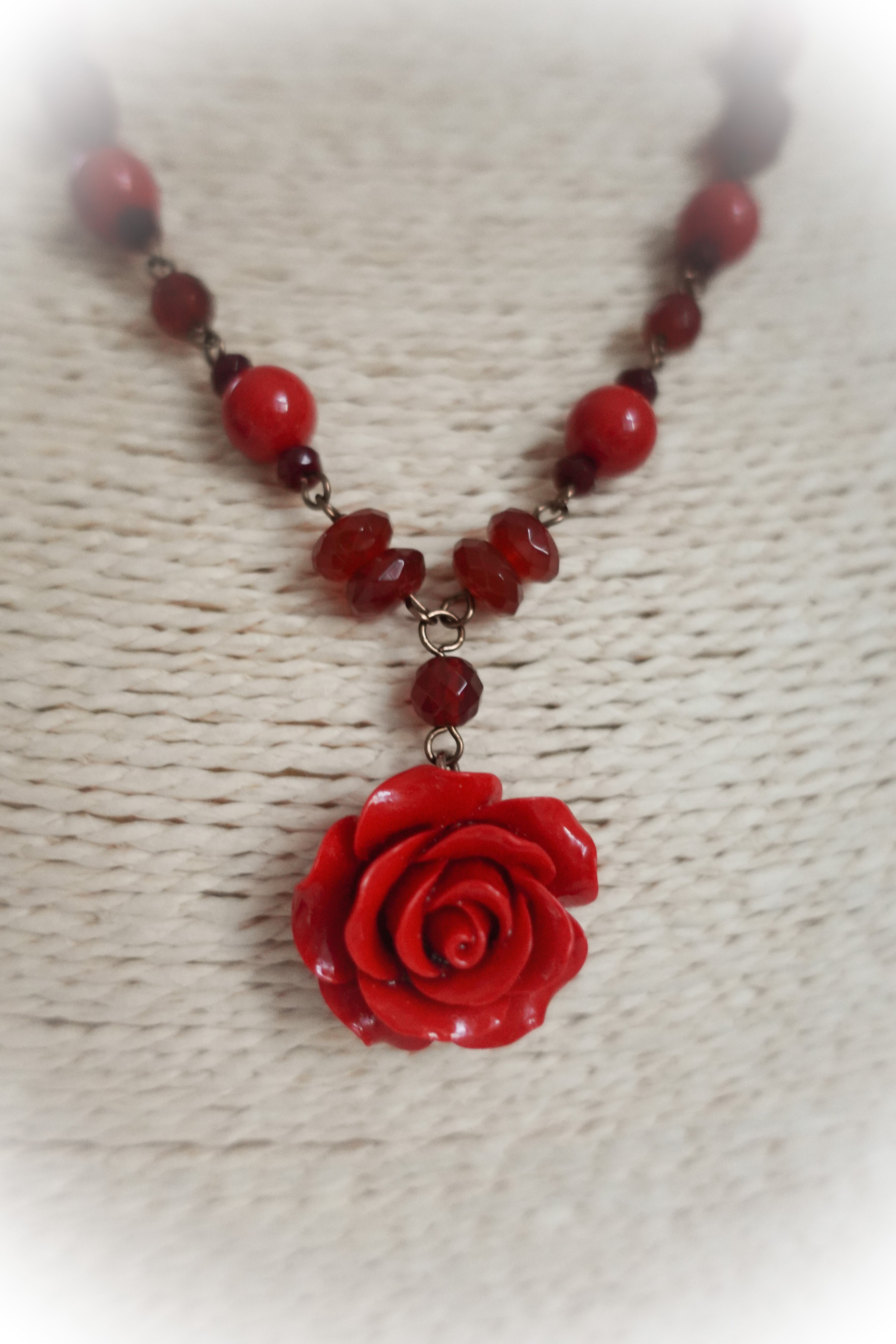 こちらは、真っ赤なサンゴ(加工)の薔薇モチーフを、色相性のよいカーネリアンと合わせて作りました。少しダークな赤がニュアンスになって大人っぽく見せてくれています。