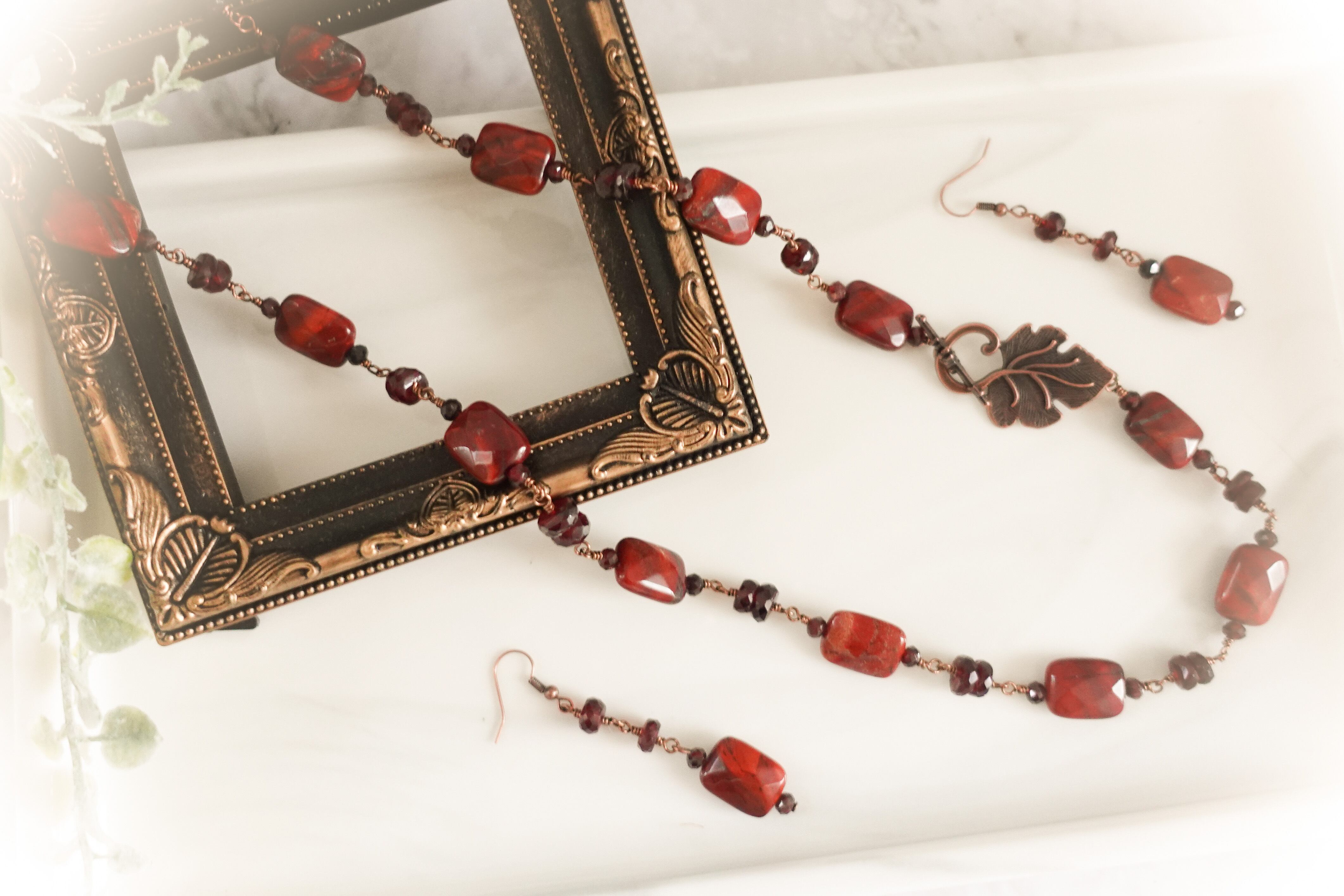 【秋の赤と薔薇】高級ガーネット&レッドジャスパーネックレス&ピアスセット