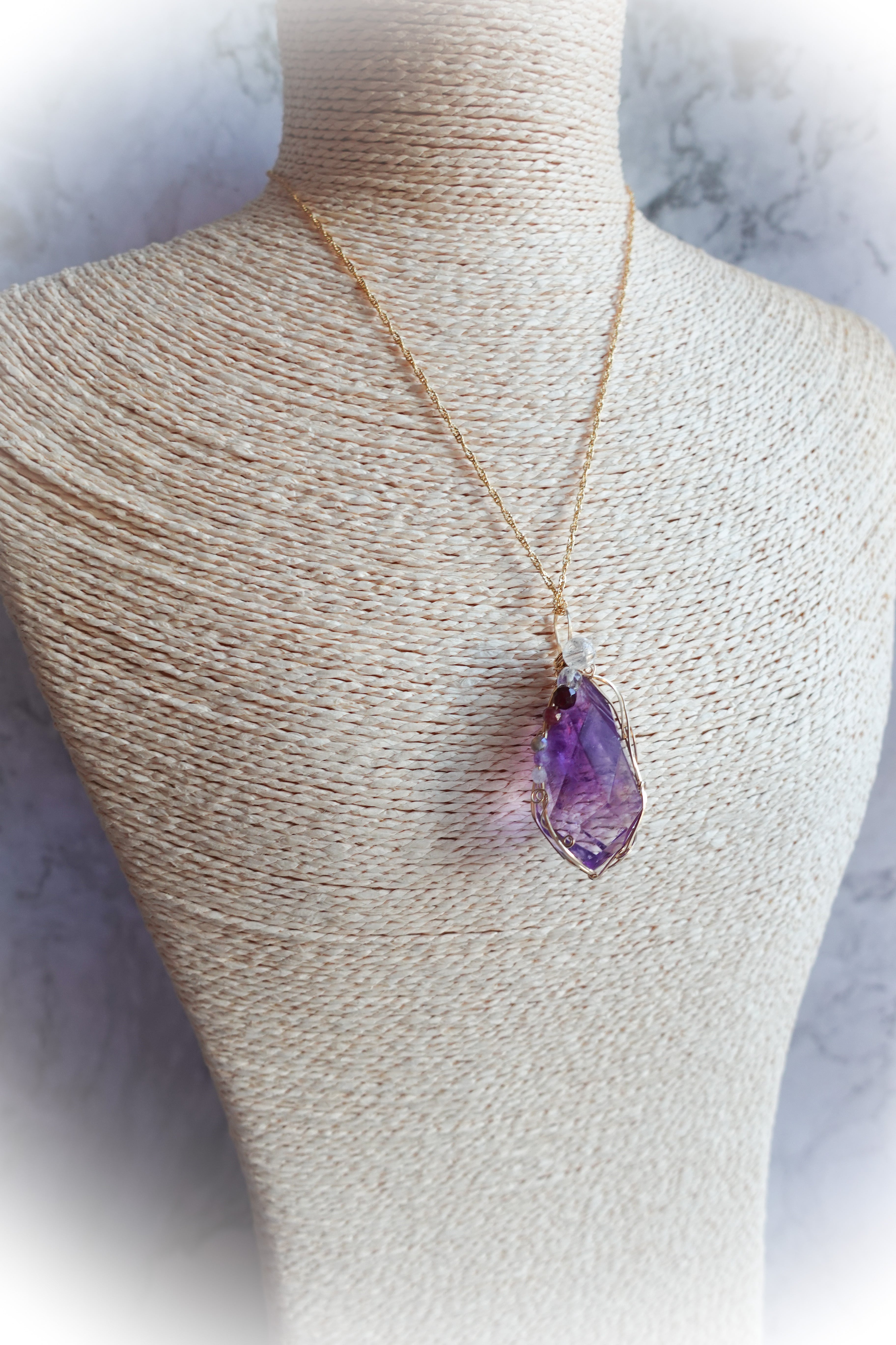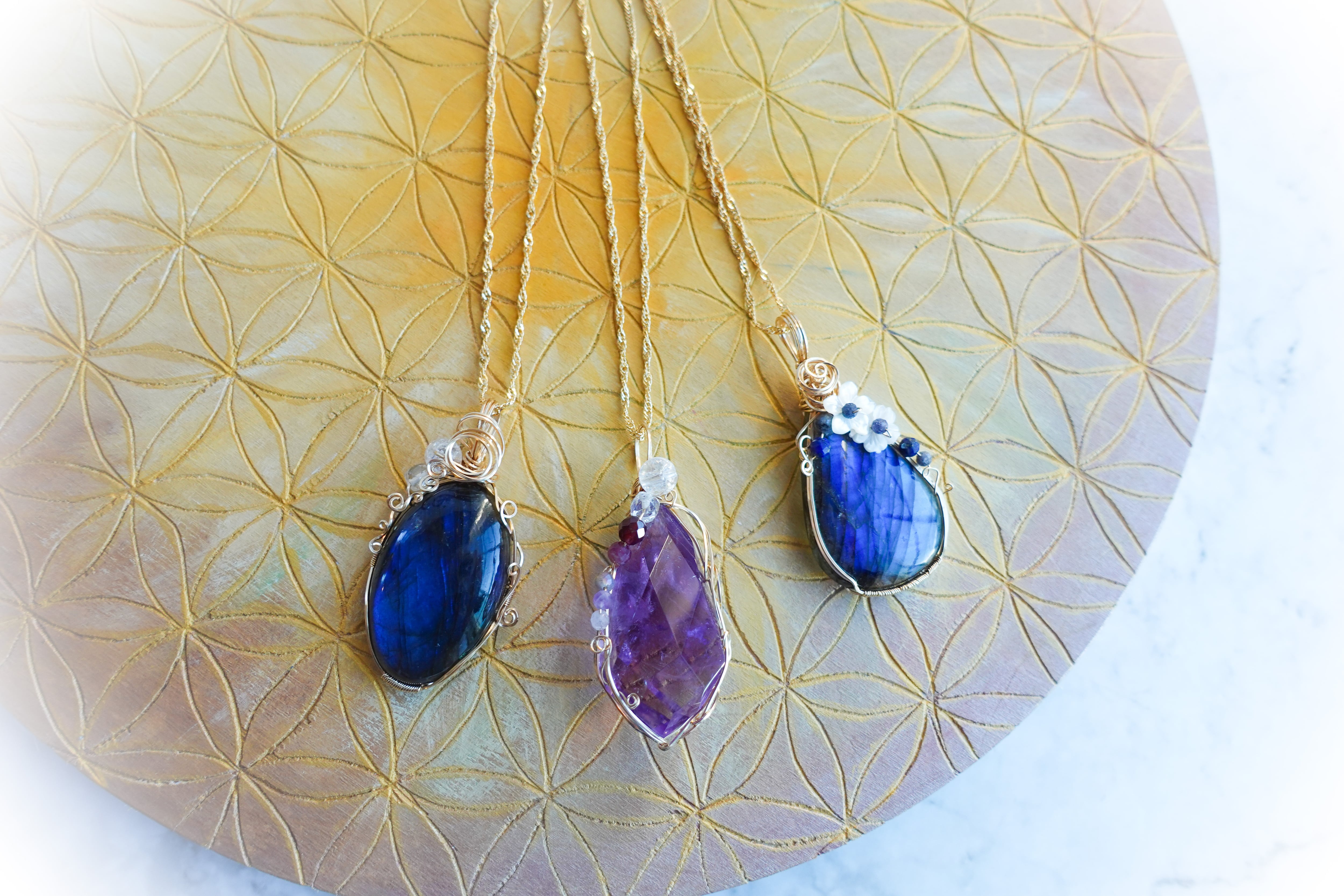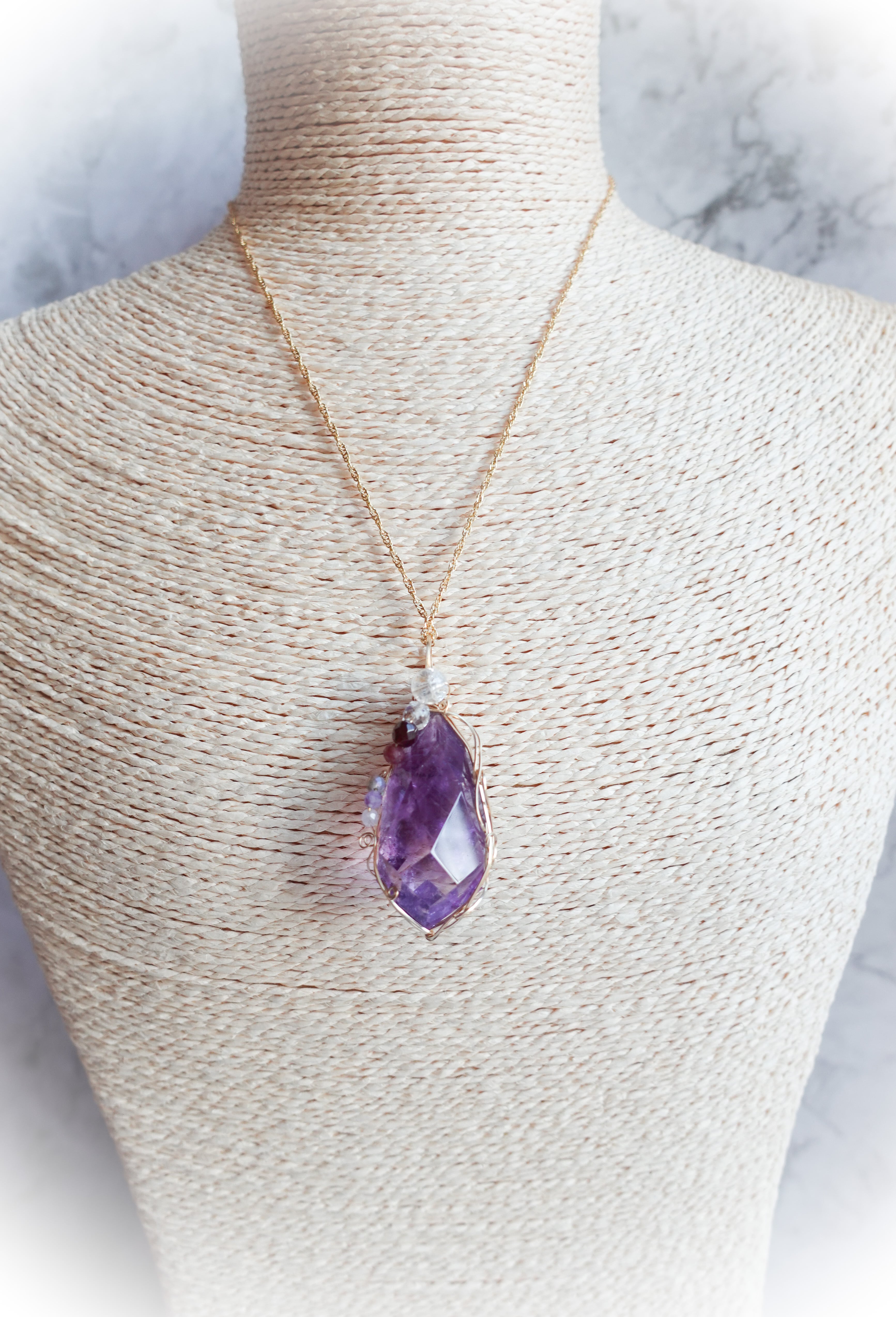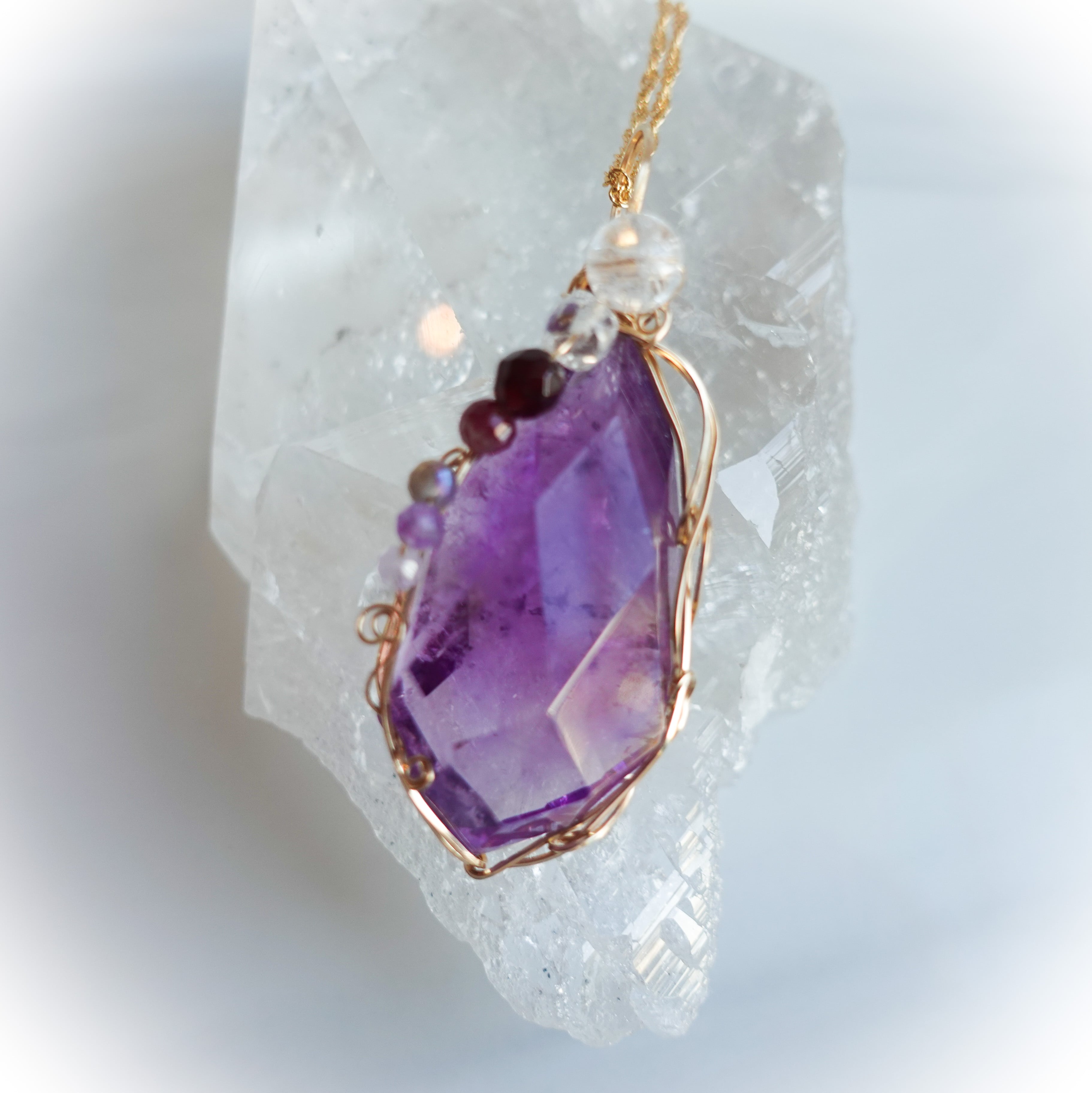 同色系のラベンダーアメジあスト、クラッククォーツなどをあしらって