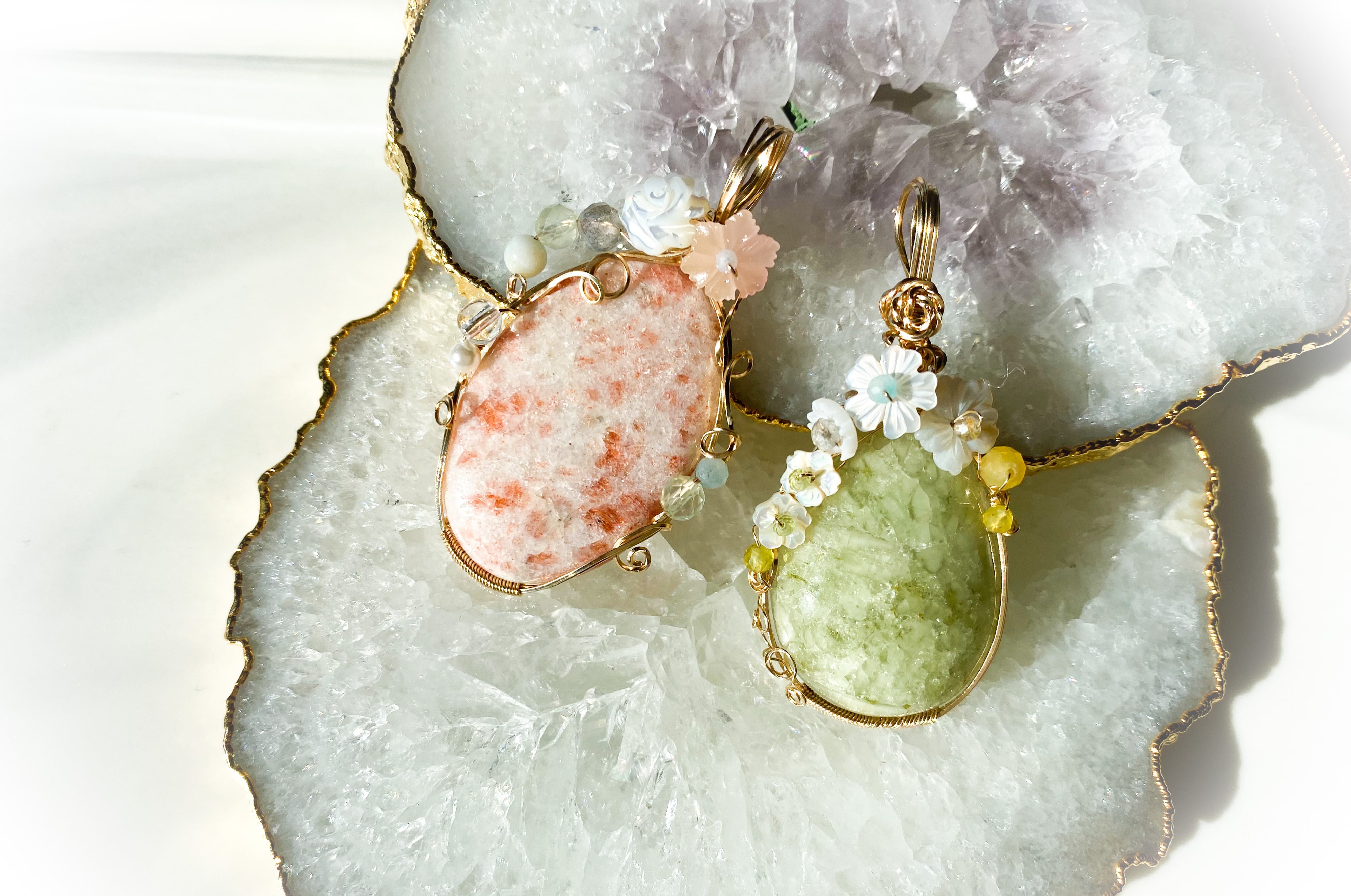 使っている石は、ラブラドライト、クリアクォーツ、翡翠、プレナイト、シェルパール。