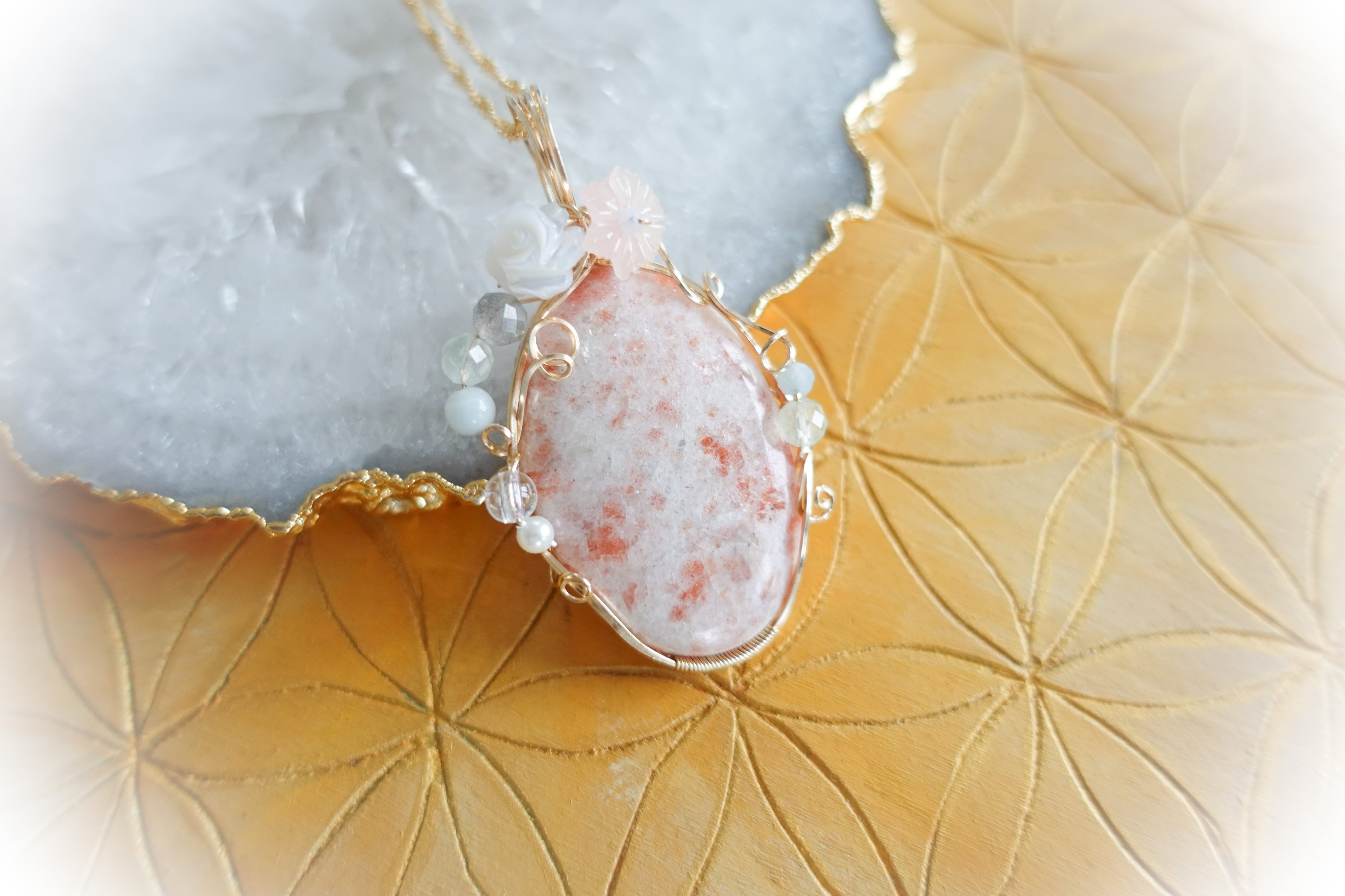 サンストーンの輝きがさらにUPしているお花畑仕様のペンダント。