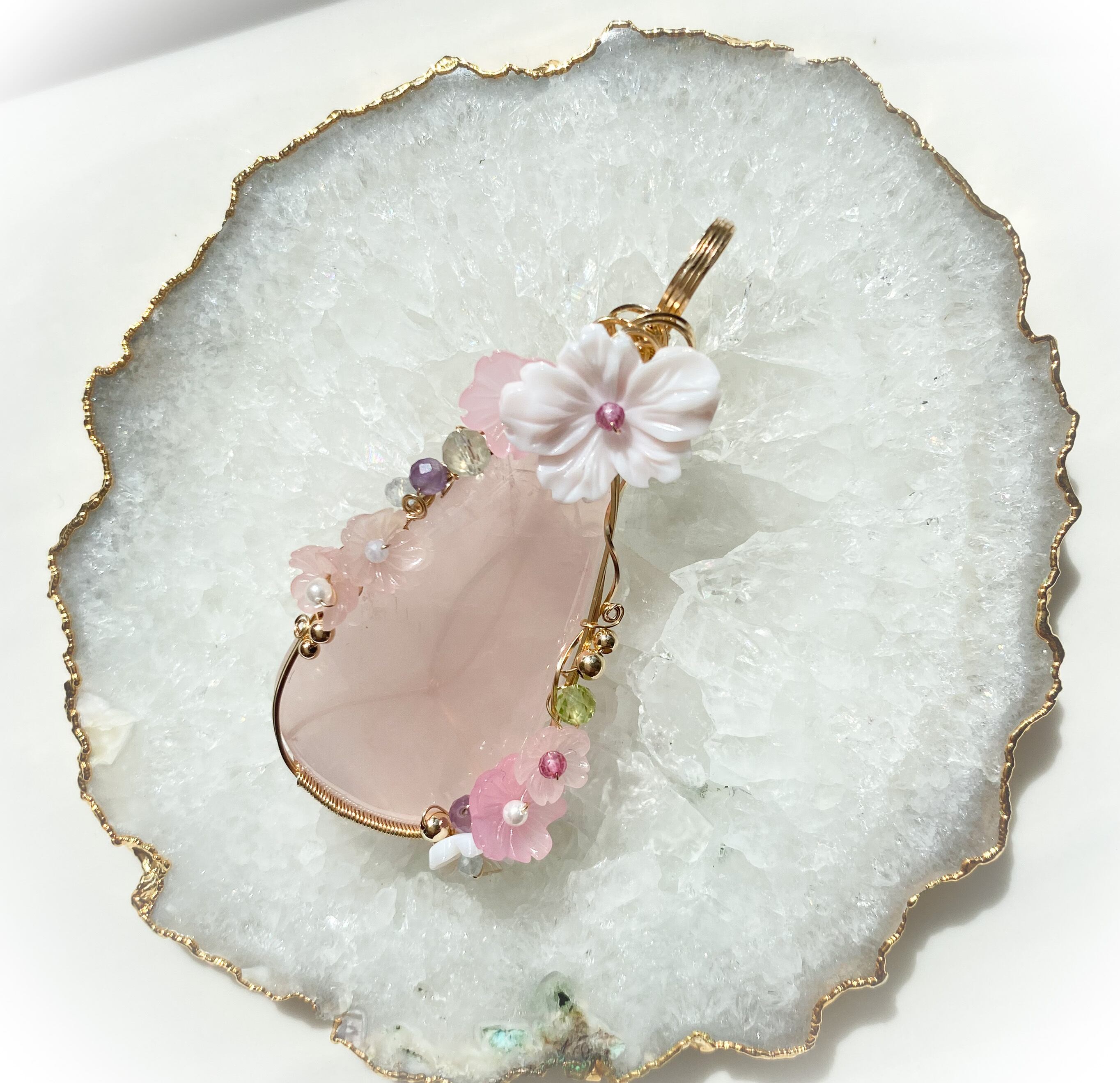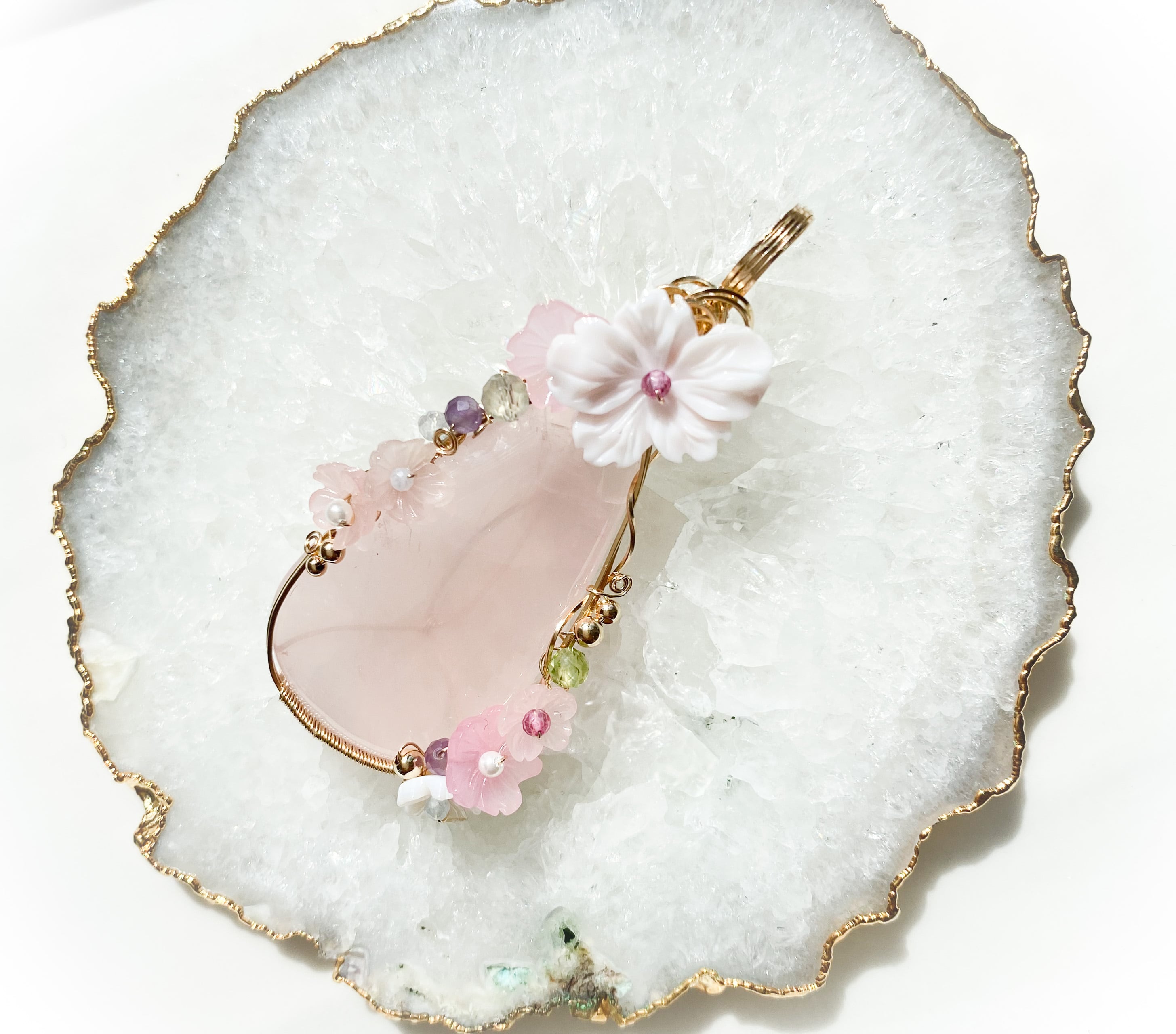 装飾にはシェルパールのお花ビーズにピンクトルマリン、ピンクトパーズ、ローズクォーツ、パールをあしらっています。