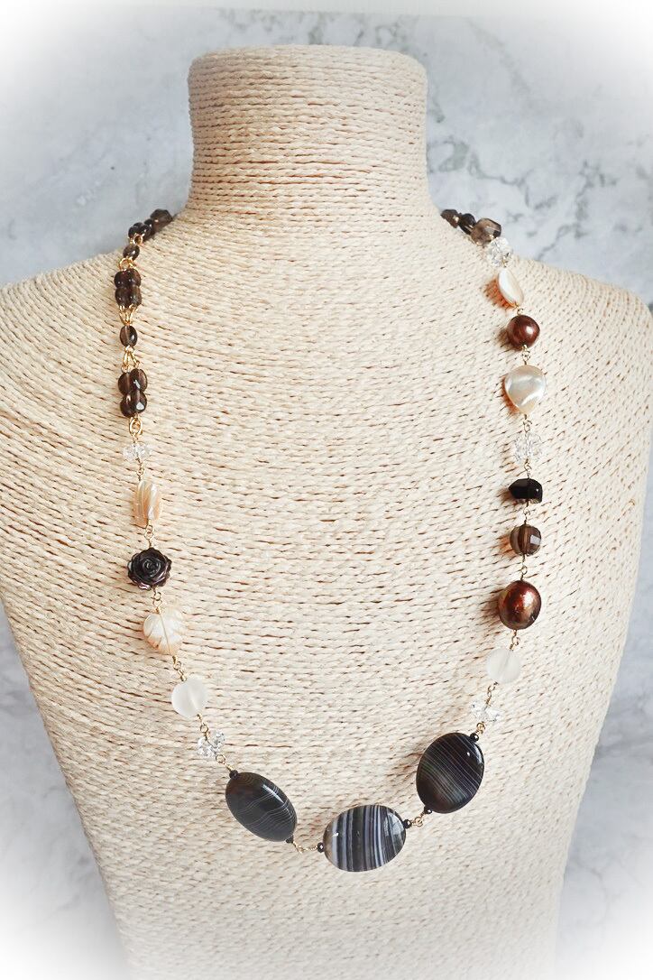縞模様が美しいバンディットアゲートとスモーキークオーツで《クールビューティー》なネックレスに仕上げました。