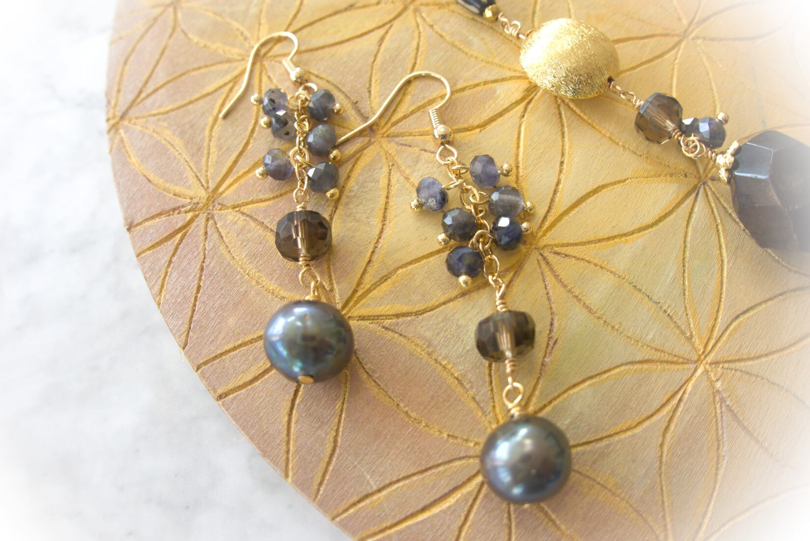 *モザンビーク産ガーネット、ブラジル産スモーキークォーツ、中国製パール、ブラジル産アイオライト、シェルビーズ、ホーンビーズ、