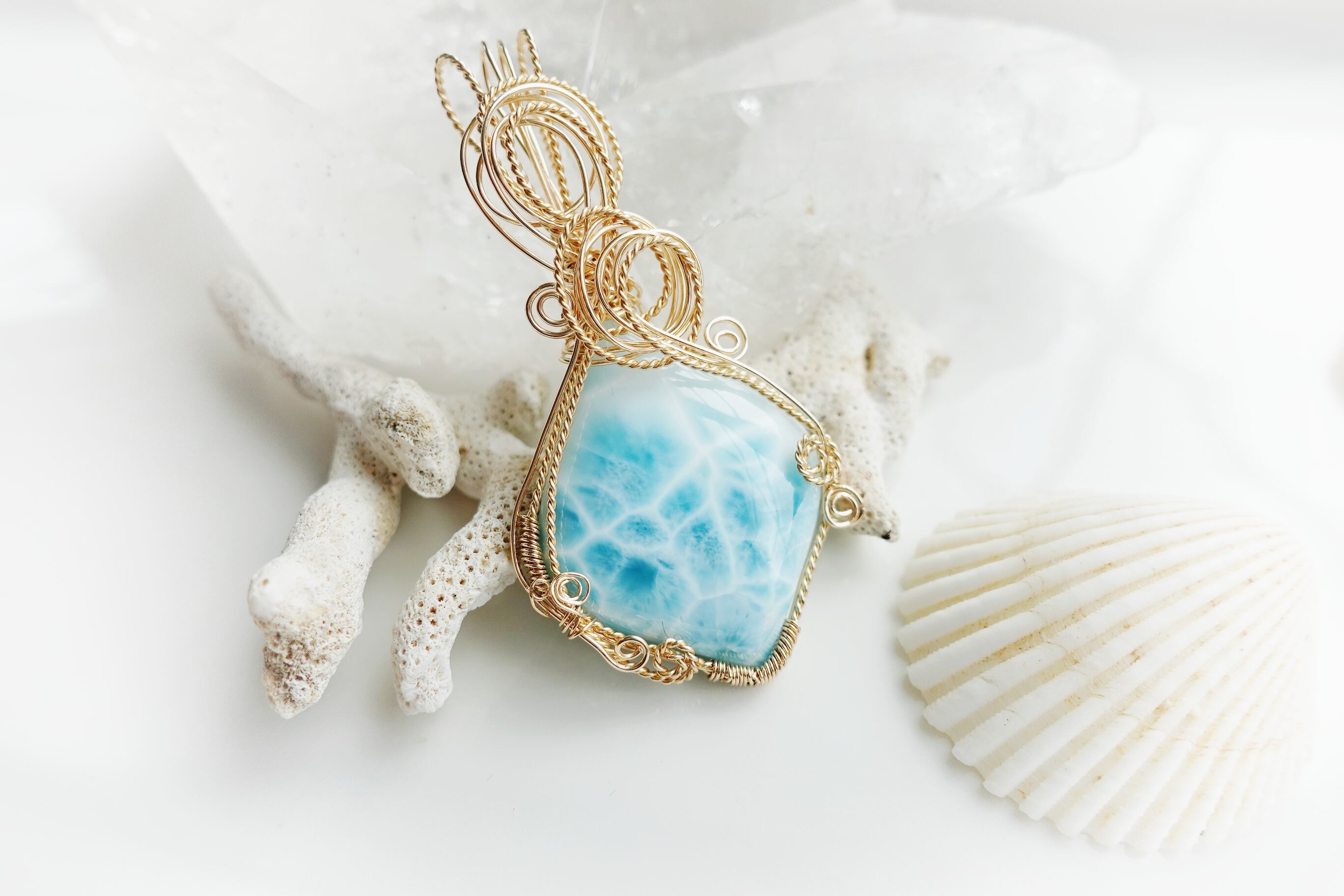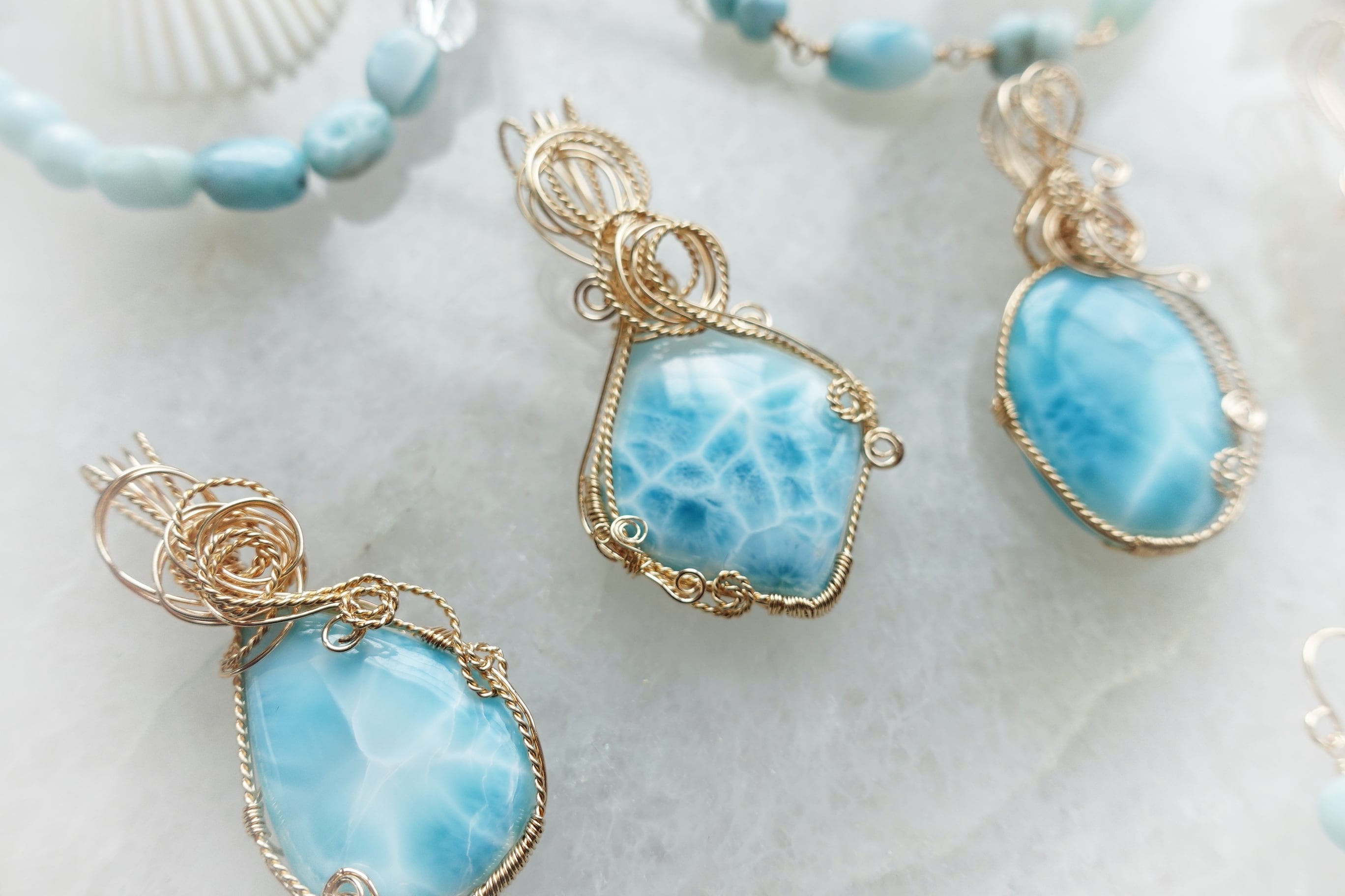 カリブ海のブルーの水面のように、光を反射して、白い波を思わせるような美しいラリマーのペンダントです。
