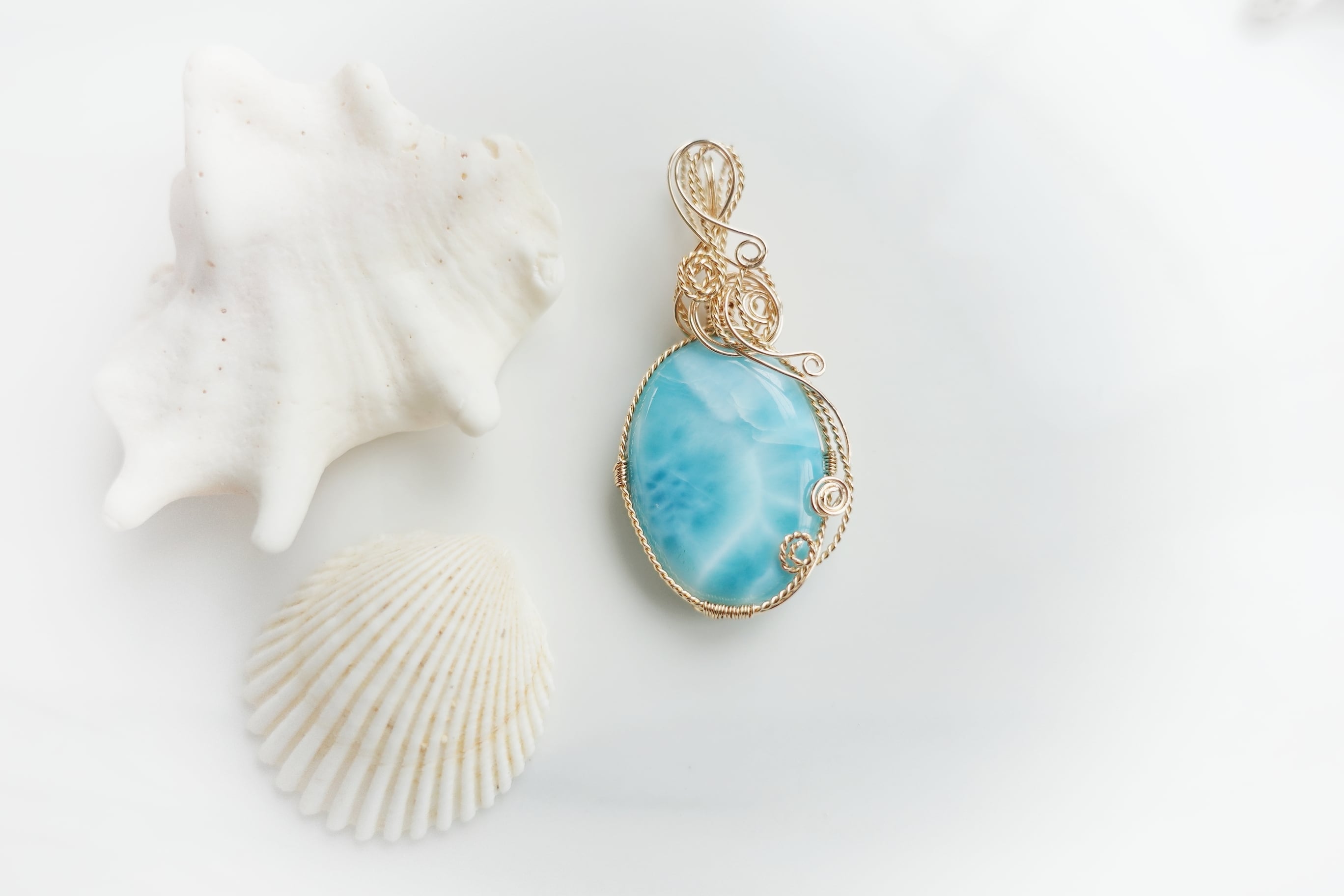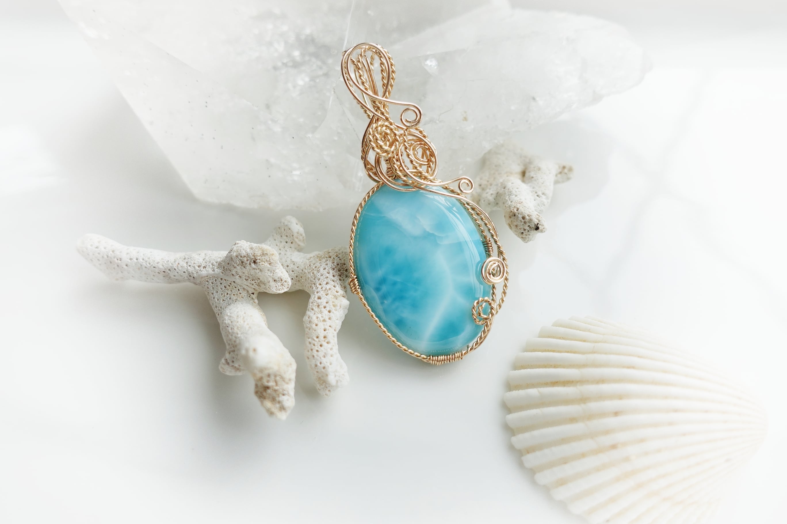 カリブ海のブルーの水面のように、光を反射して、白い波を思わせるような美しいラリマーのペンダントです。