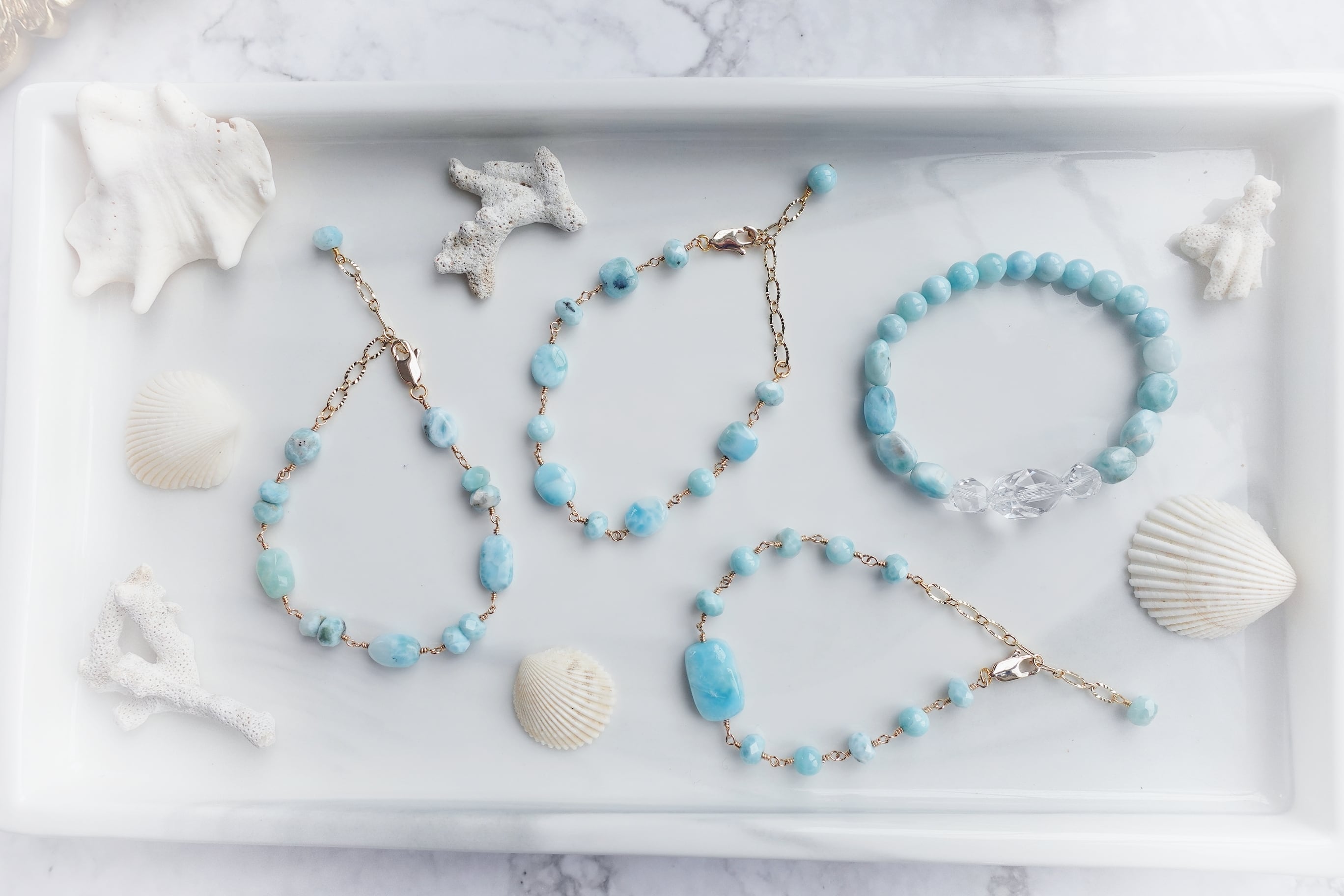シャツブラウスの腕をまくり、ゆるりとラリマーブレスを着けるのも、抜け感があって、女性らしさが引き立ちます。