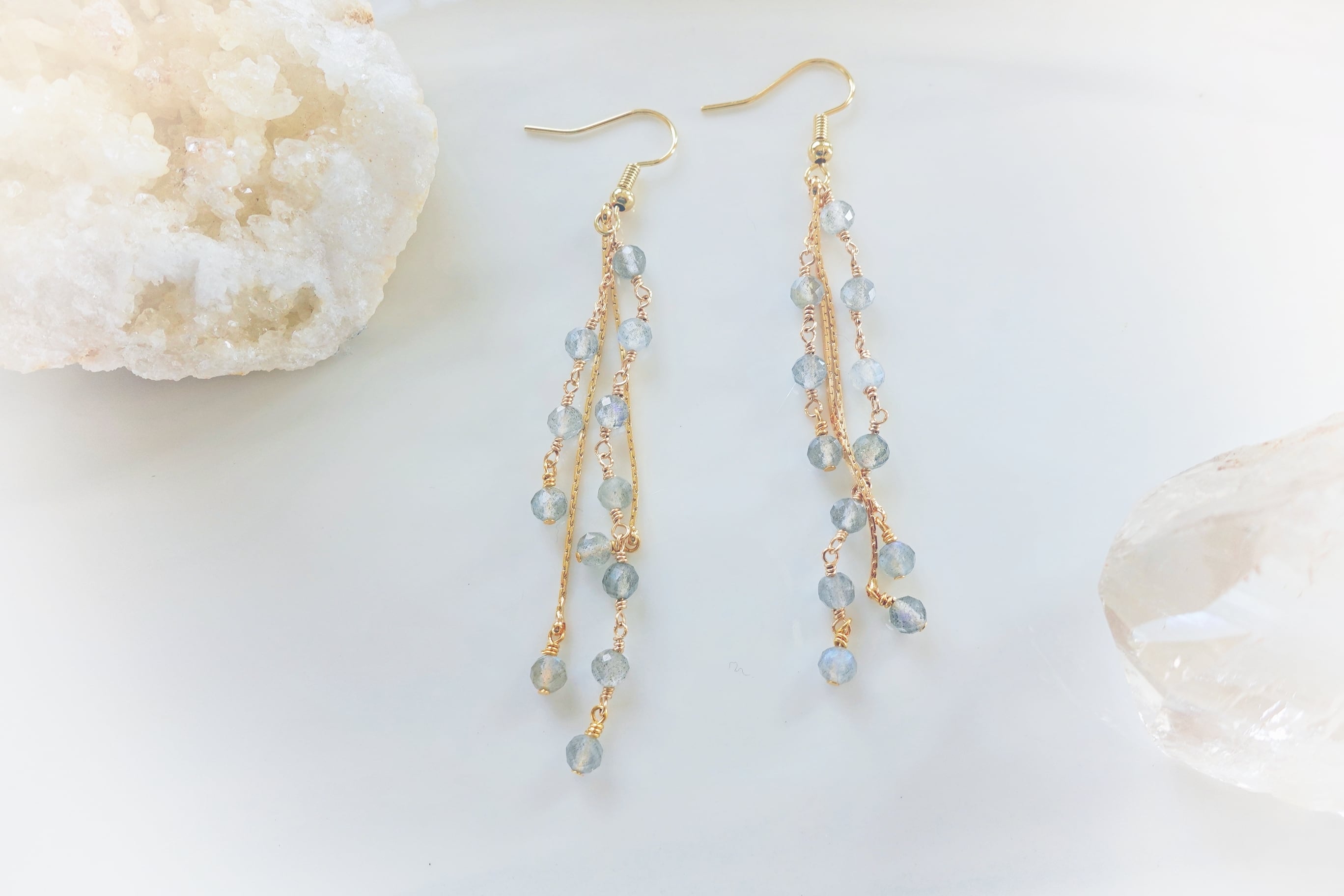 光の当たり方でブルーにもグレーにも表情を変えるラブラドライトが好きすぎて、たくさんのラブラドライトで仕上げた贅沢なネックレスとピアスのセットです。