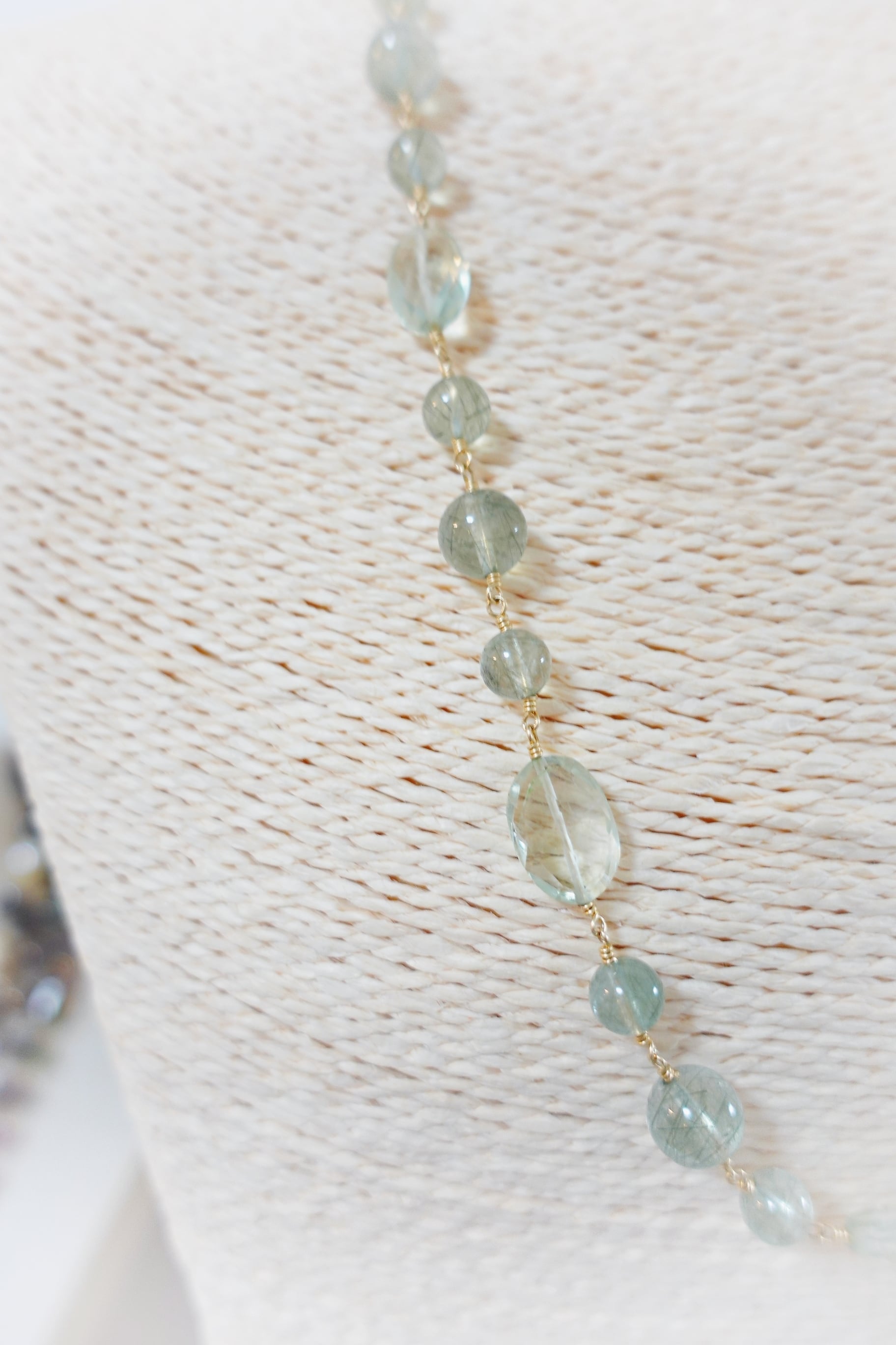 宝石のような煌めきと透明感が美しい、オールグリーンのルチルクォーツロングネックレスとピアスのセットです。