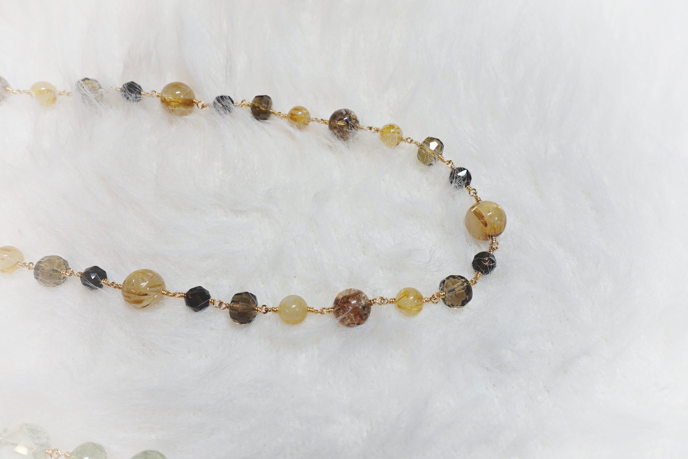 黄金色のルチルクォーツ、茶色のスモーキークォーツに加え、大きめの茶色の石には、なんと、希少なエレスチャルクォーツを使用しています。