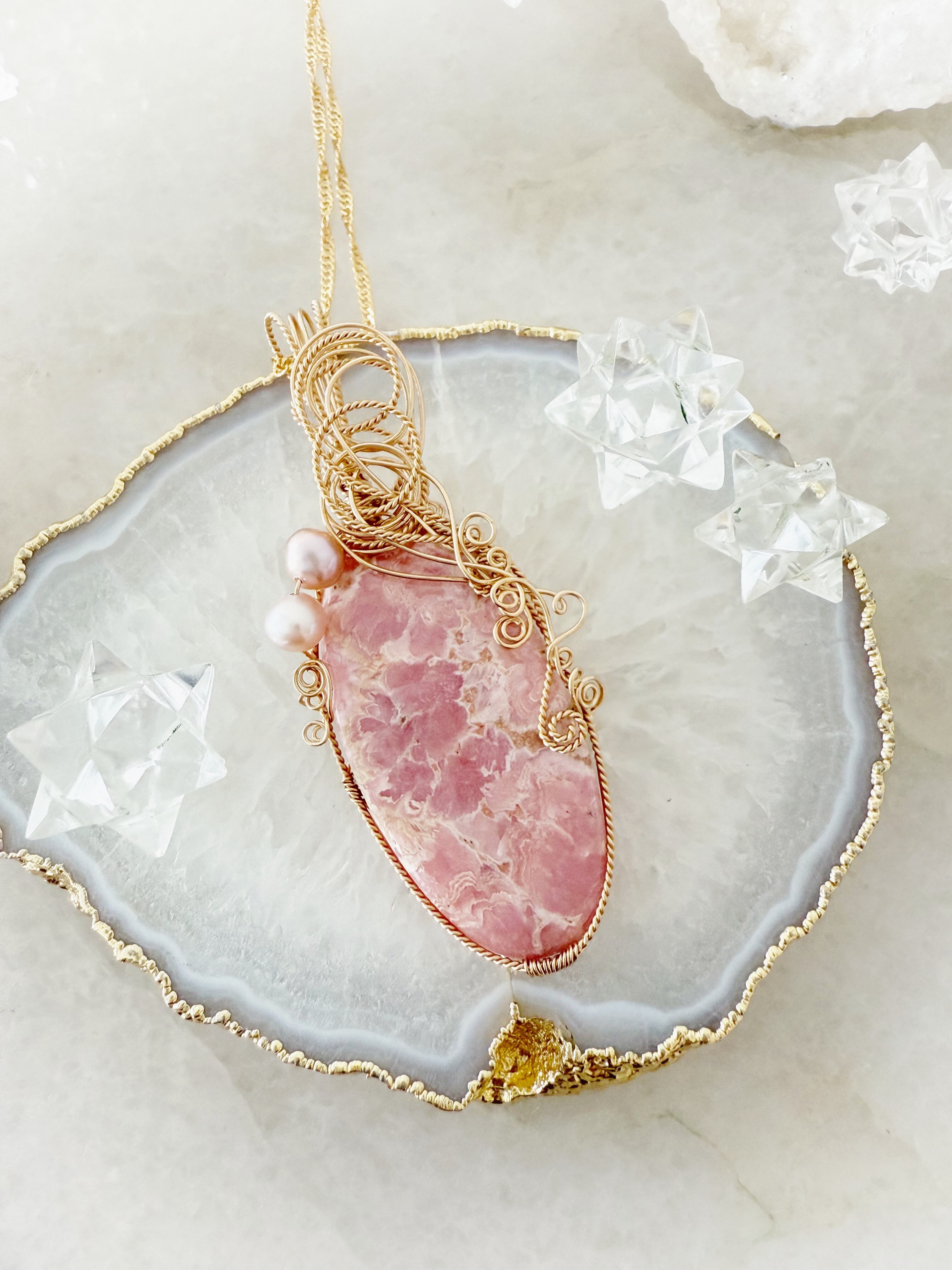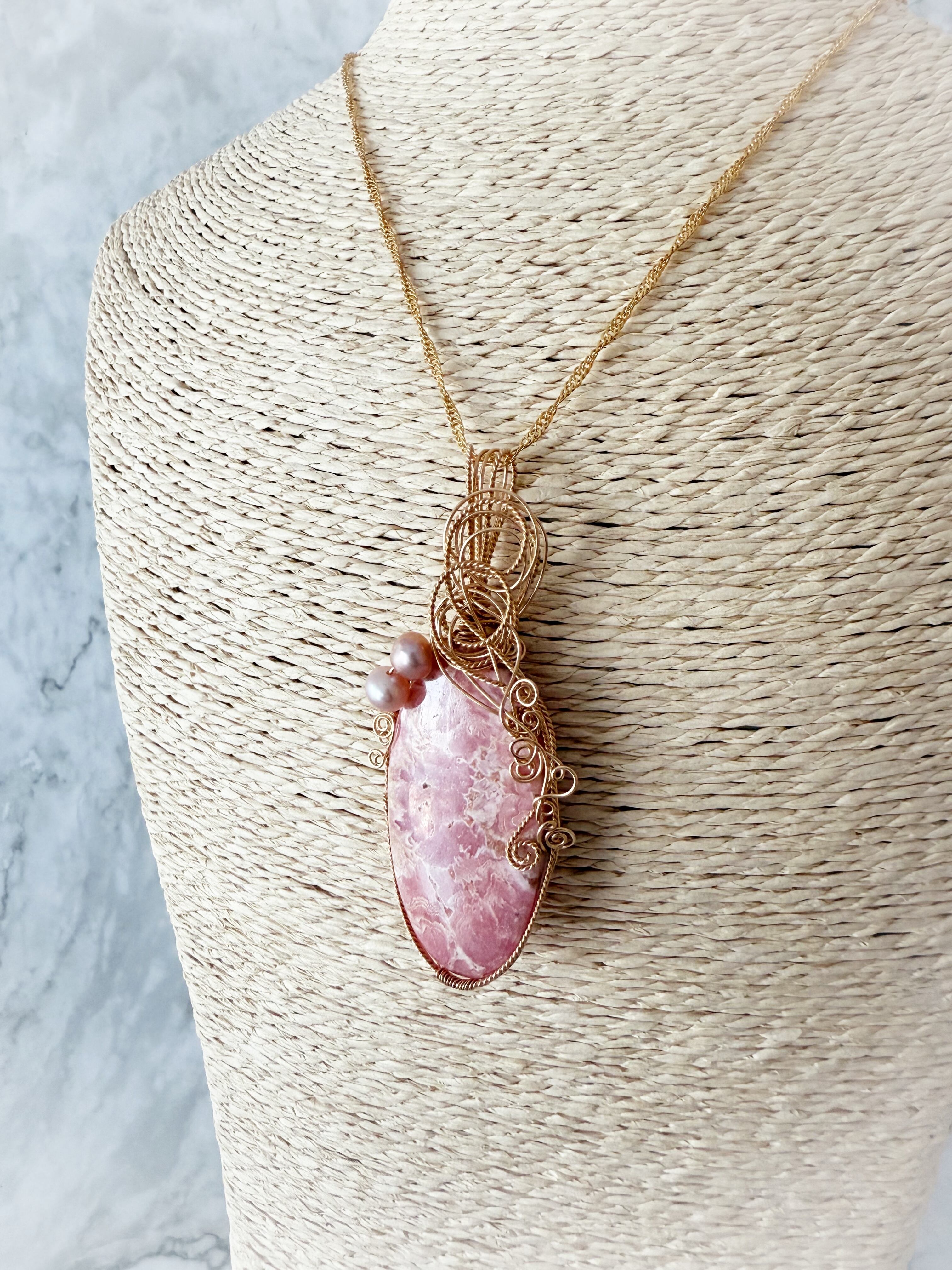 バラを閉じ込めたようなローズピンクの発色が素晴らしい愛の石、ロードクロサイト(インカローズ)の大粒のペンダントです。